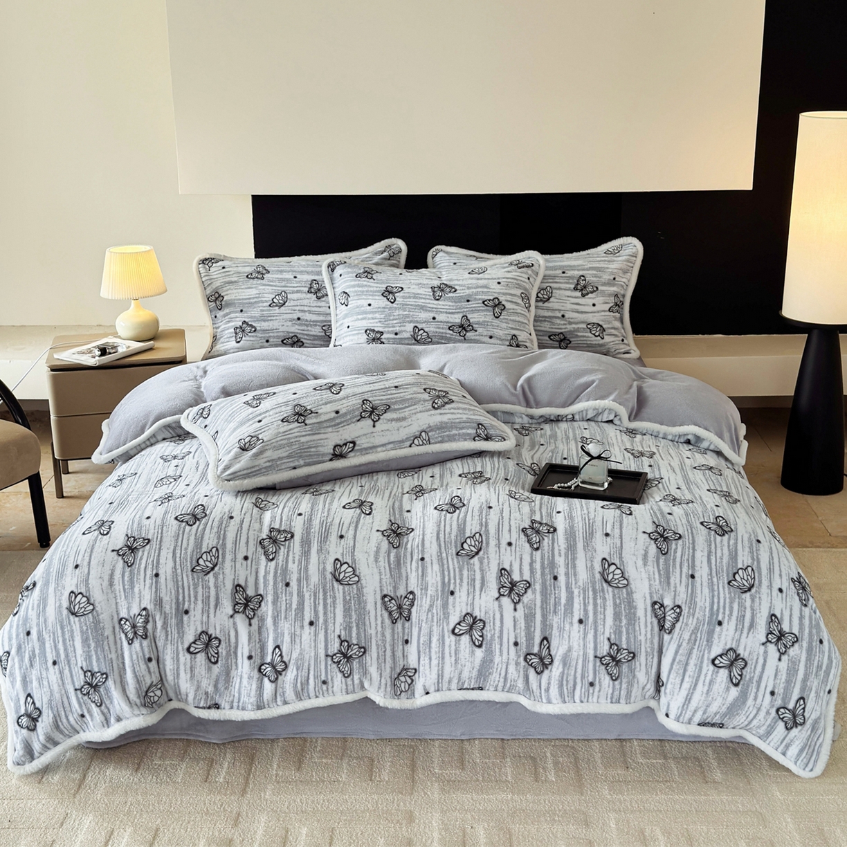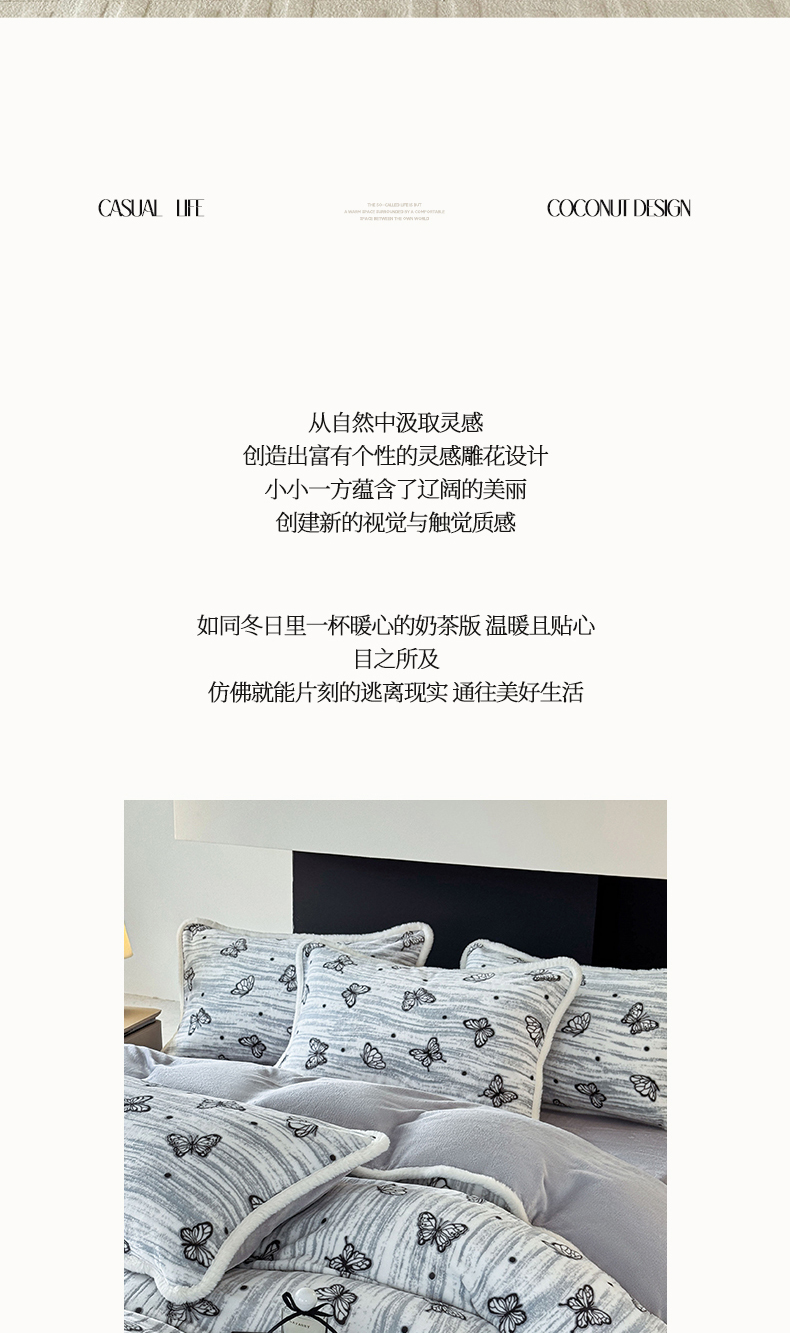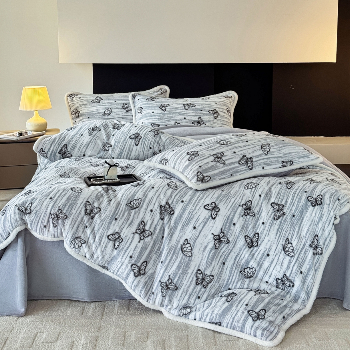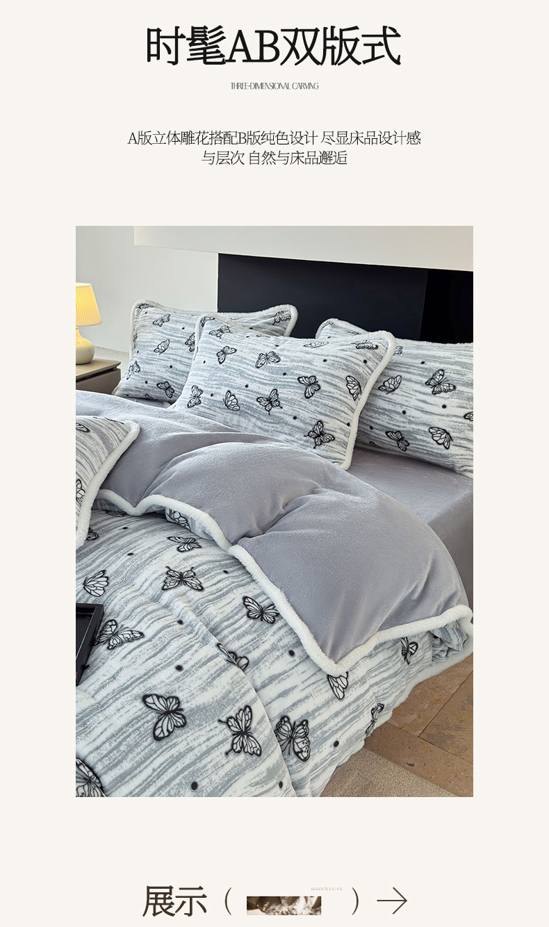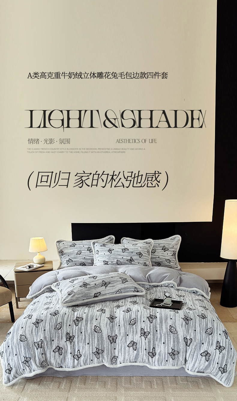 莱登卡奴 2025新款高克重牛奶绒雕花兔毛包边款系列四件套 蝶舞纷飞-银灰