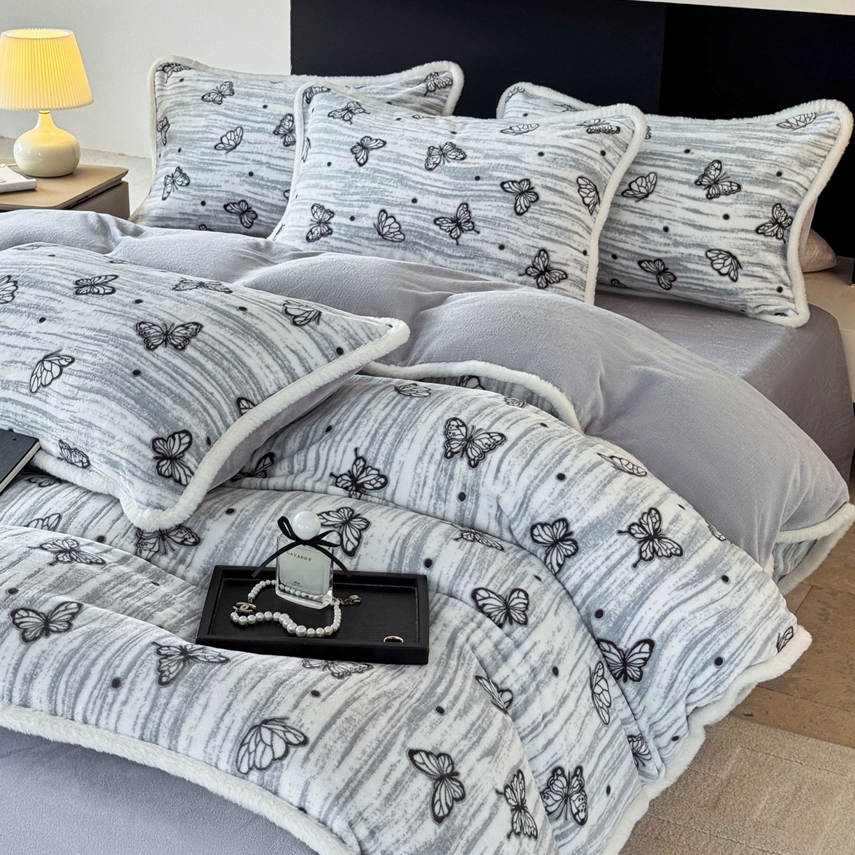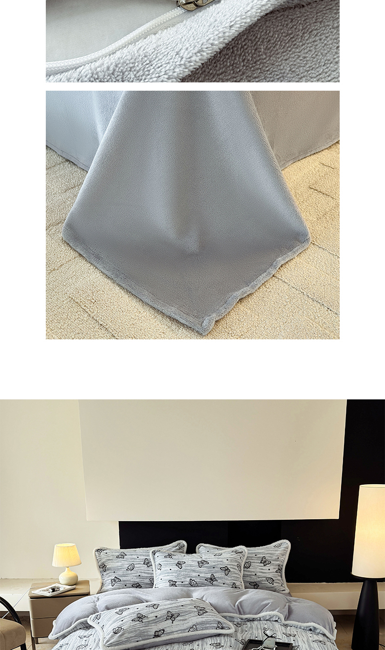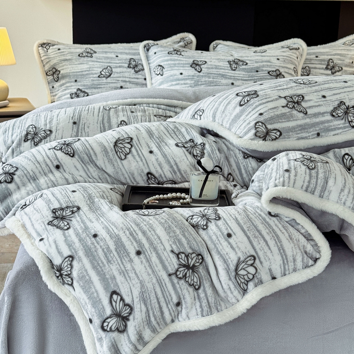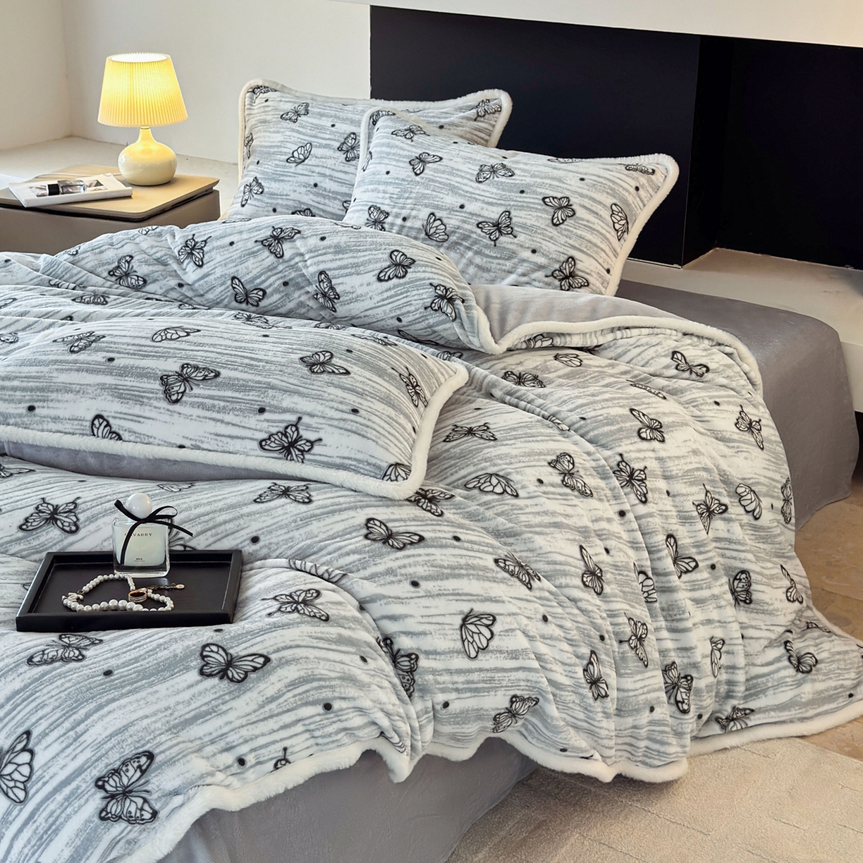 莱登卡奴 2025新款高克重牛奶绒雕花兔毛包边款系列四件套 蝶舞纷飞-银灰