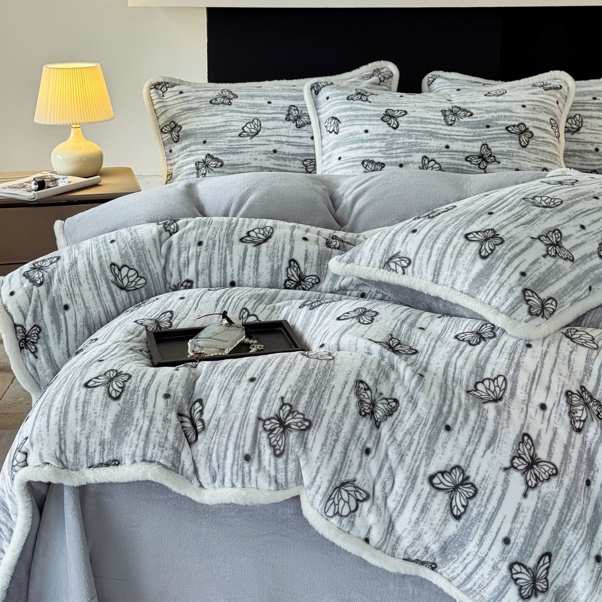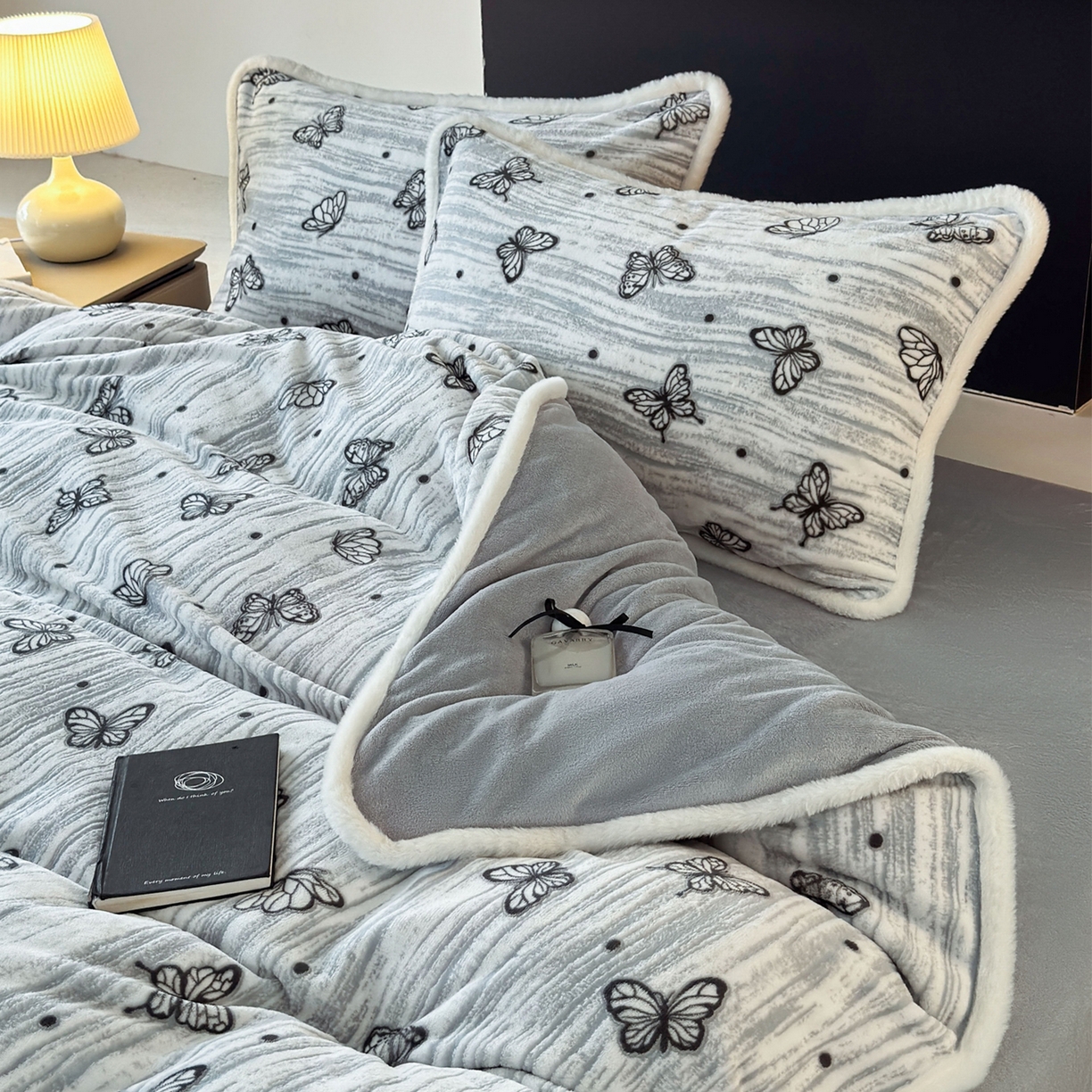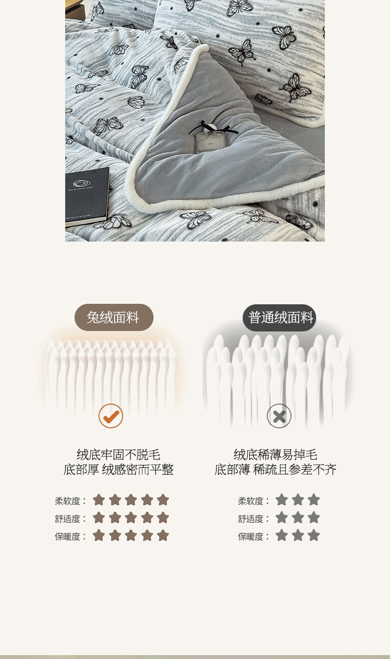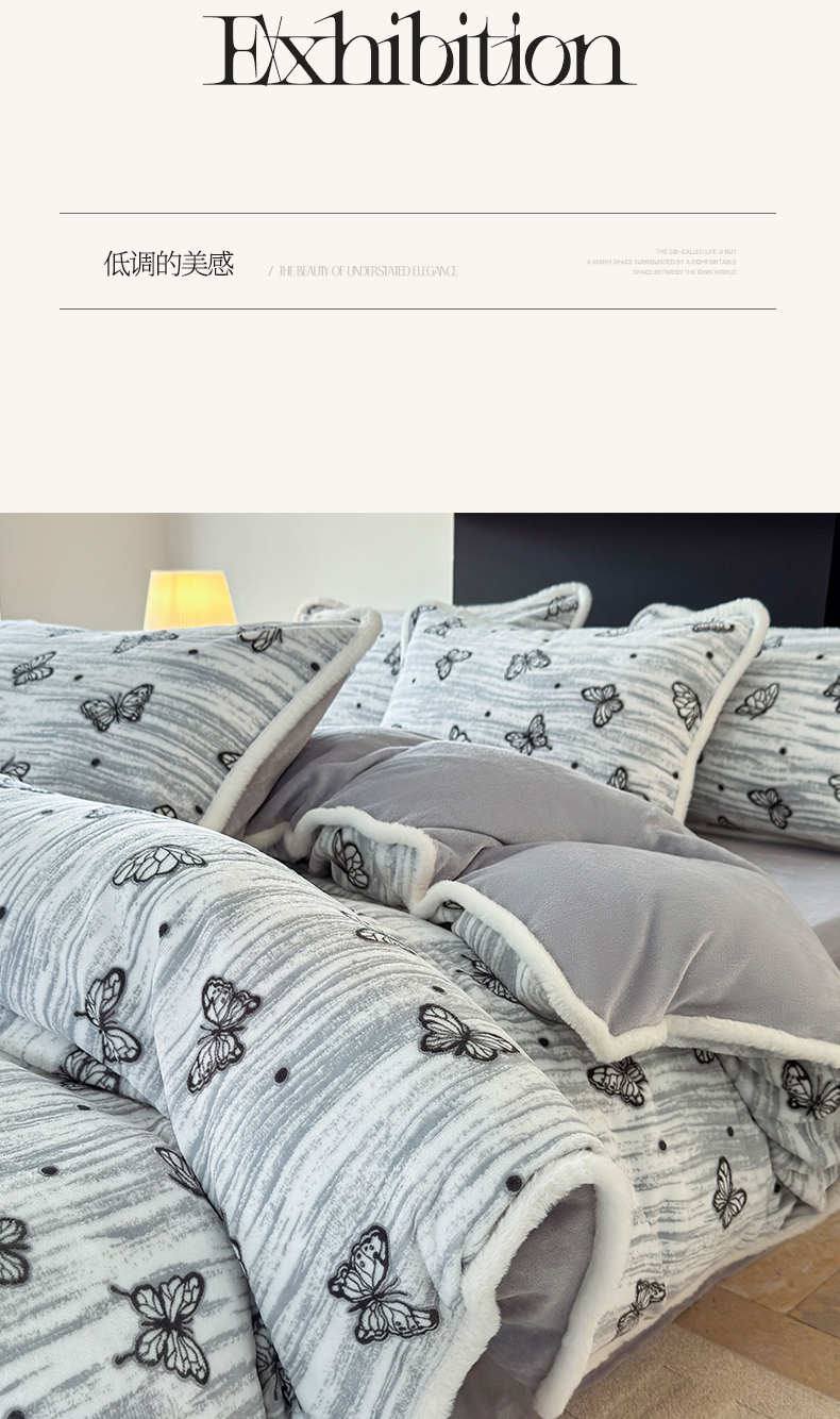 莱登卡奴 2025新款高克重牛奶绒雕花兔毛包边款系列四件套 蝶舞纷飞-银灰