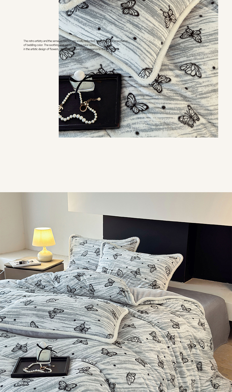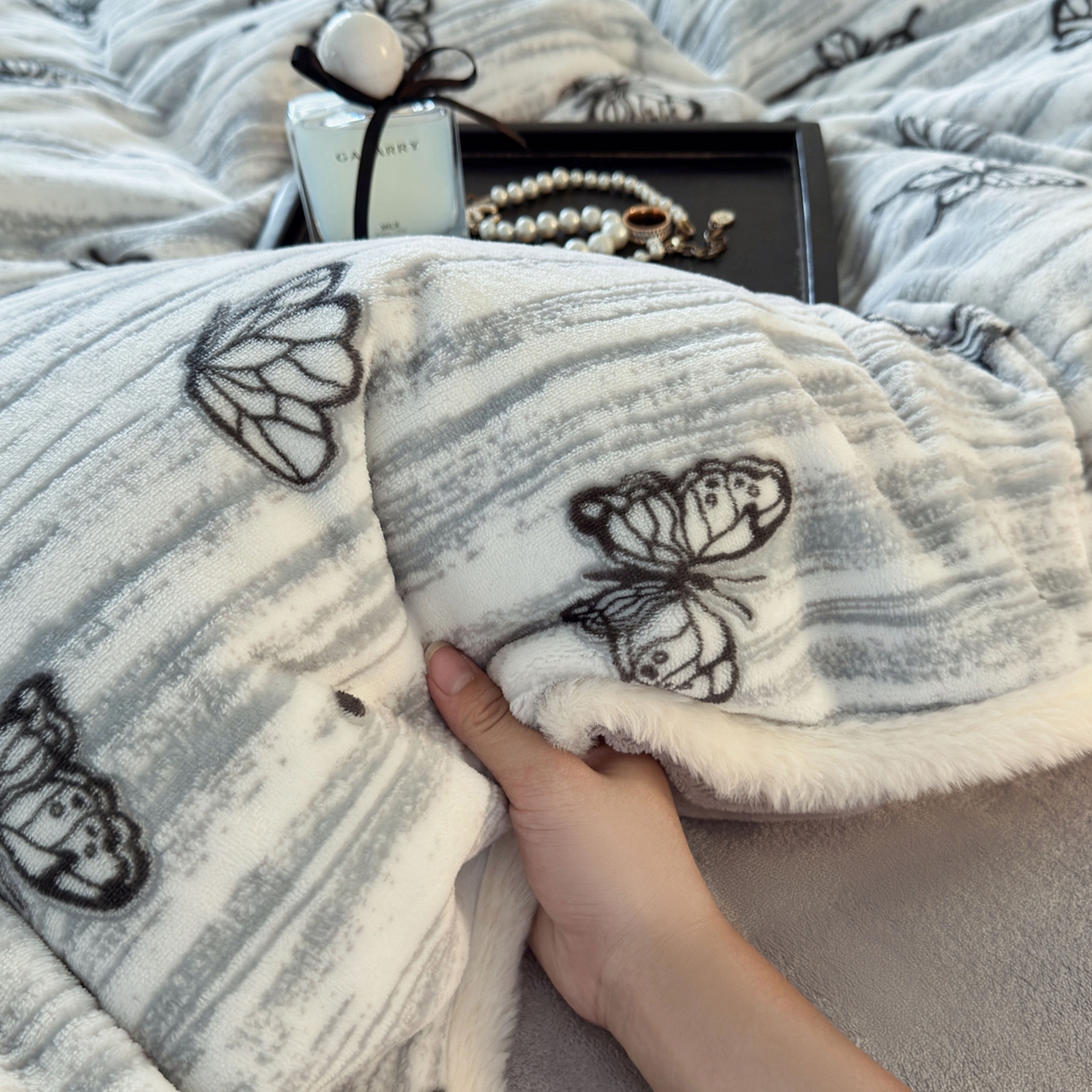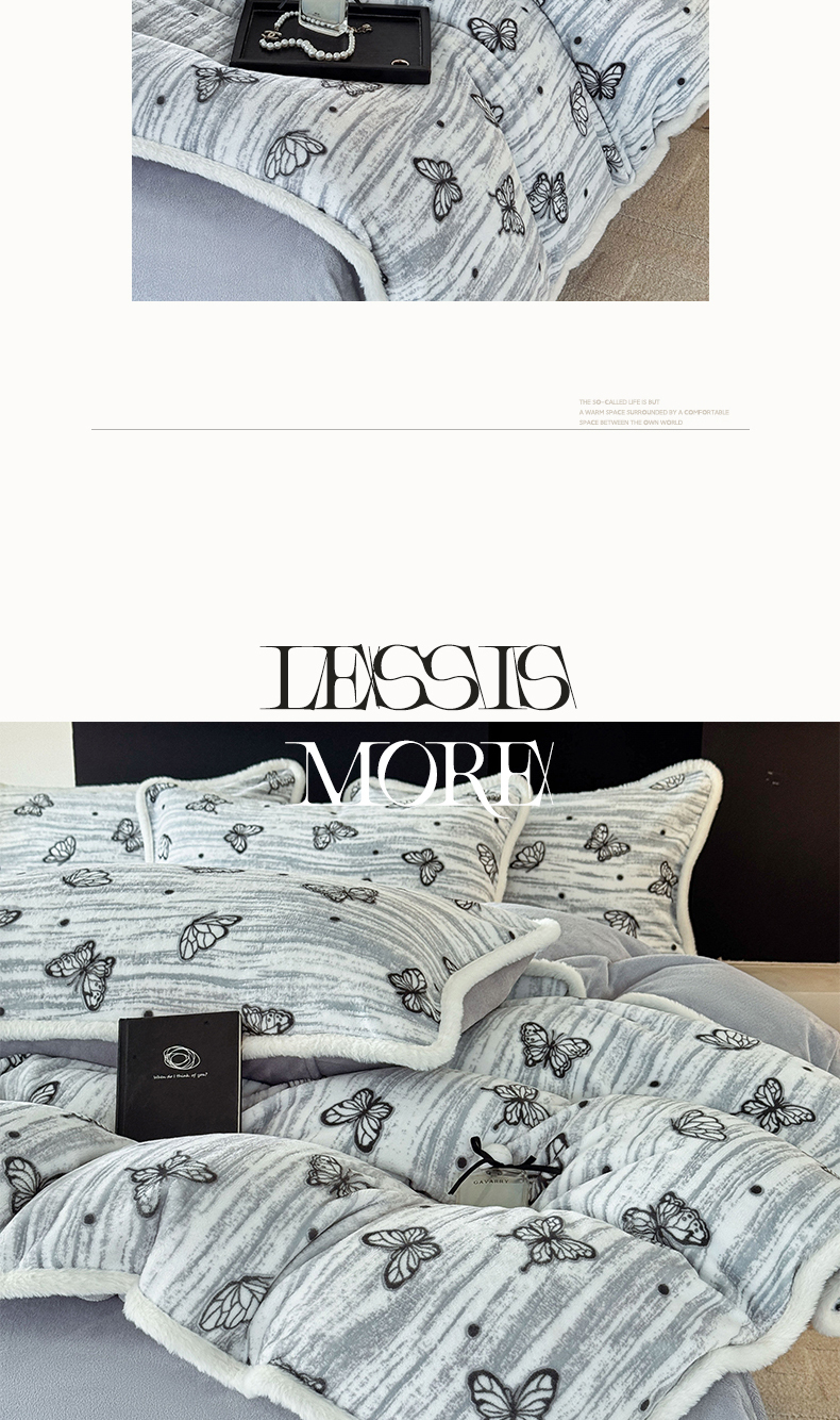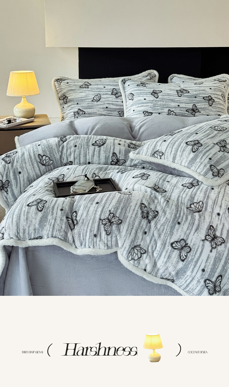 > 莱登卡奴 2025新款高克重牛奶绒雕花兔毛包边款系列四件套 蝶舞纷飞-银灰