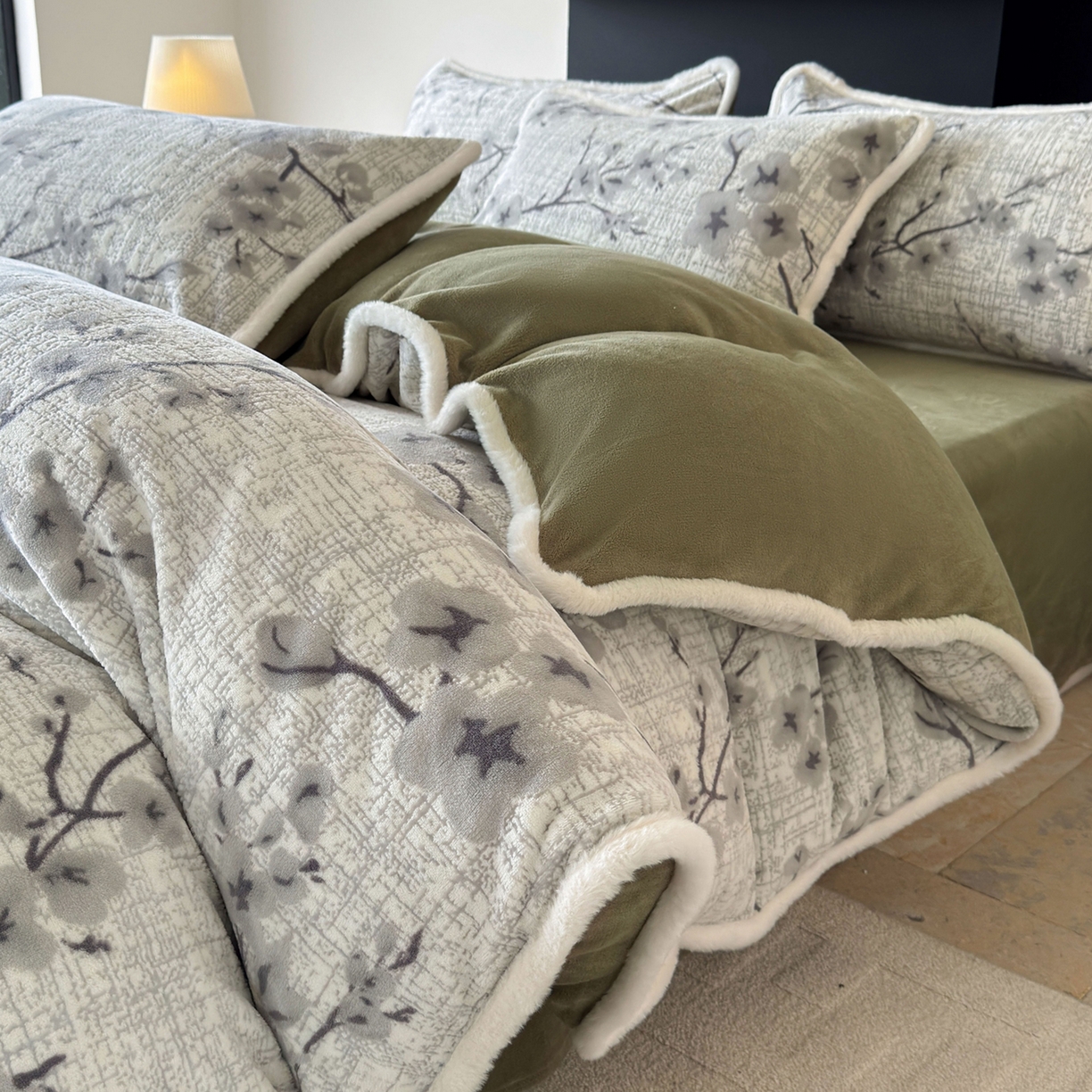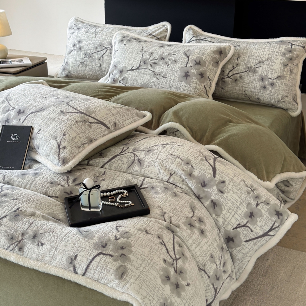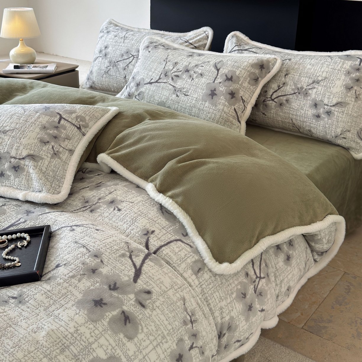 > 莱登卡奴 2025新款高克重牛奶绒雕花兔毛包边款系列四件套 琳瑜陌语-绿