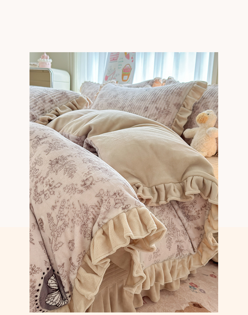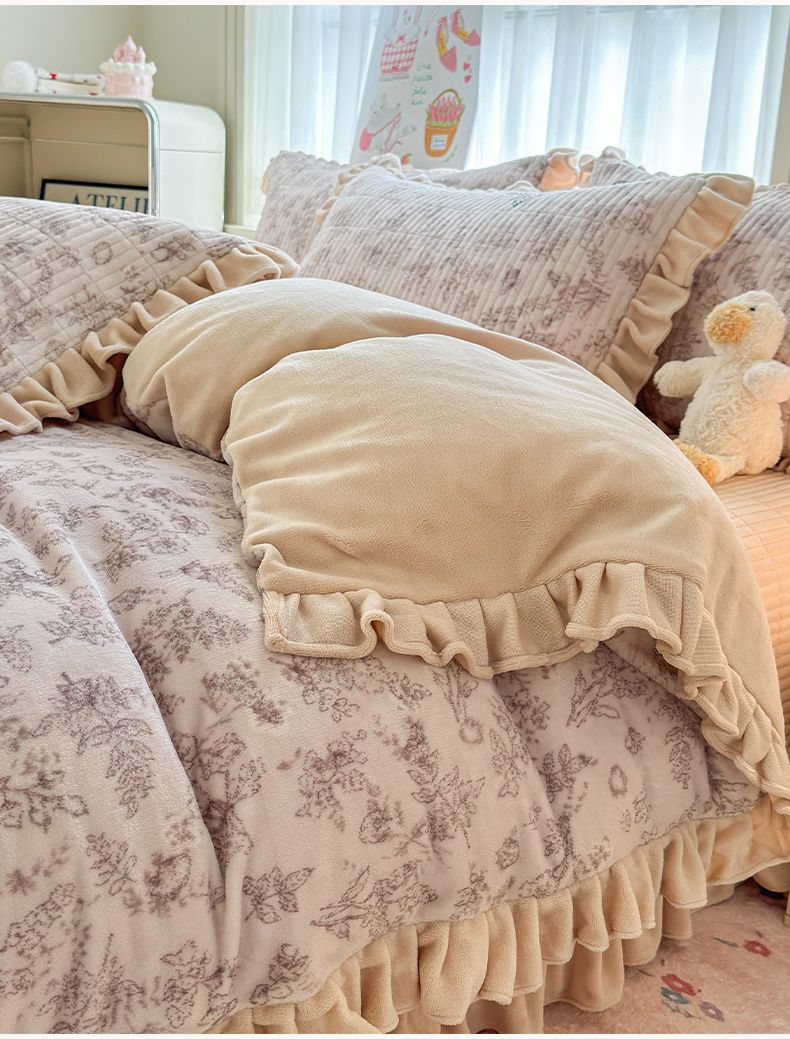 > 莱登卡奴 2025新款高克重牛奶绒花边床盖款系列四件套 朝颜奶杏