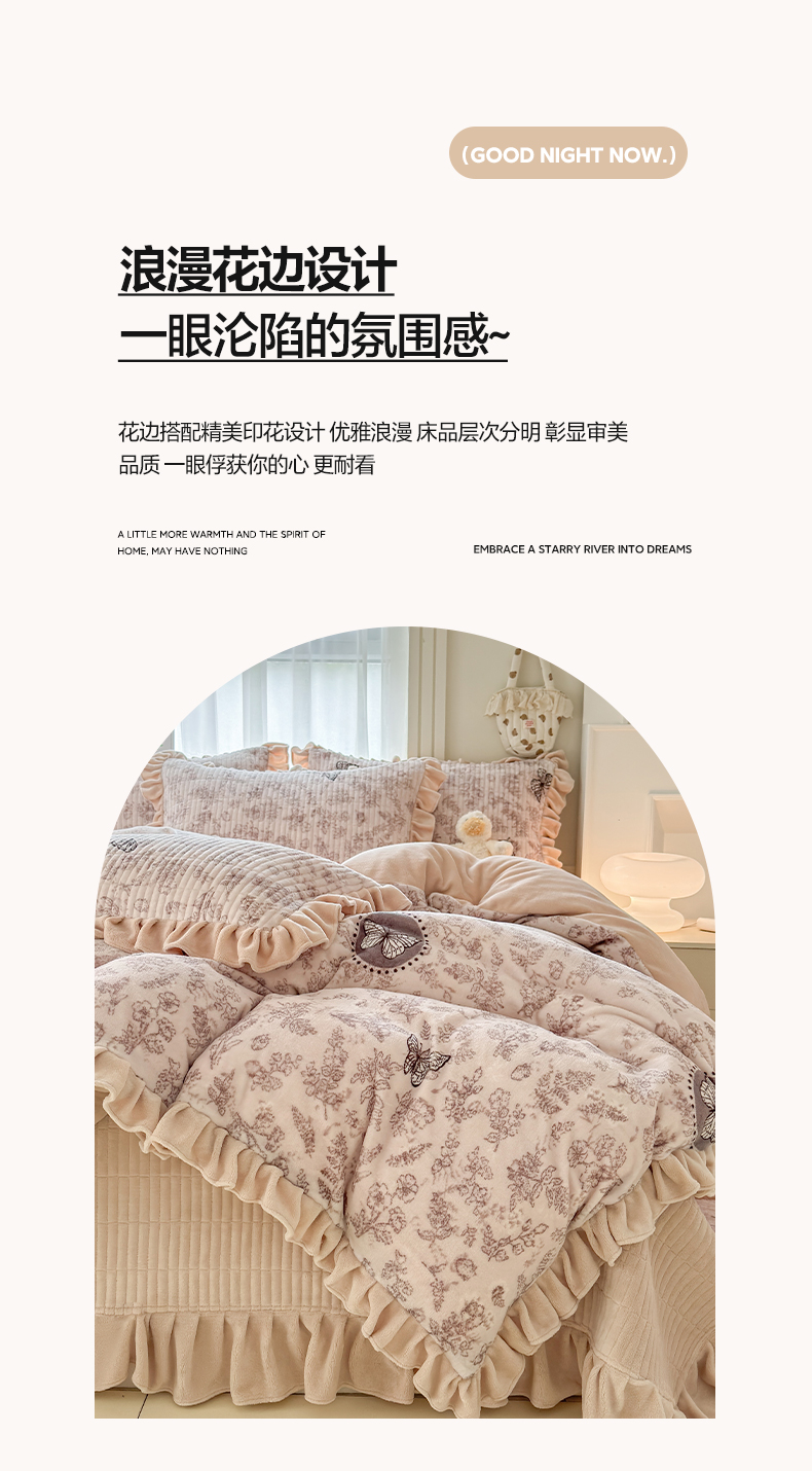 莱登卡奴 2025新款高克重牛奶绒花边床盖款系列四件套 朝颜奶杏