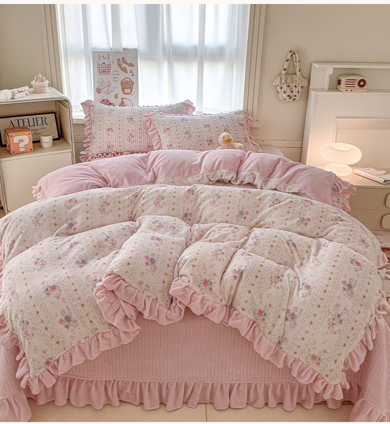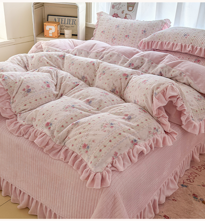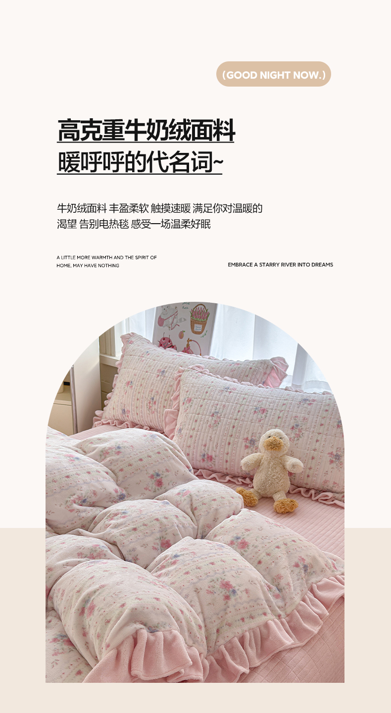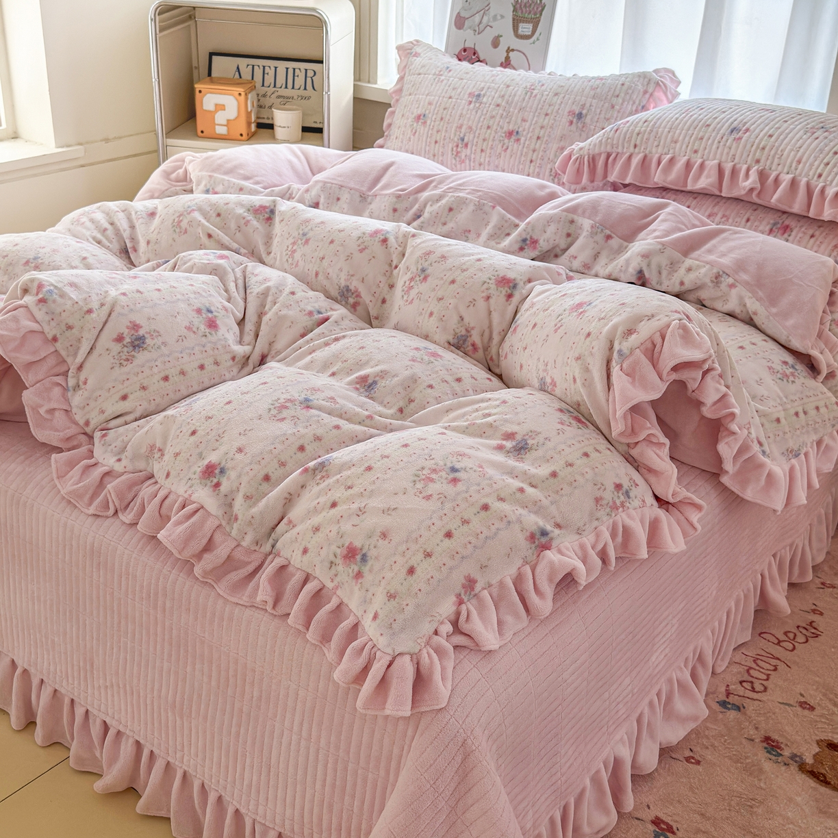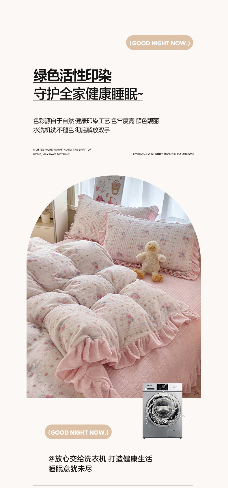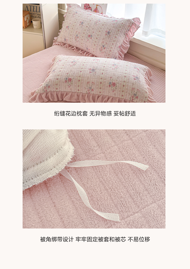 > 莱登卡奴 2025新款高克重牛奶绒花边床盖款系列四件套 花枝俏粉