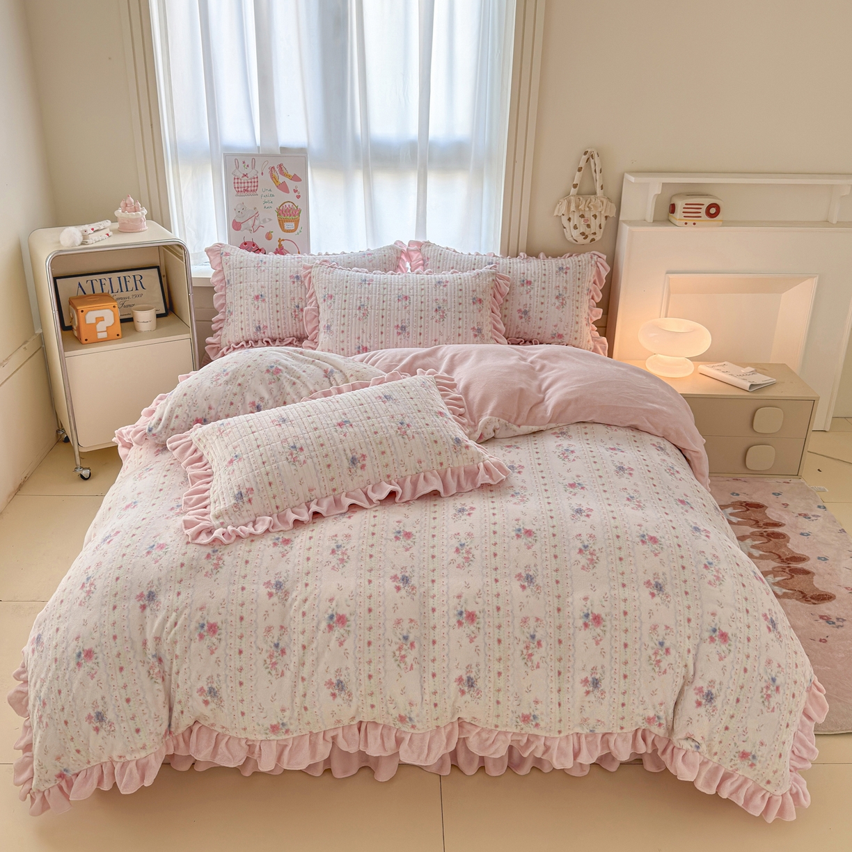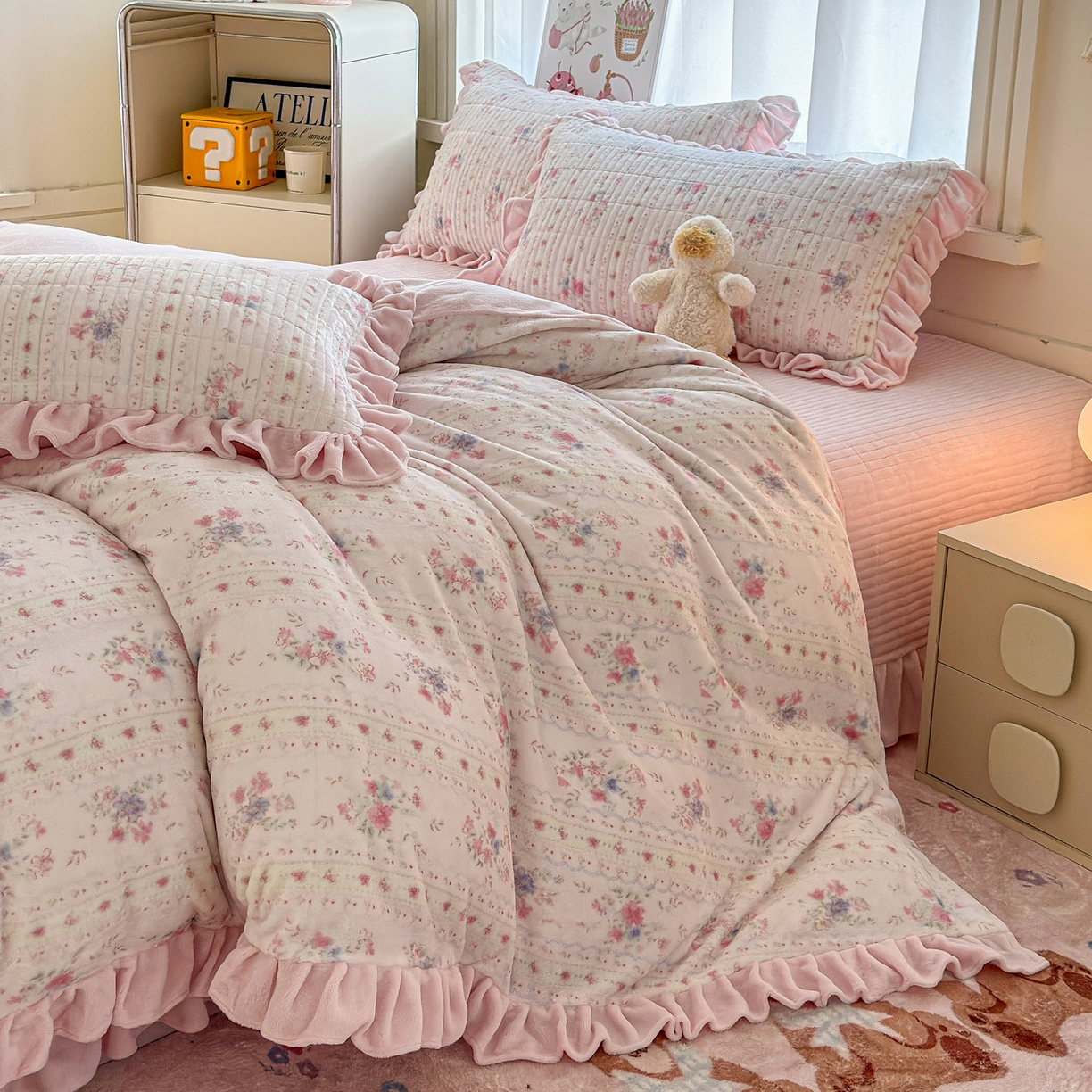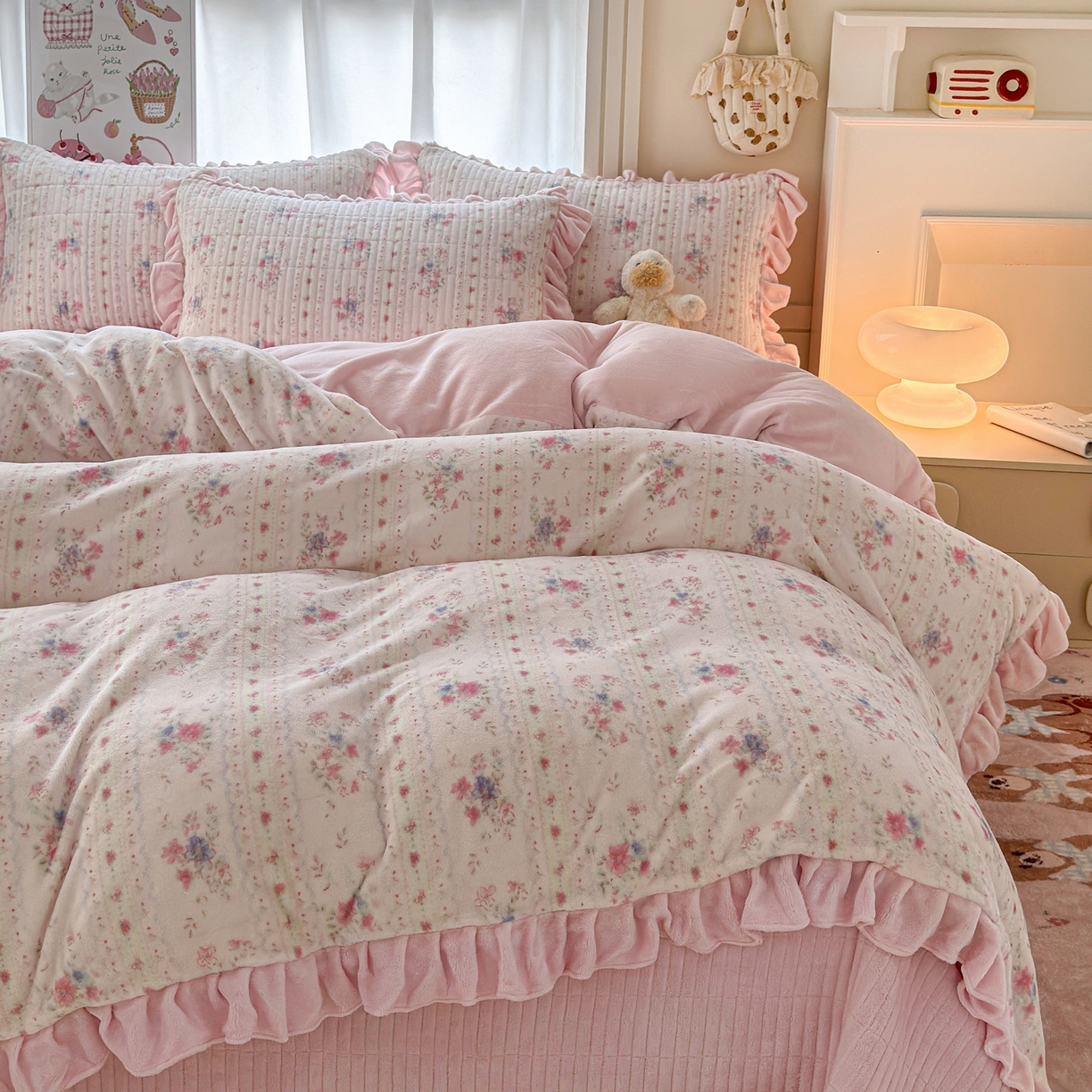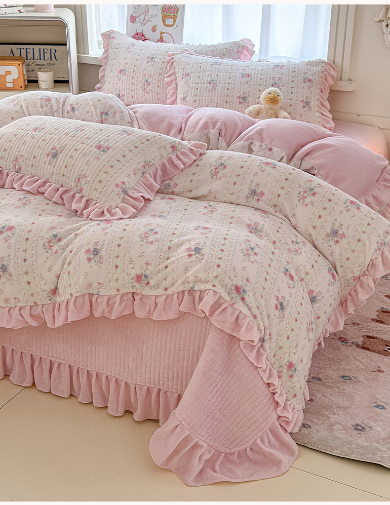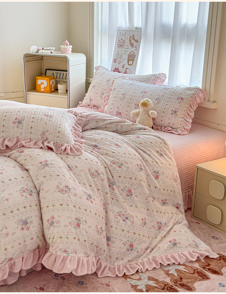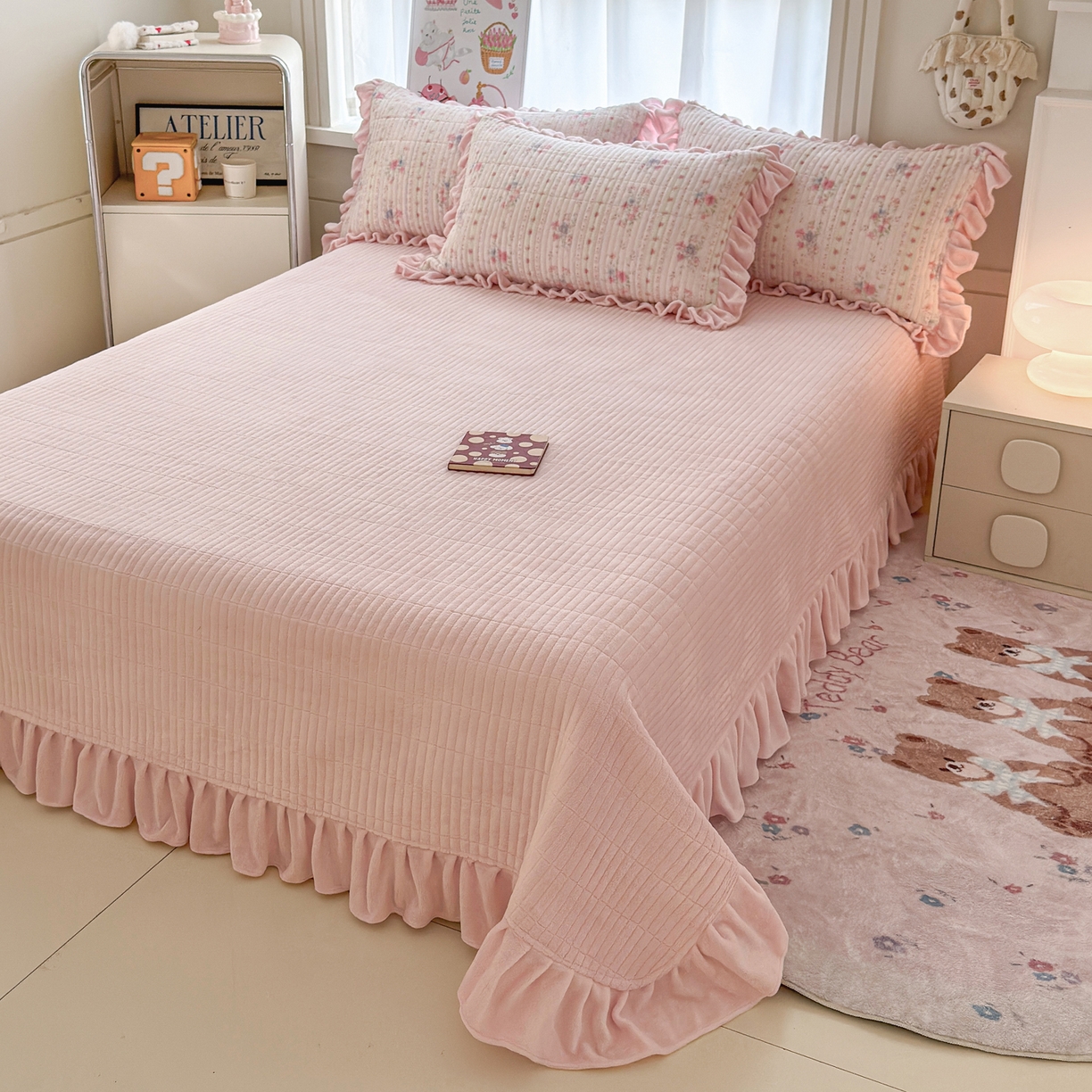 > 莱登卡奴 2025新款高克重牛奶绒花边床盖款系列四件套 花枝俏粉