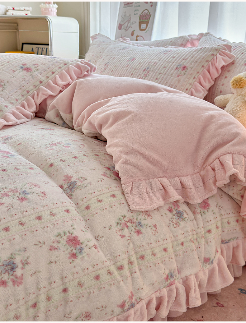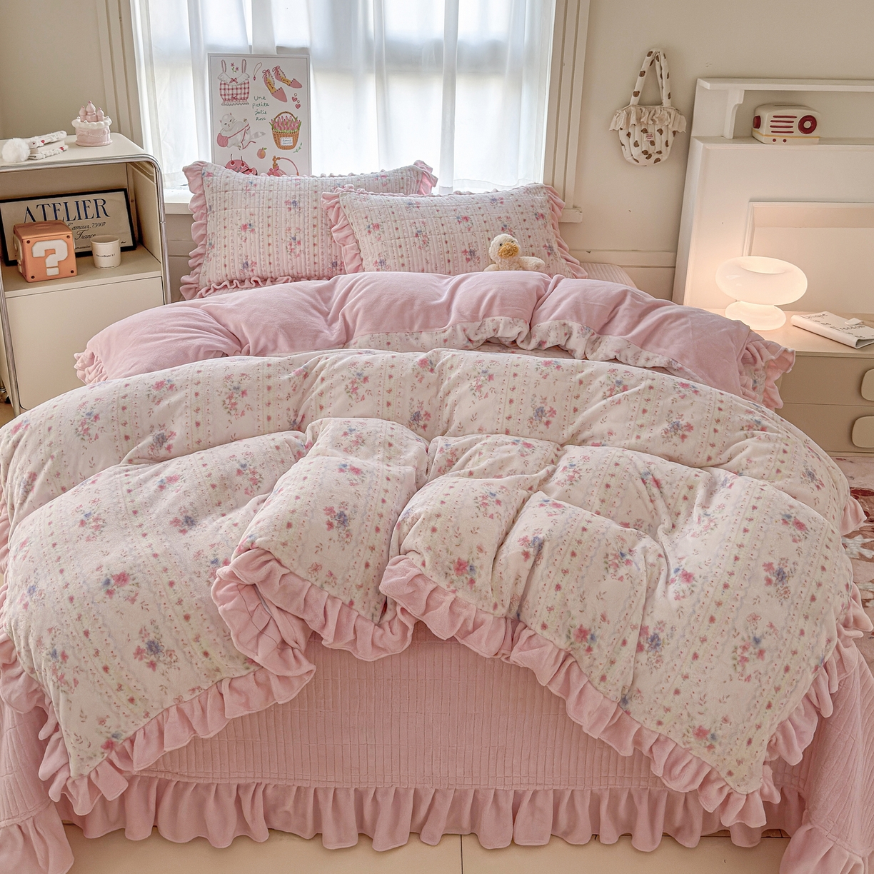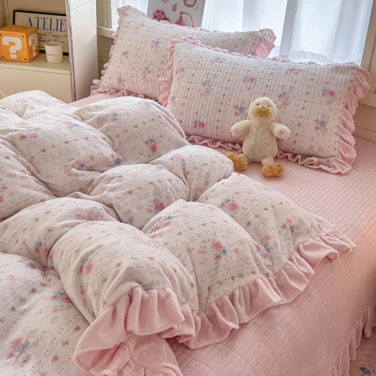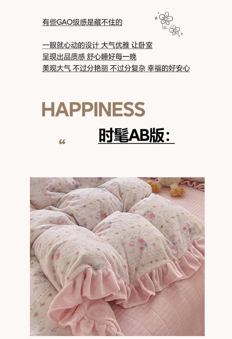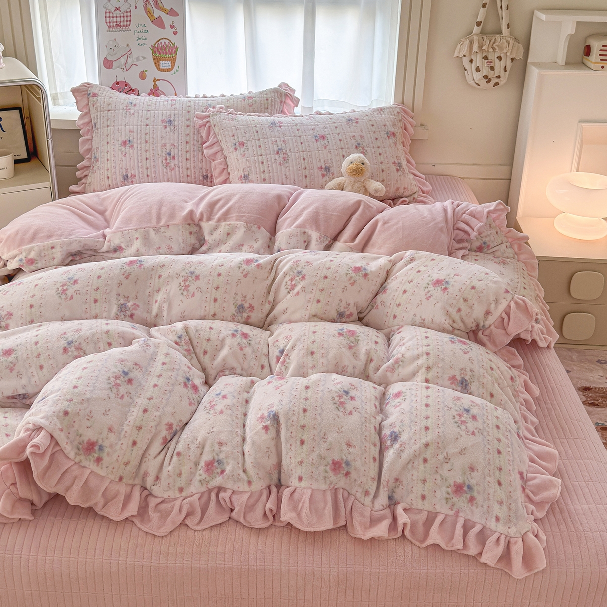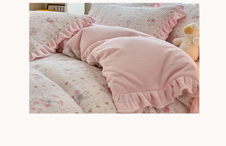 > 莱登卡奴 2025新款高克重牛奶绒花边床盖款系列四件套 花枝俏粉