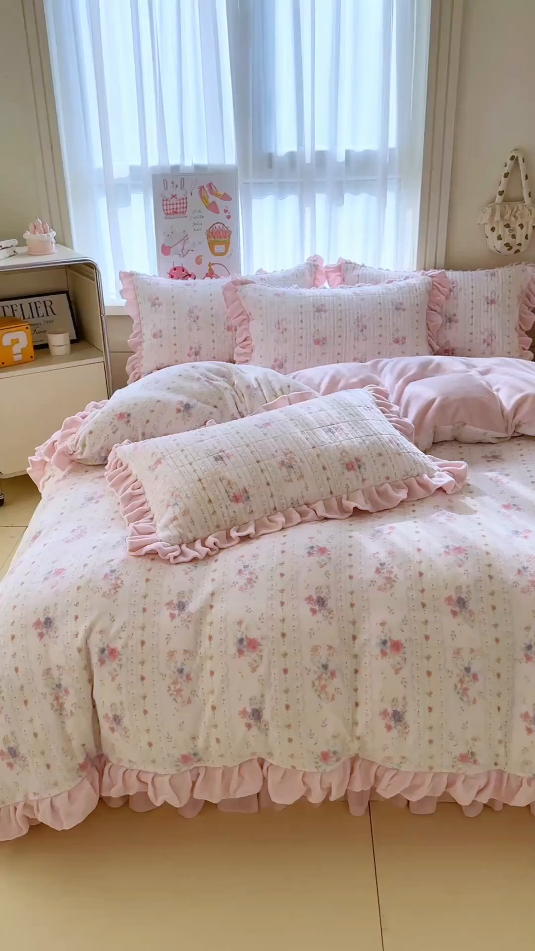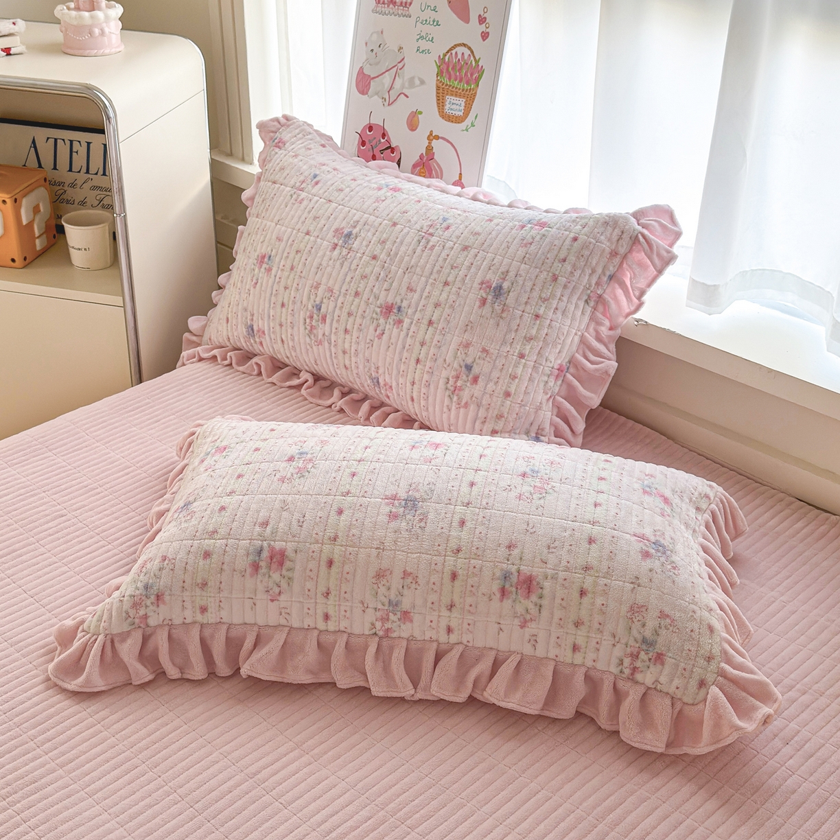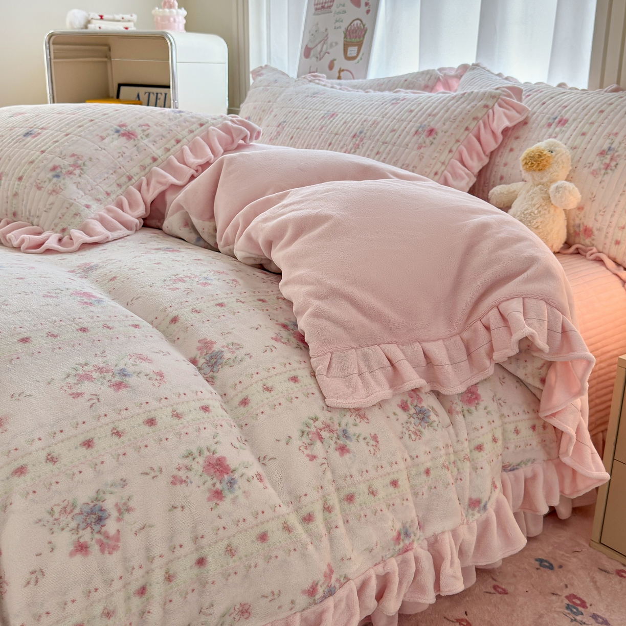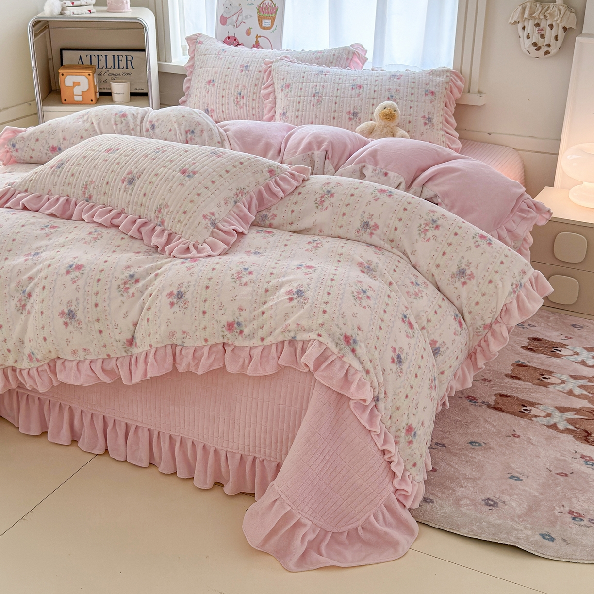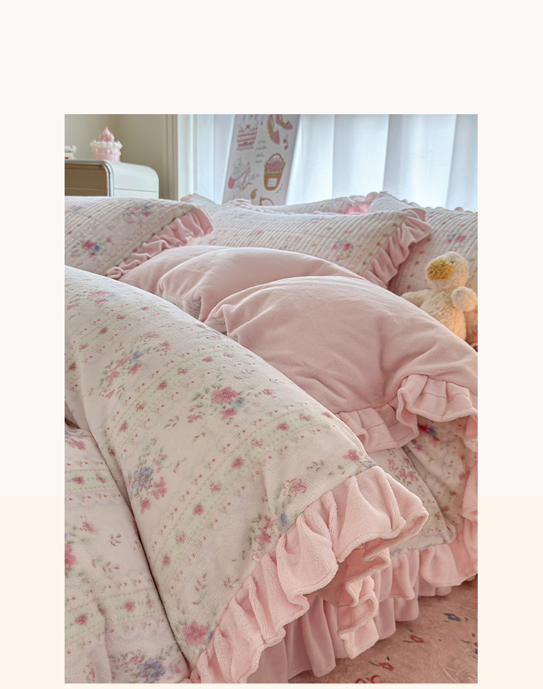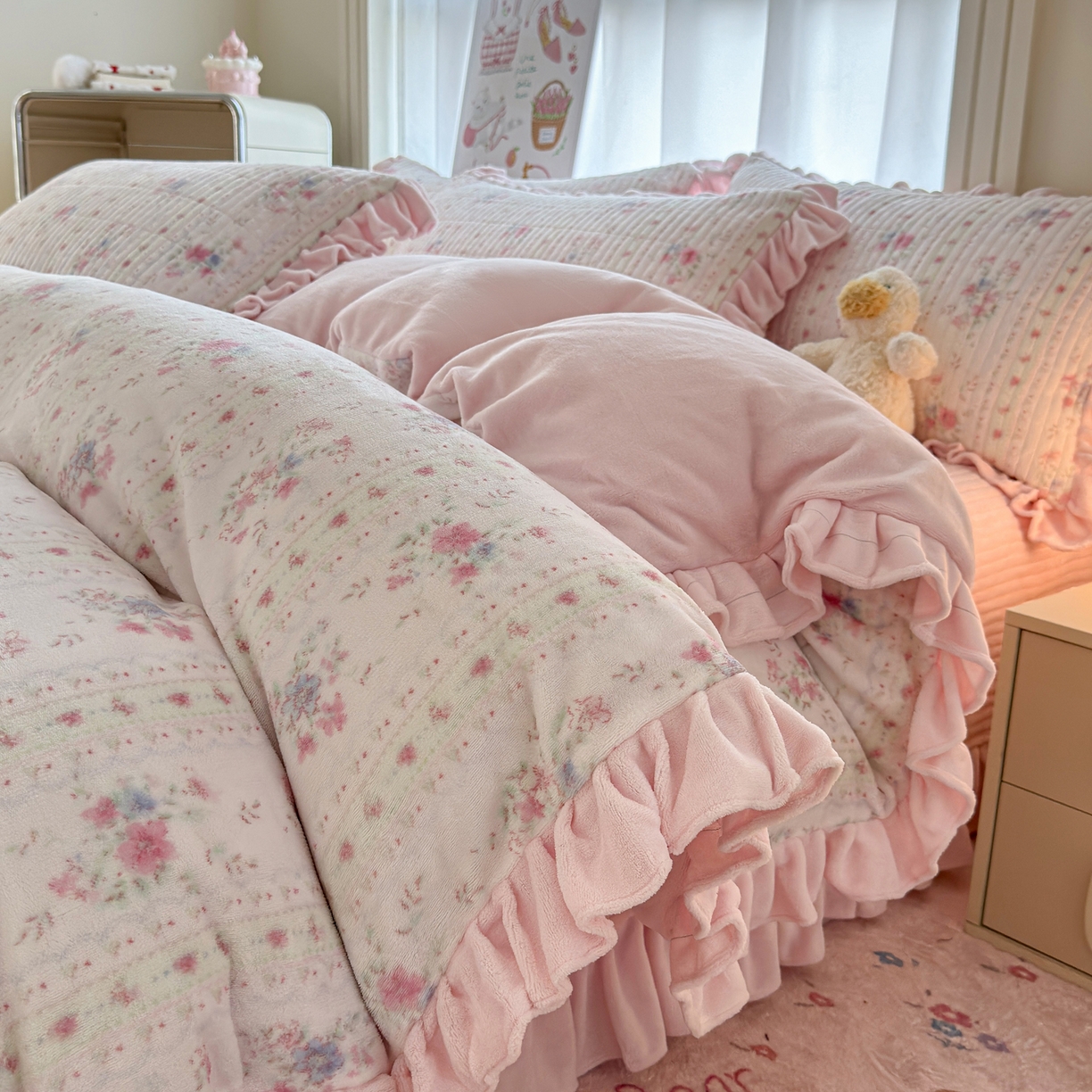 > 莱登卡奴 2025新款高克重牛奶绒花边床盖款系列四件套 花枝俏粉