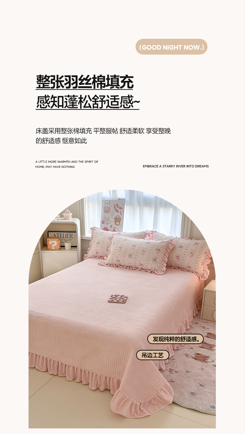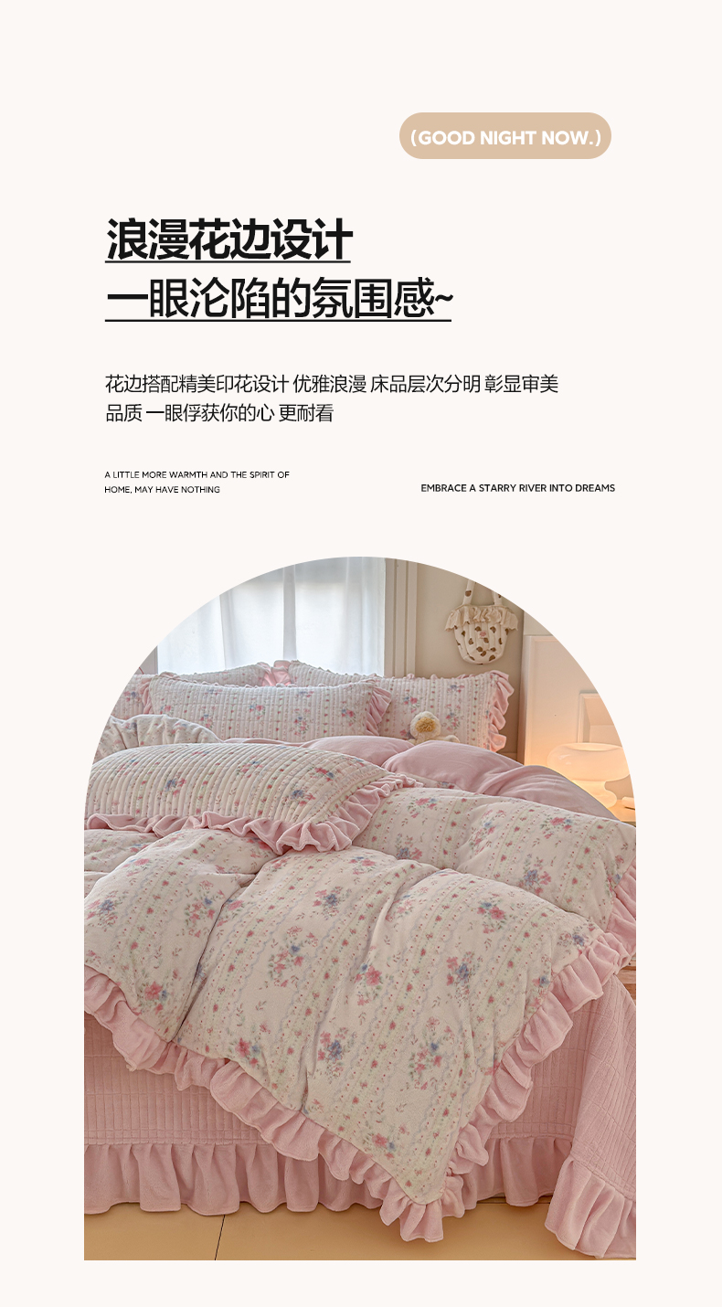 莱登卡奴 2025新款高克重牛奶绒花边床盖款系列四件套 花枝俏粉