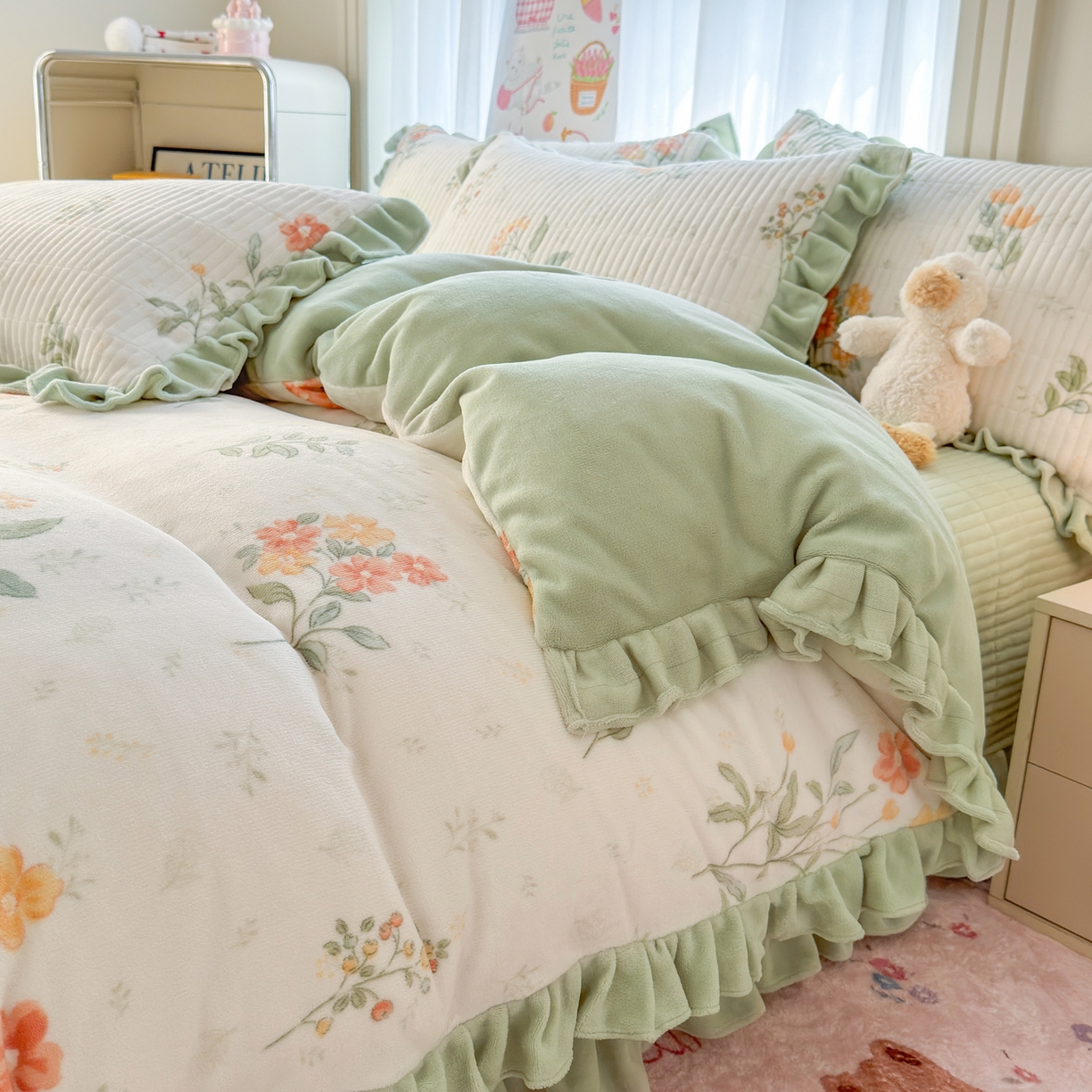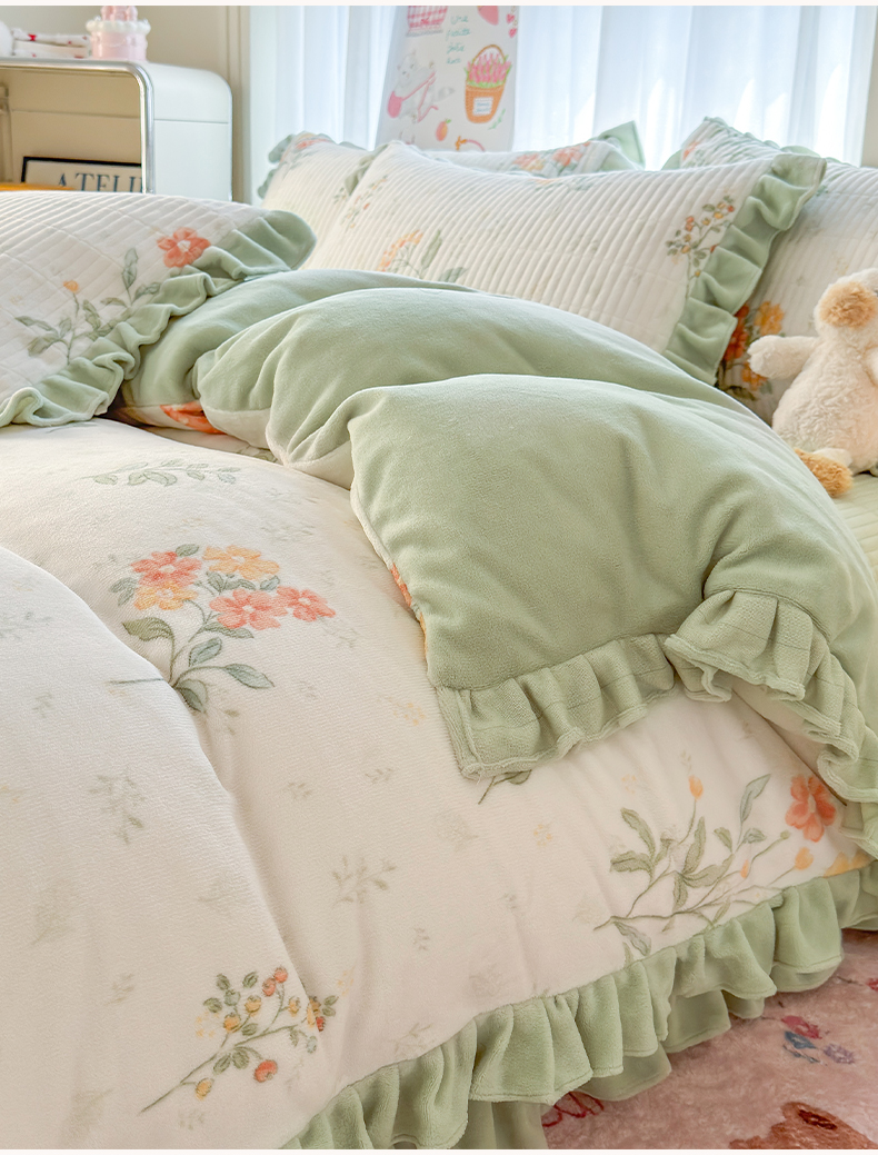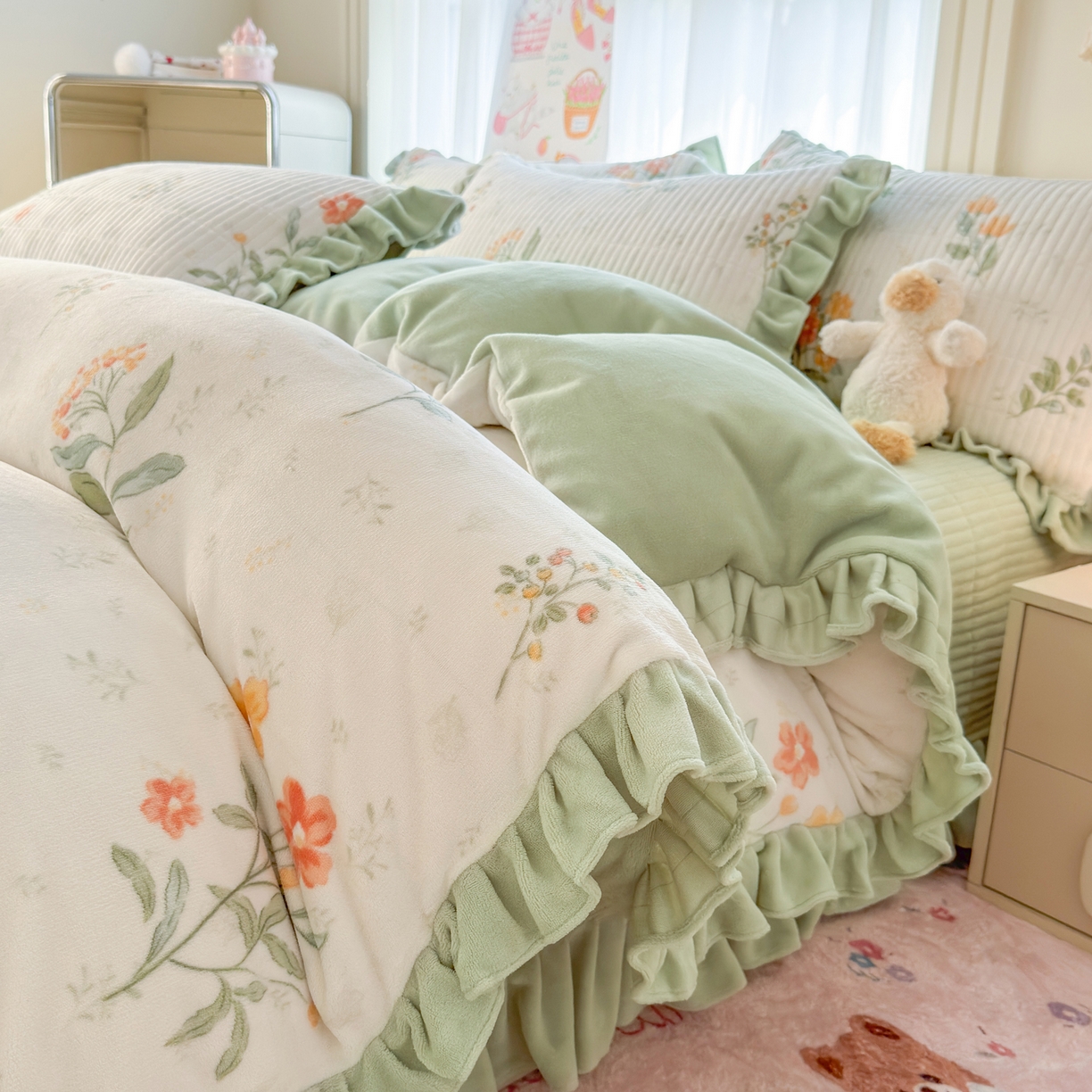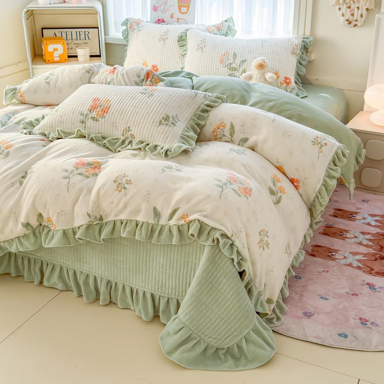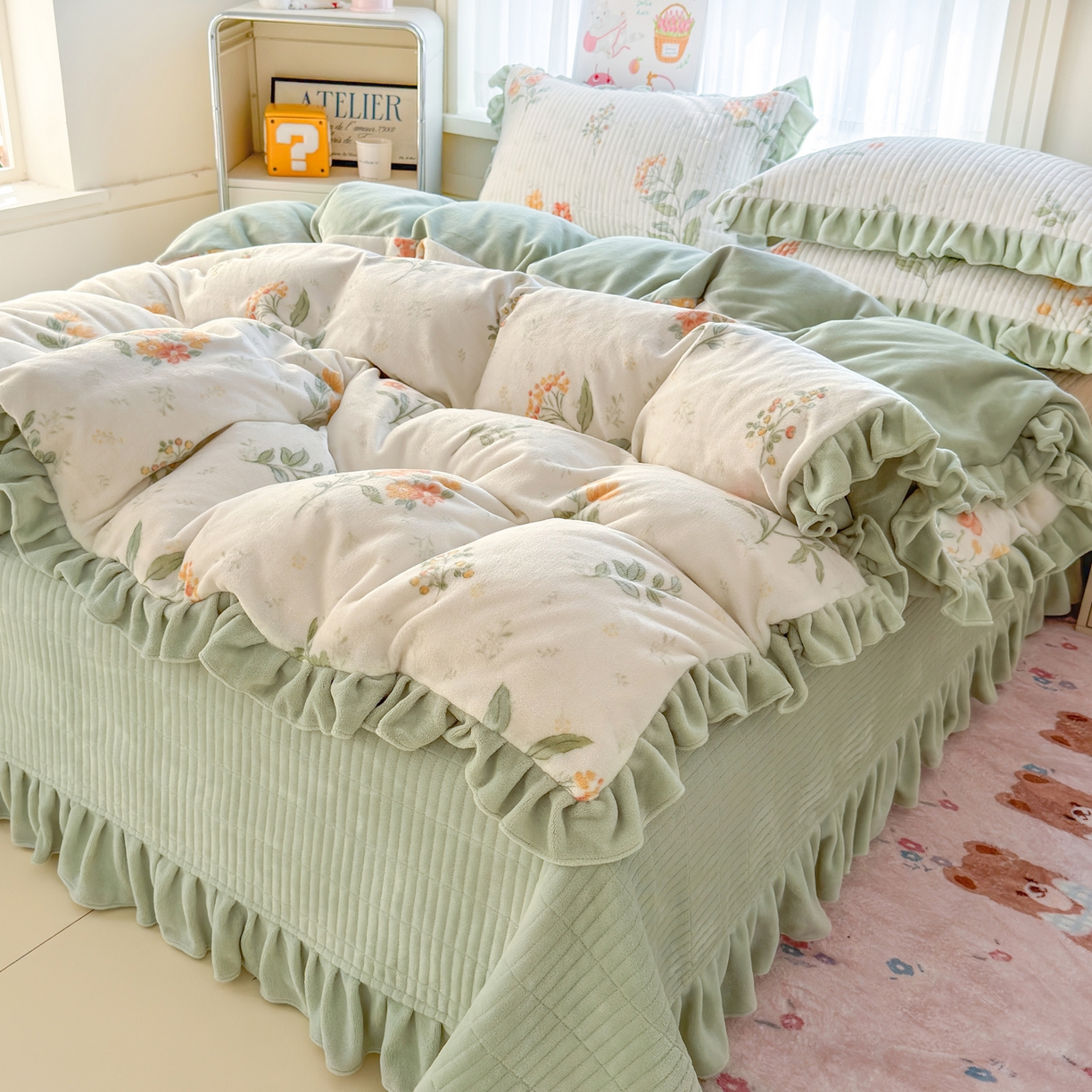 > 莱登卡奴 2025新款高克重牛奶绒花边床盖款系列四件套 奇异花朵绿