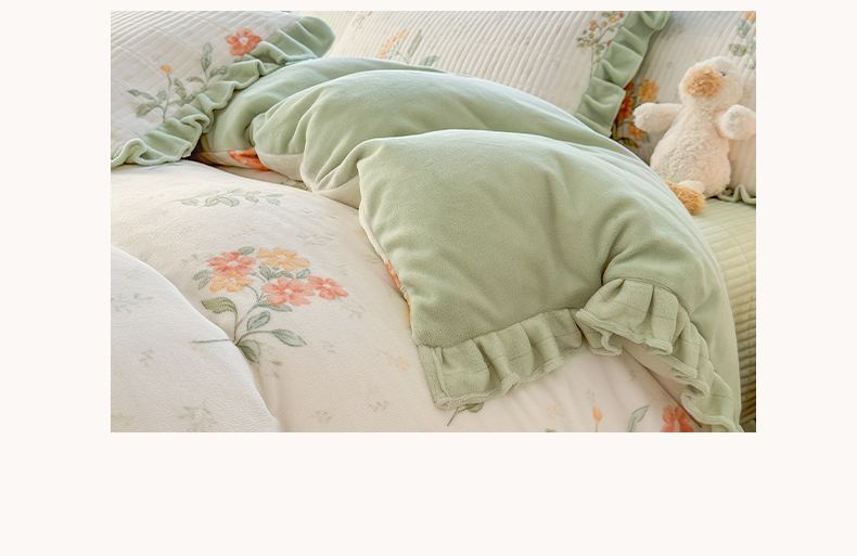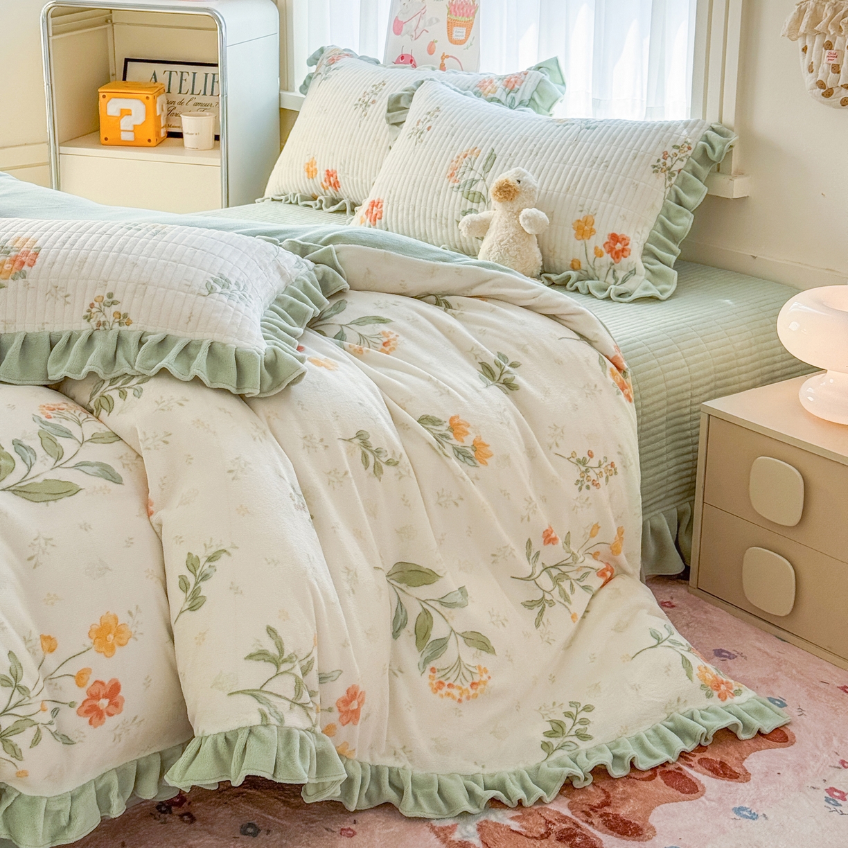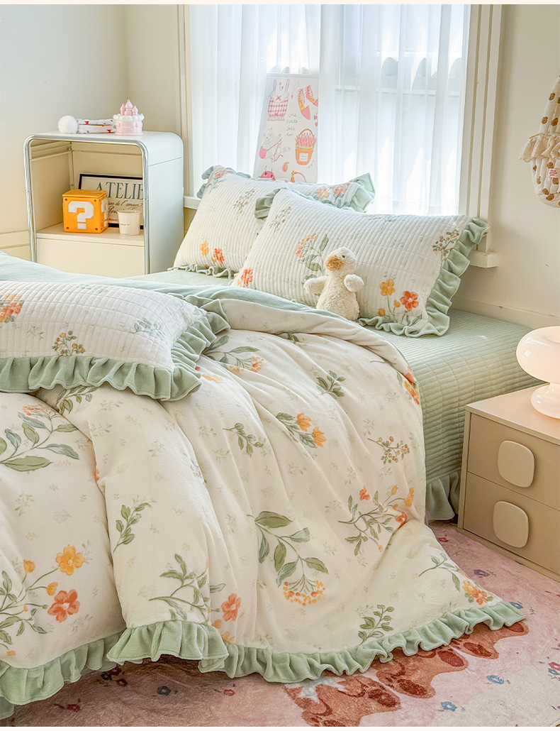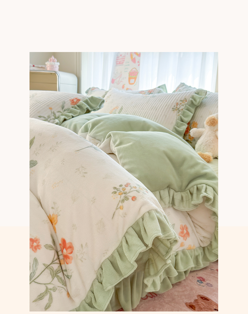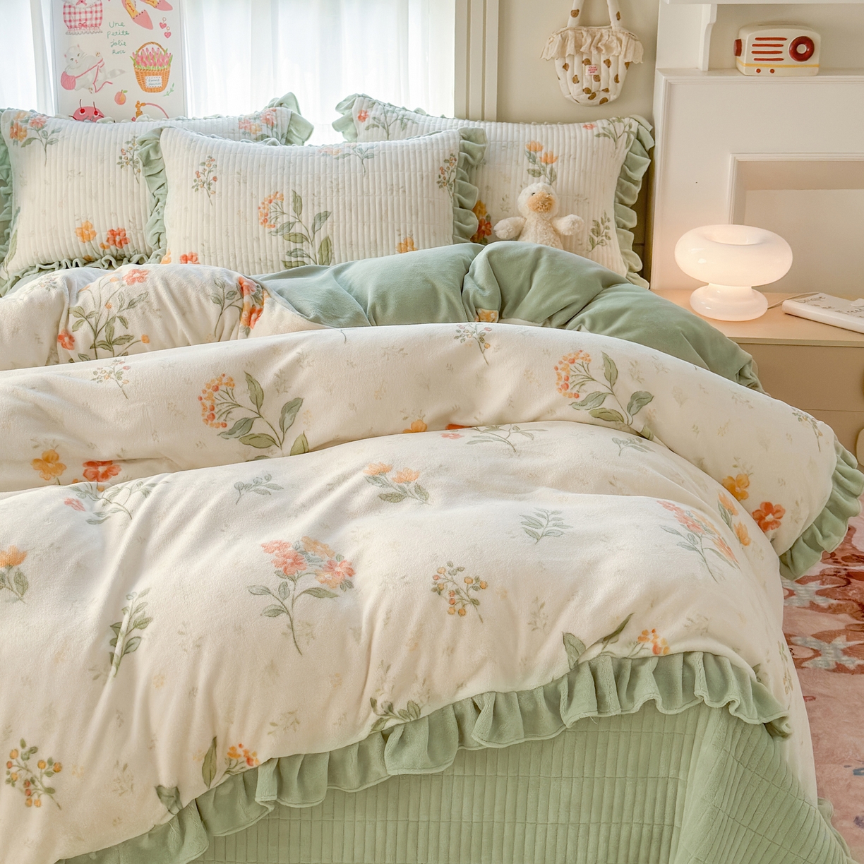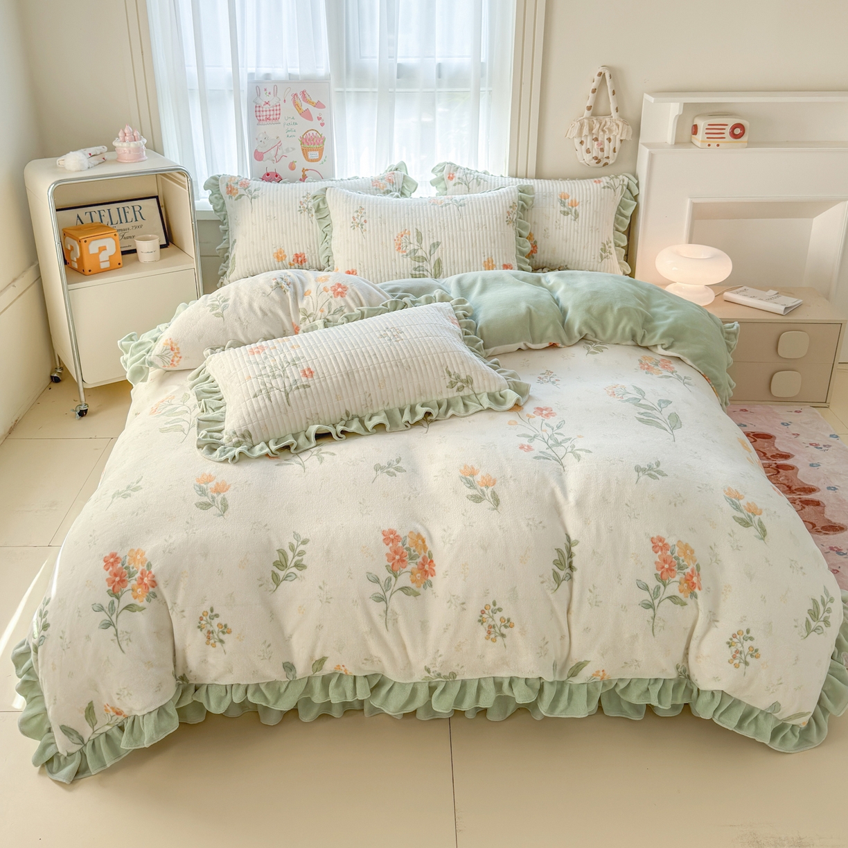 > 莱登卡奴 2025新款高克重牛奶绒花边床盖款系列四件套 奇异花朵绿