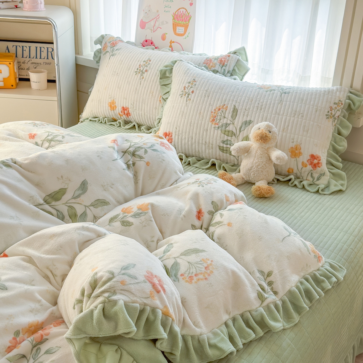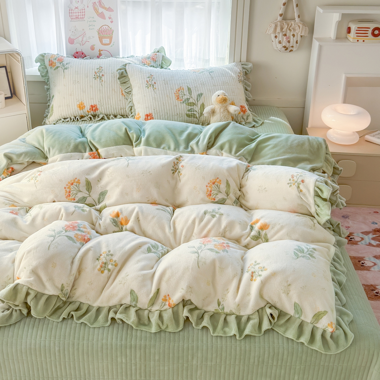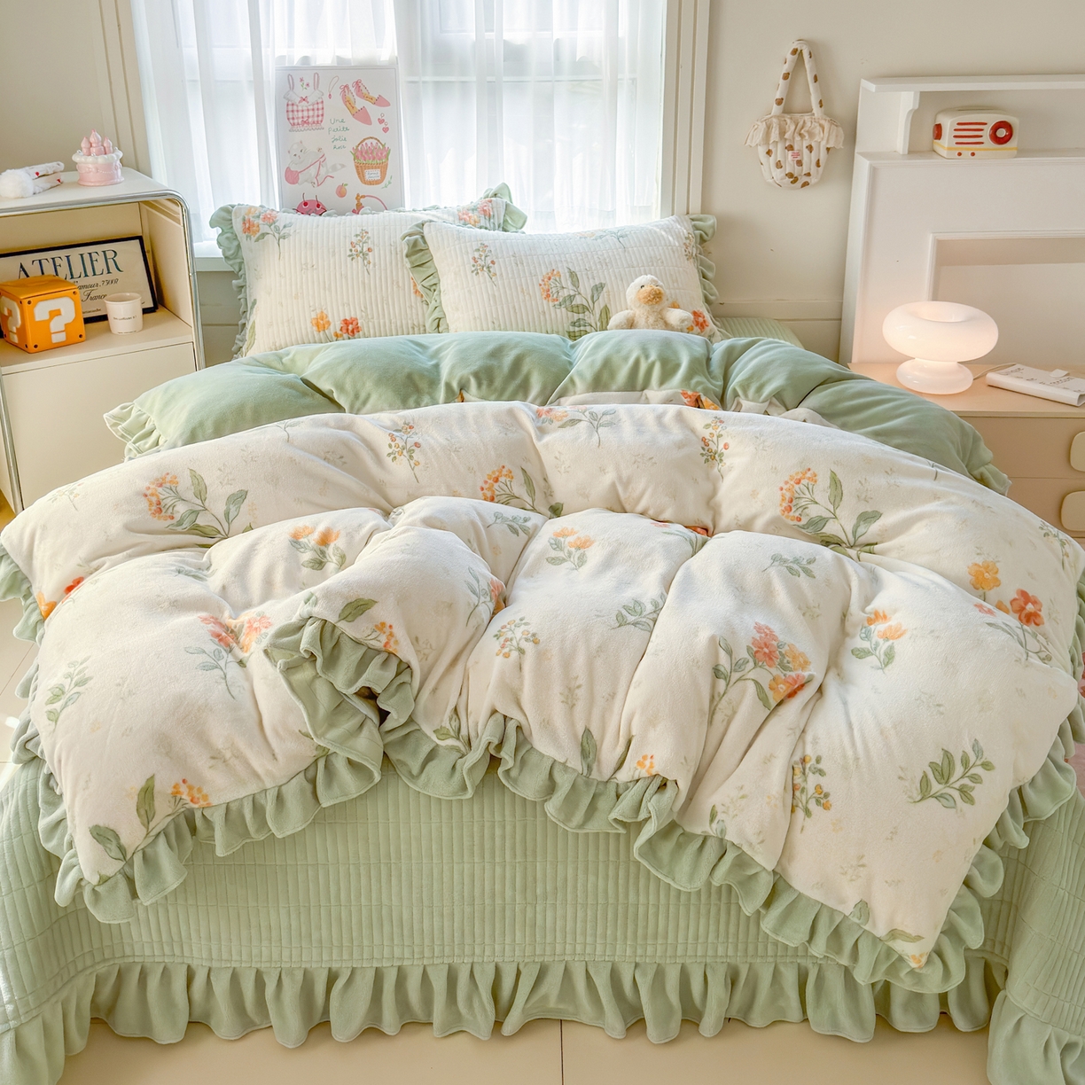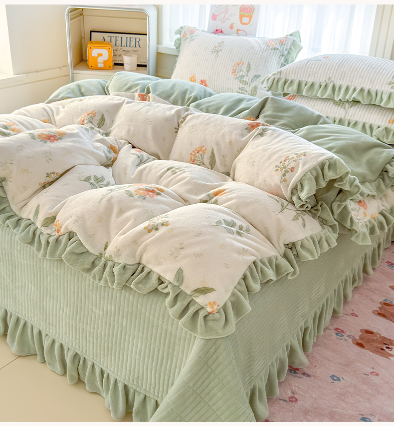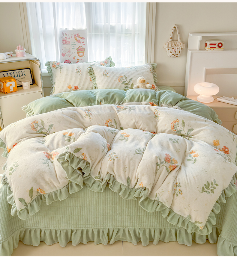 莱登卡奴 2025新款高克重牛奶绒花边床盖款系列四件套 奇异花朵绿
