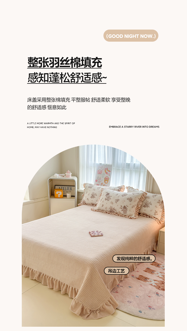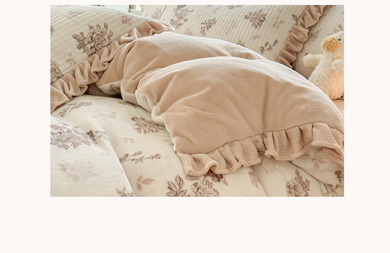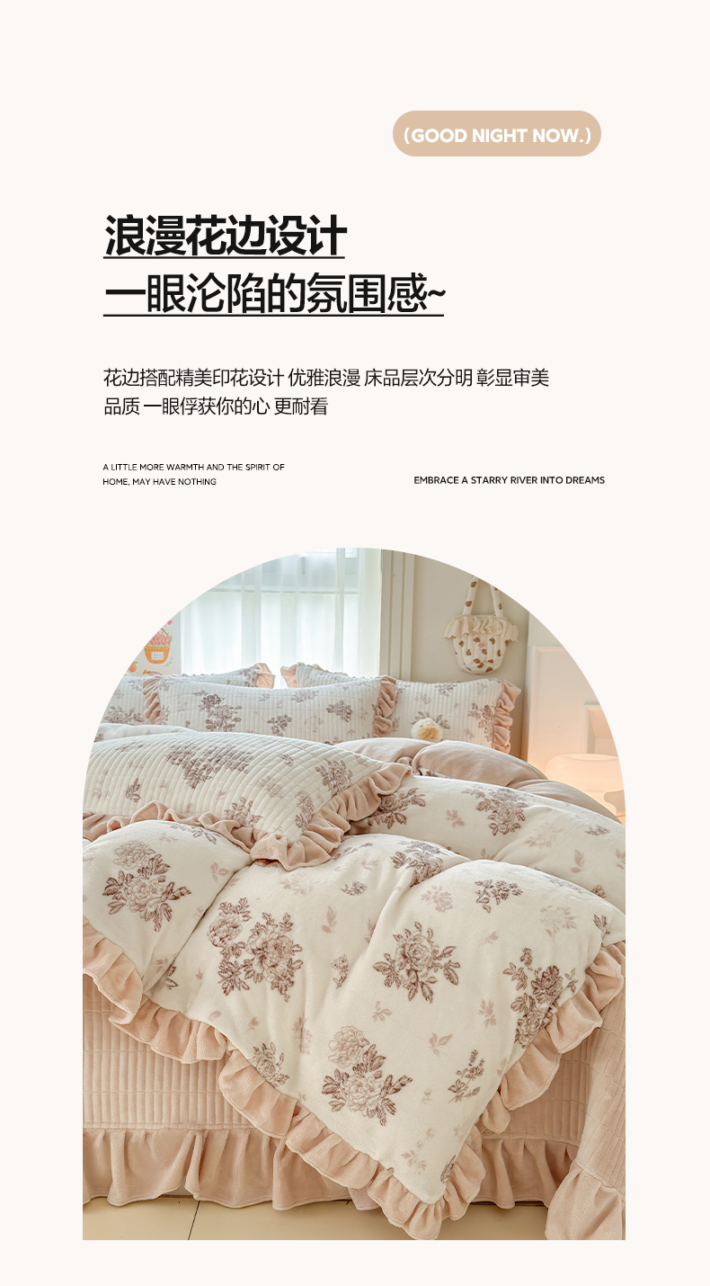 莱登卡奴 2025新款高克重牛奶绒花边床盖款系列四件套 浅春沐云奶杏