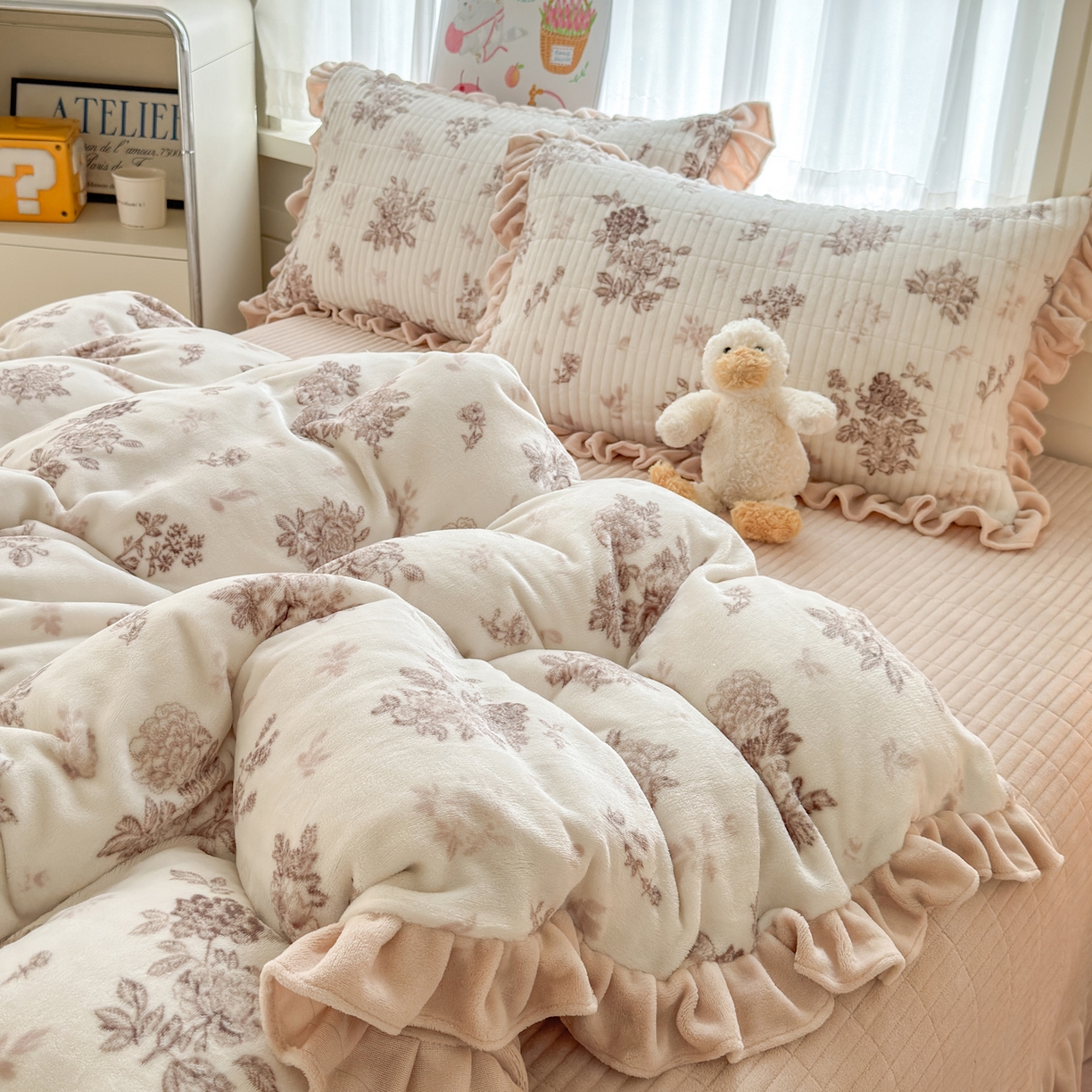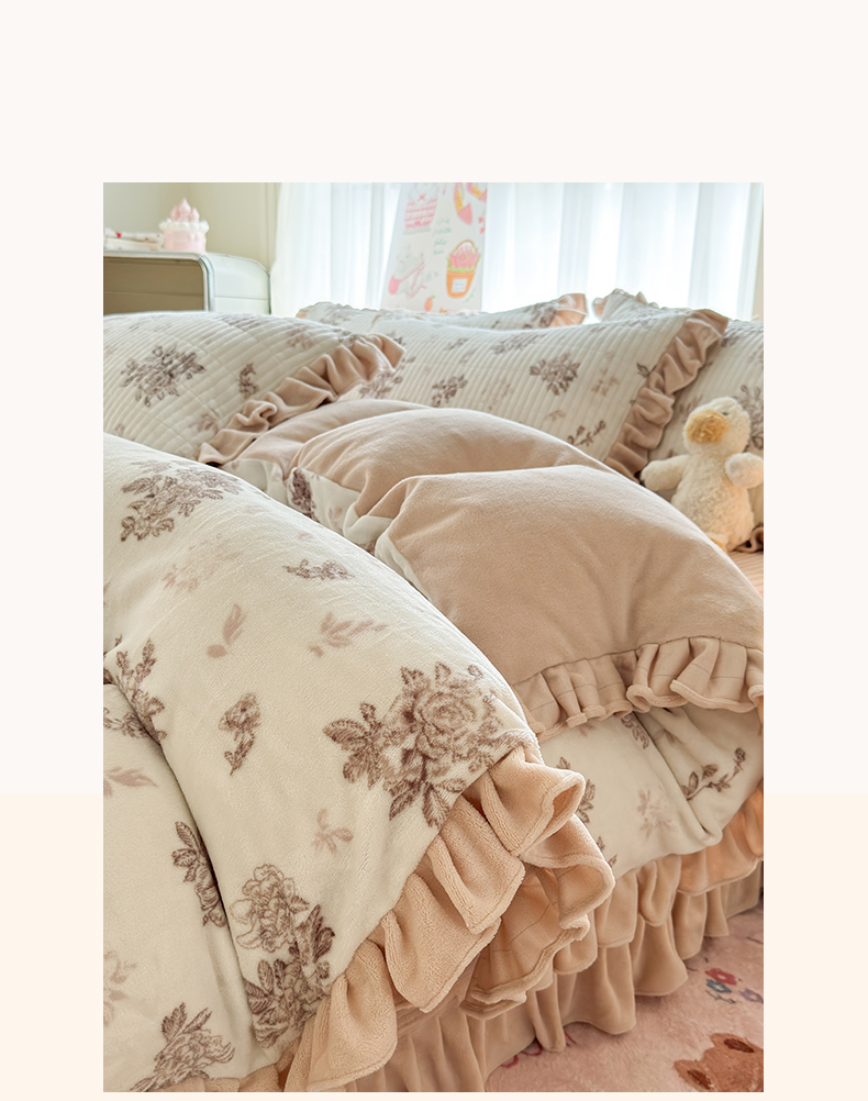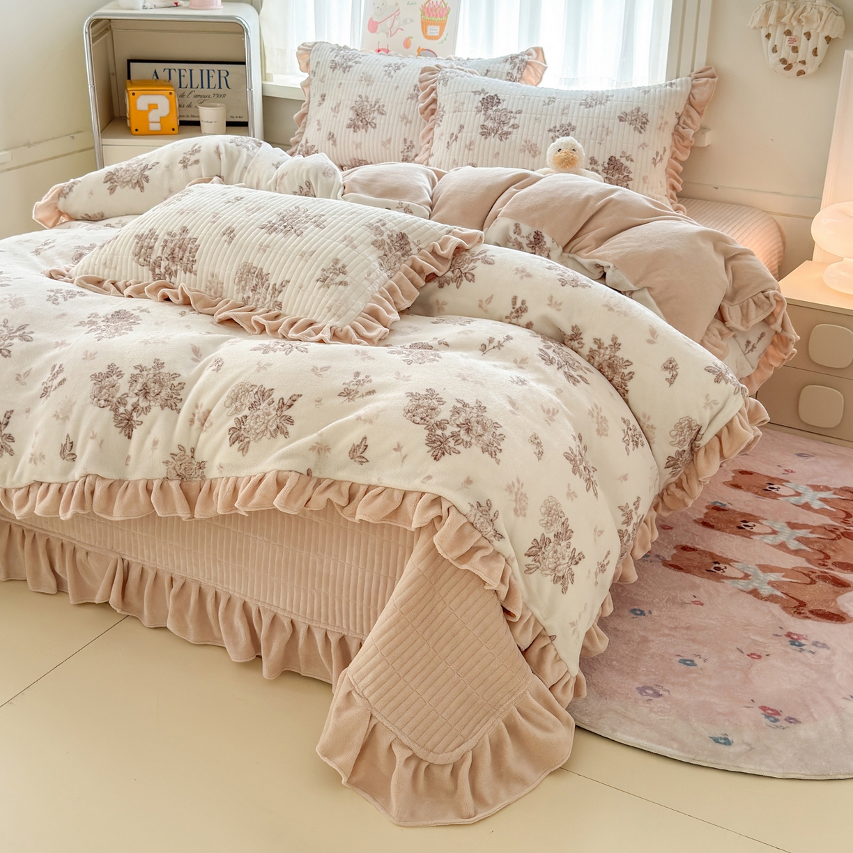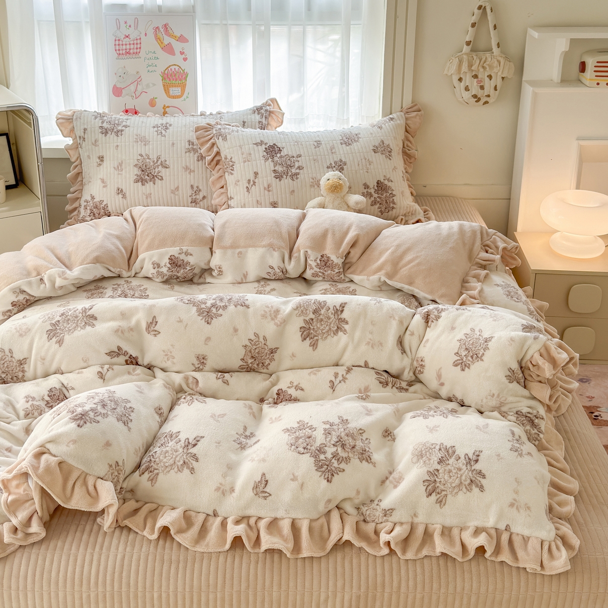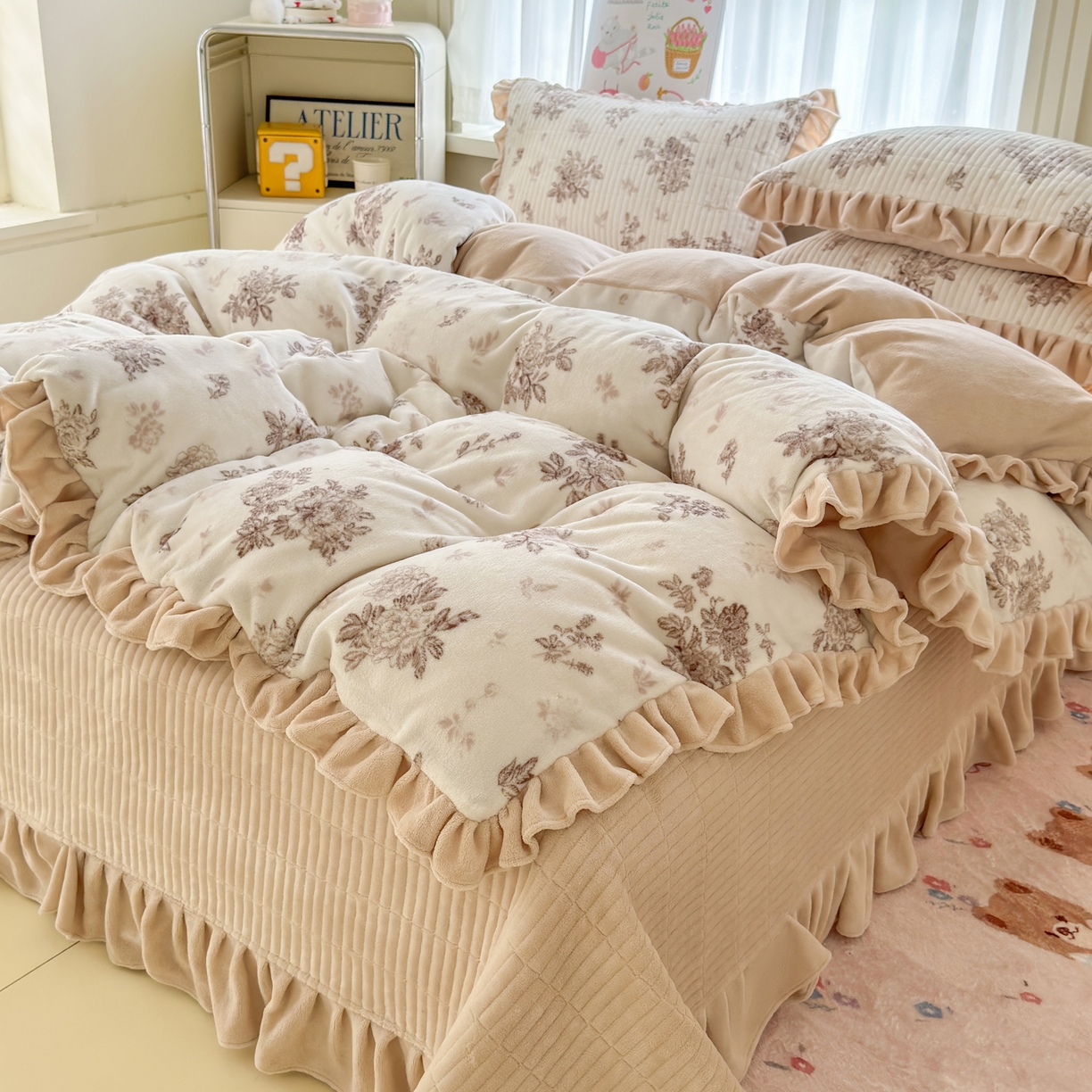 > 莱登卡奴 2025新款高克重牛奶绒花边床盖款系列四件套 浅春沐云奶杏