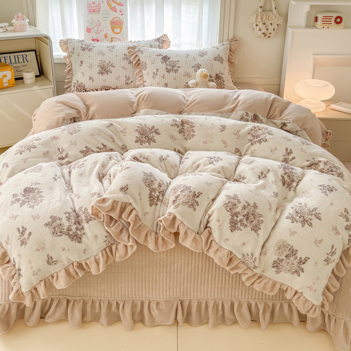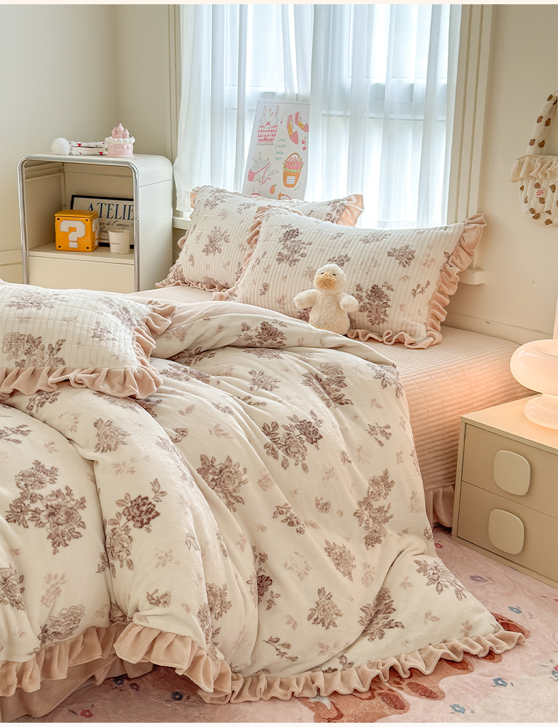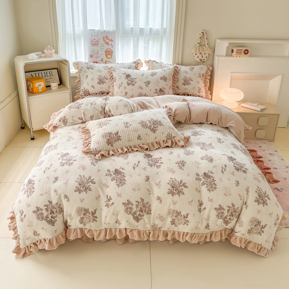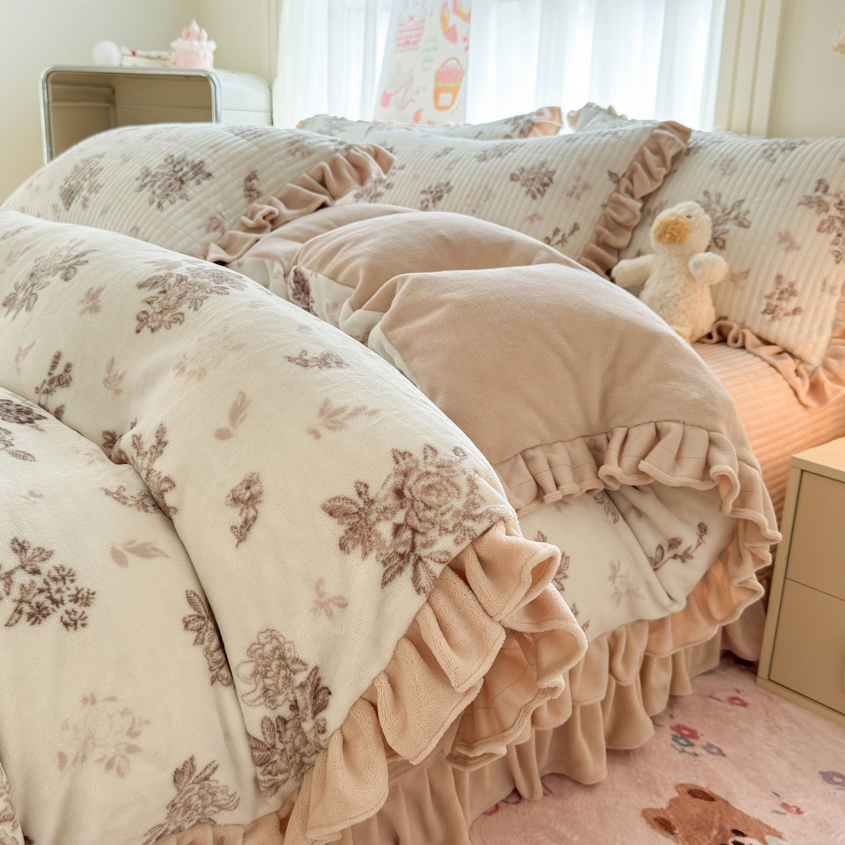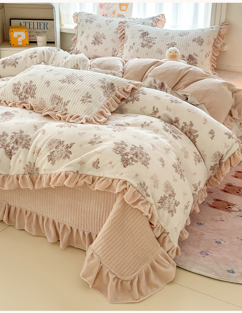 > 莱登卡奴 2025新款高克重牛奶绒花边床盖款系列四件套 浅春沐云奶杏
