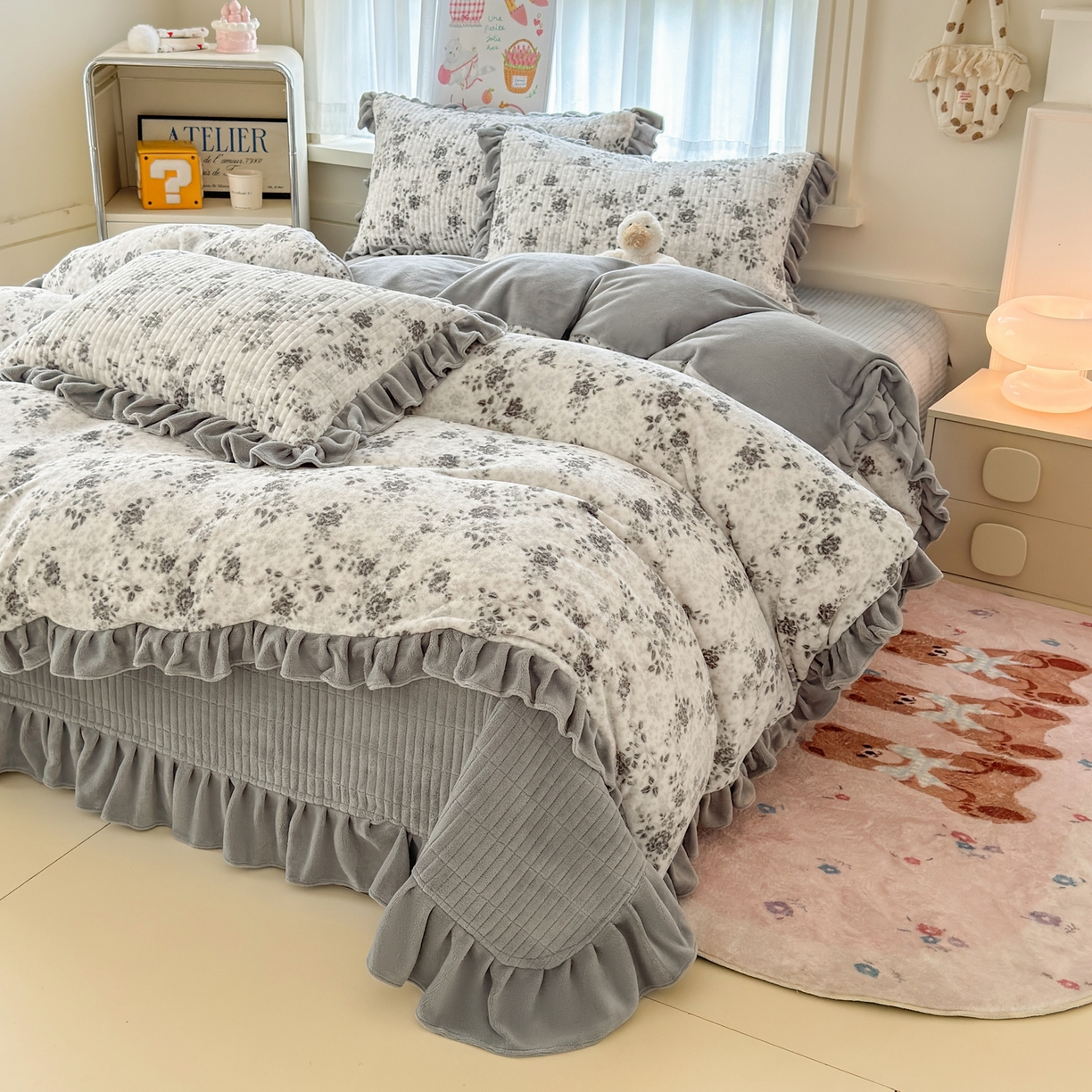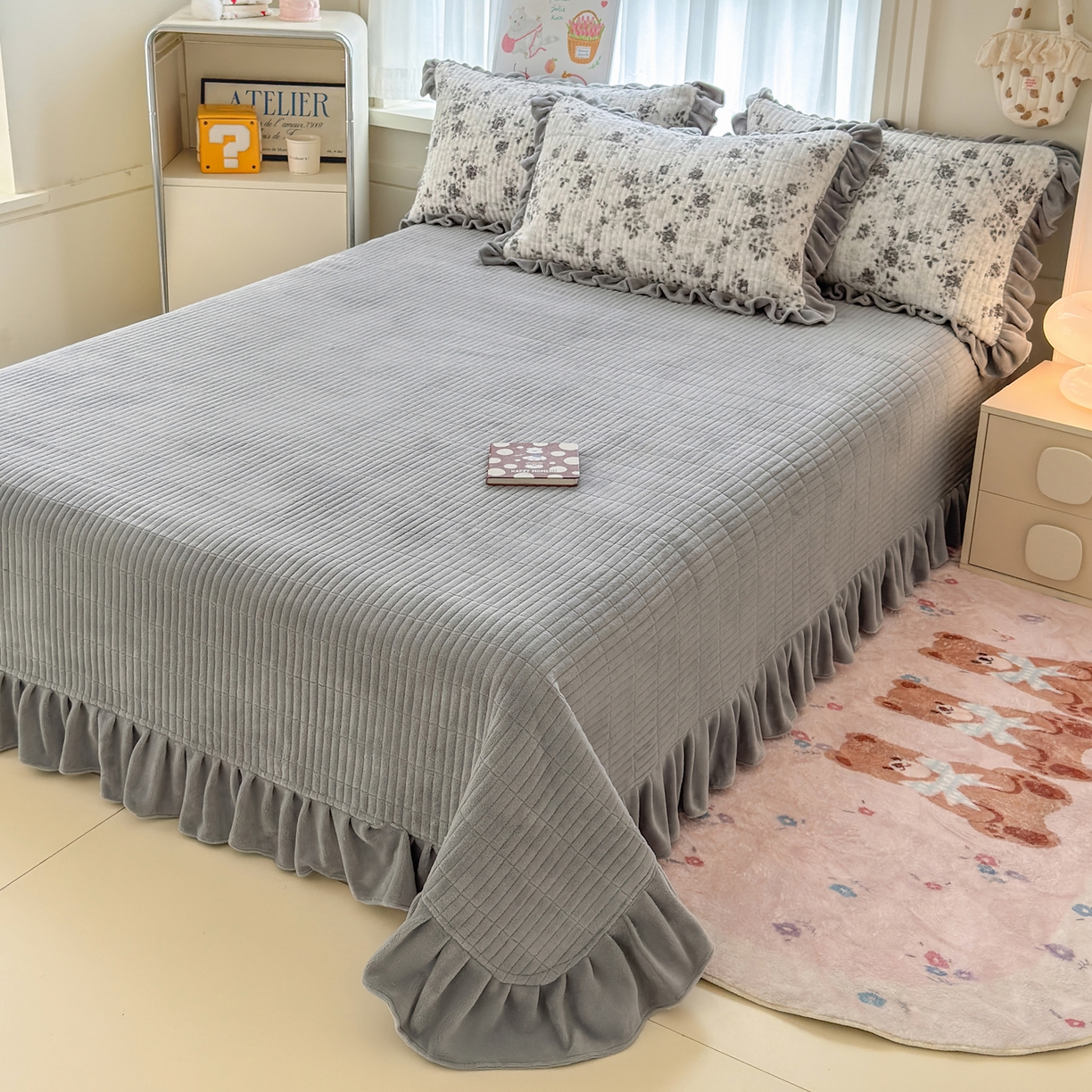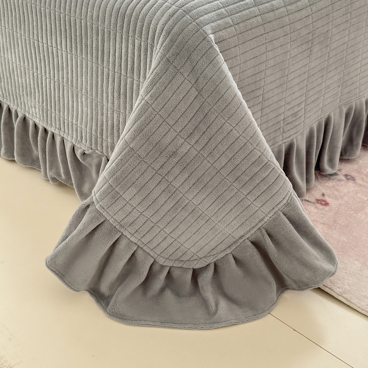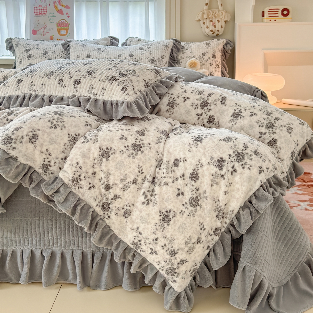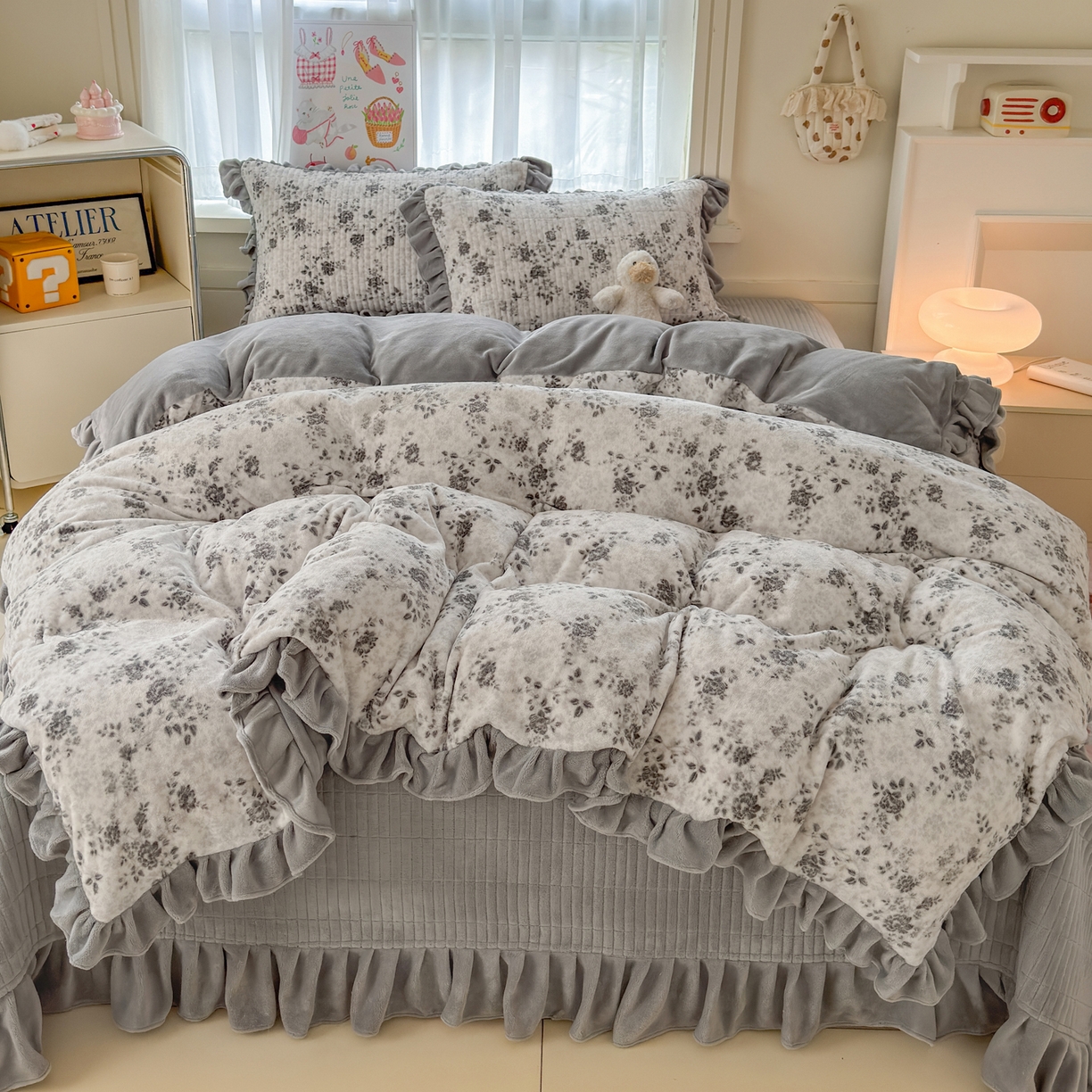 > 莱登卡奴 2025新款高克重牛奶绒花边床盖款系列四件套 素雅情调灰