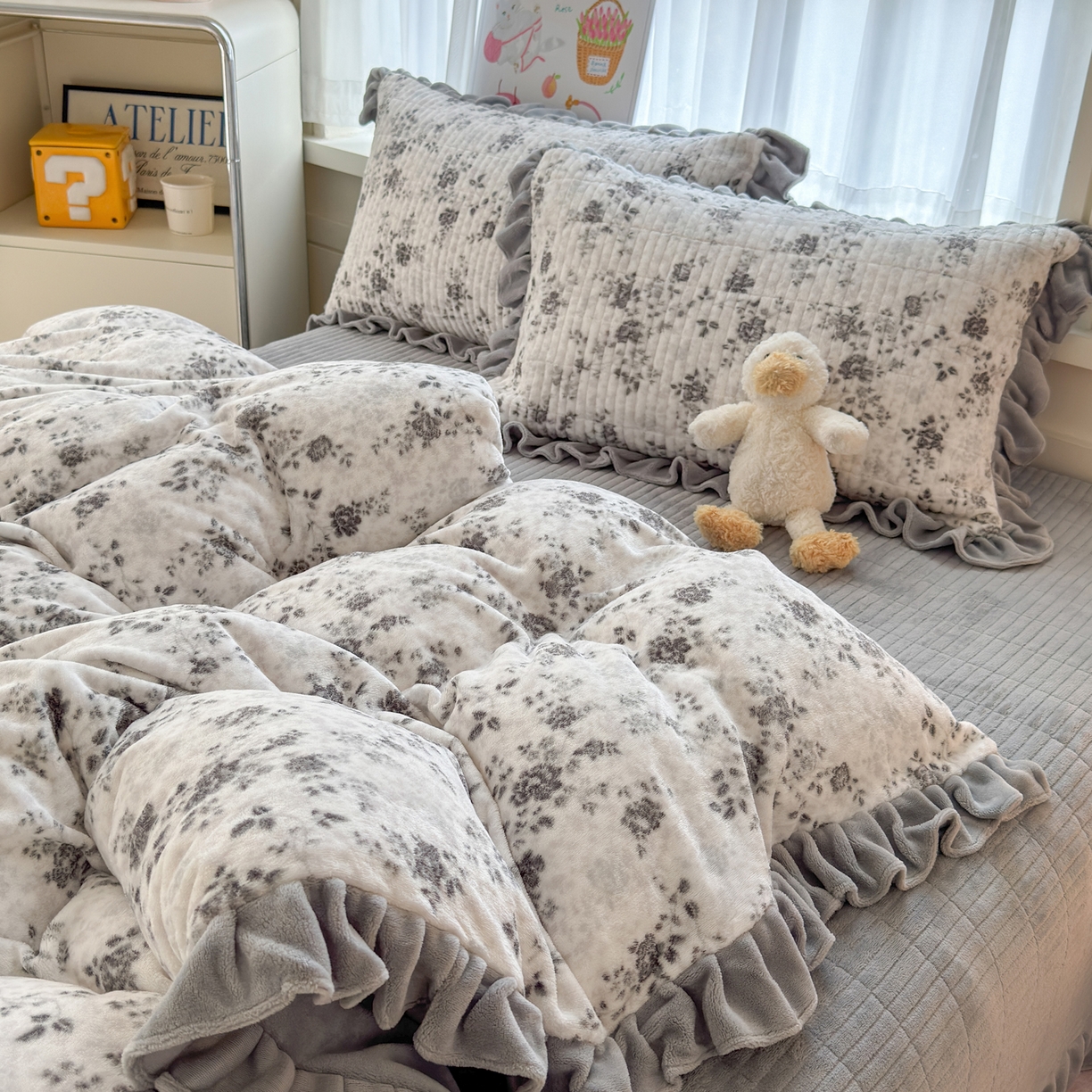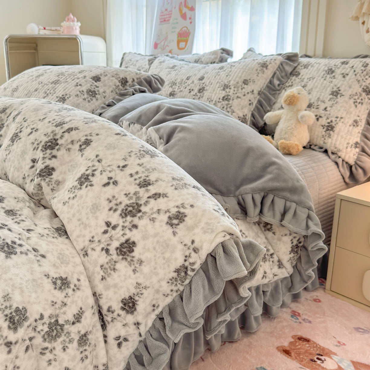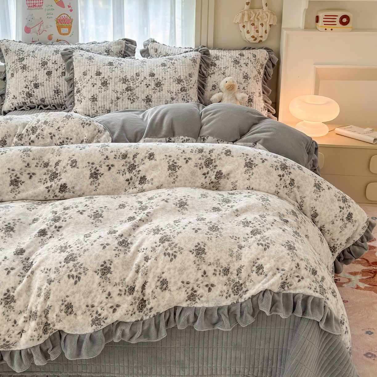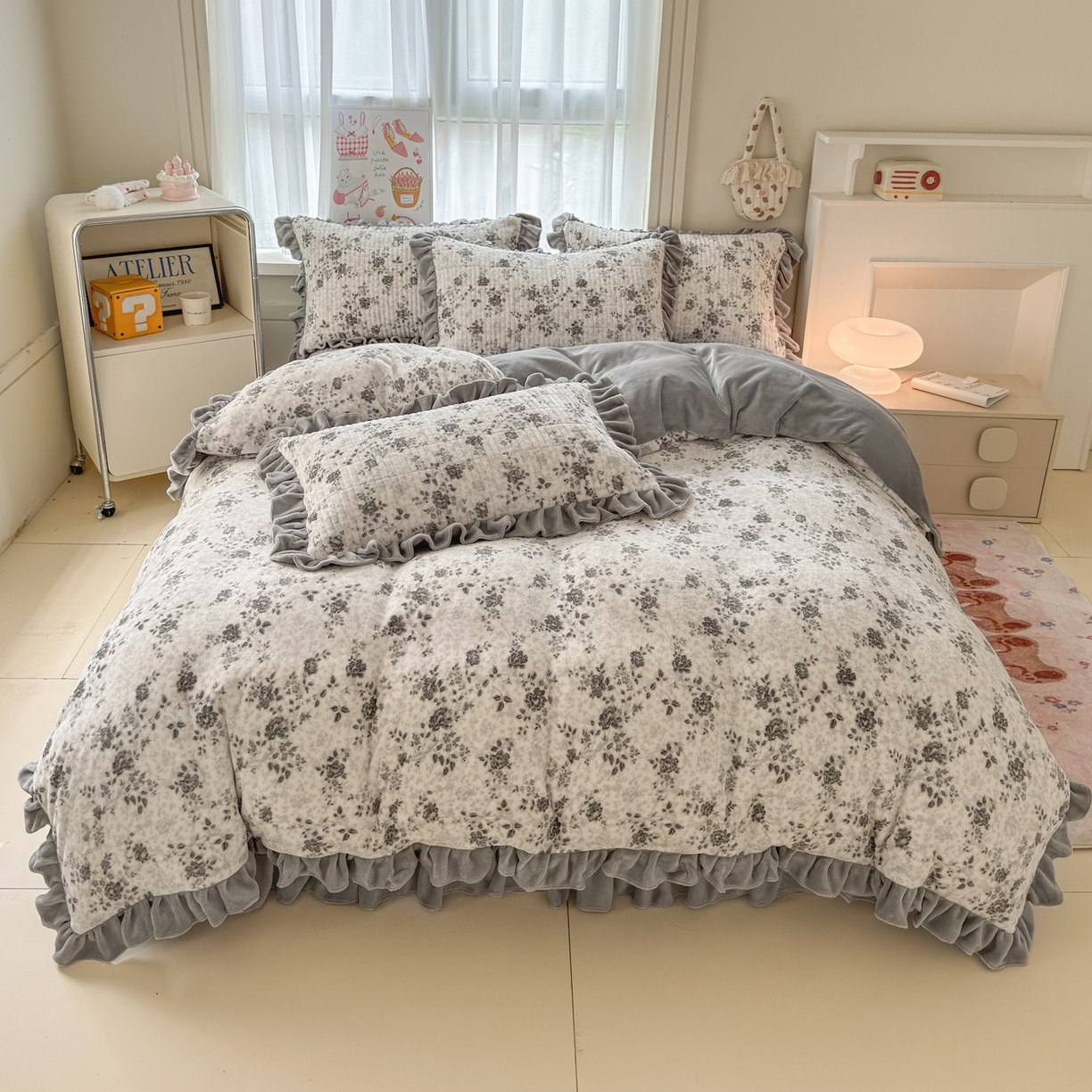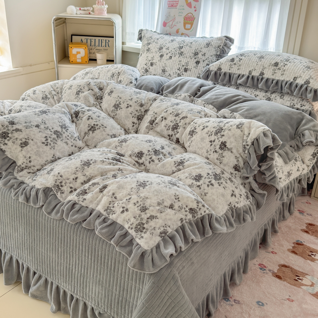 > 莱登卡奴 2025新款高克重牛奶绒花边床盖款系列四件套 素雅情调灰