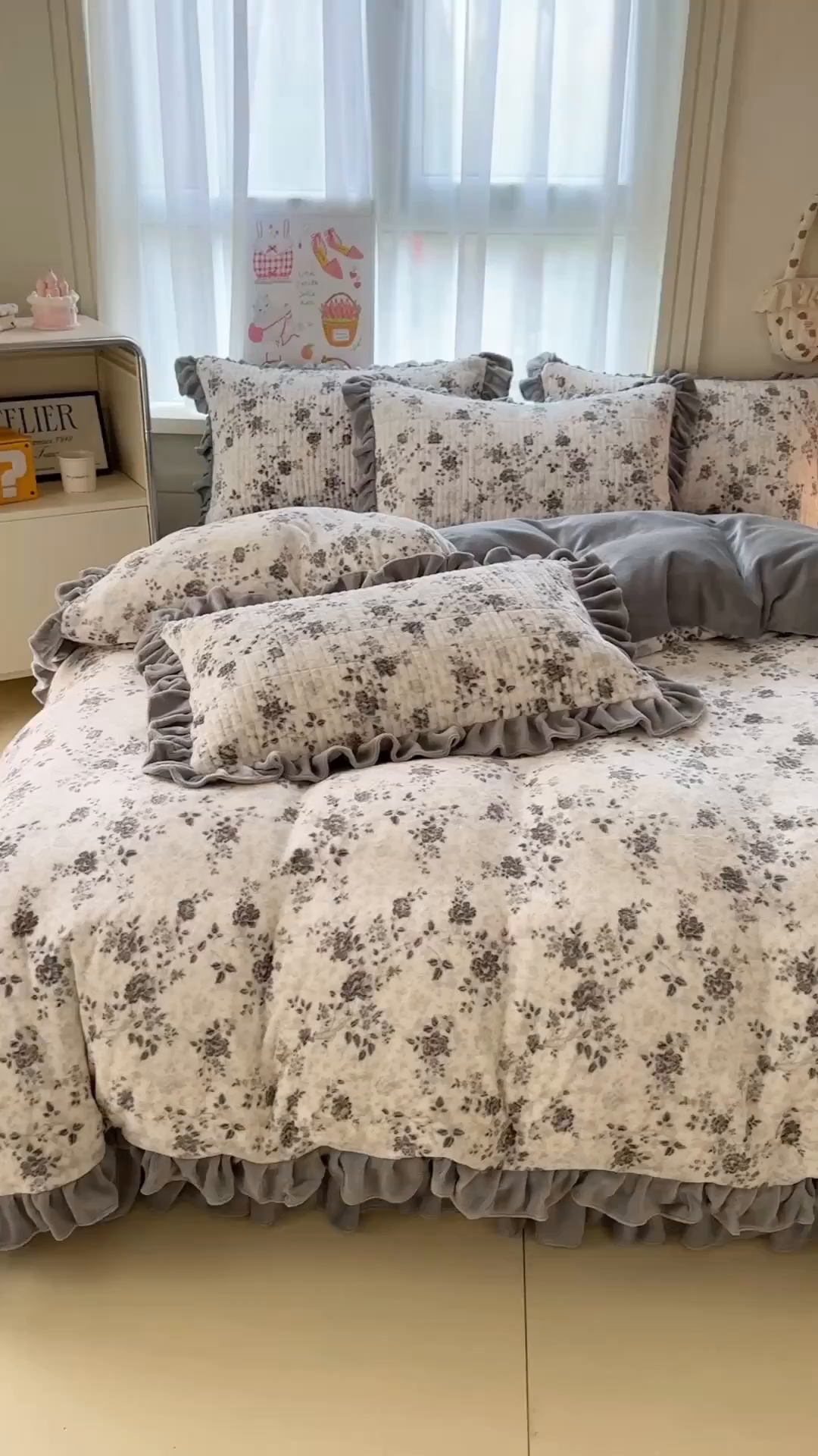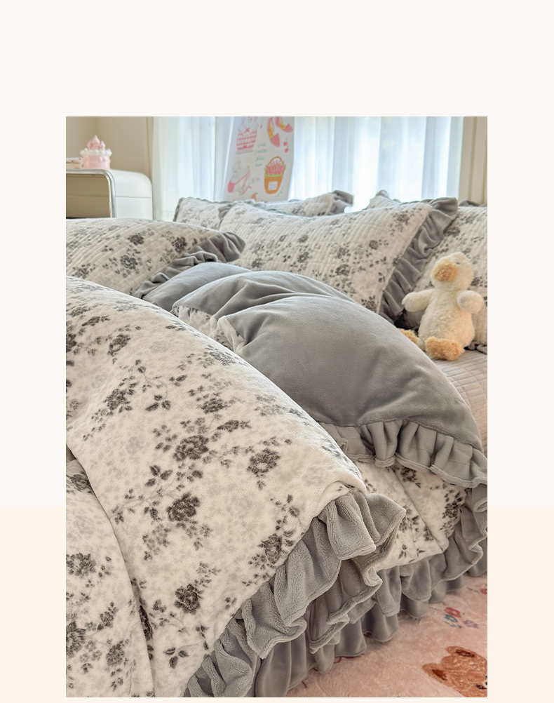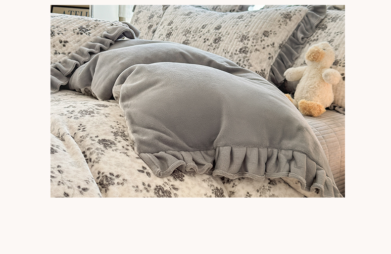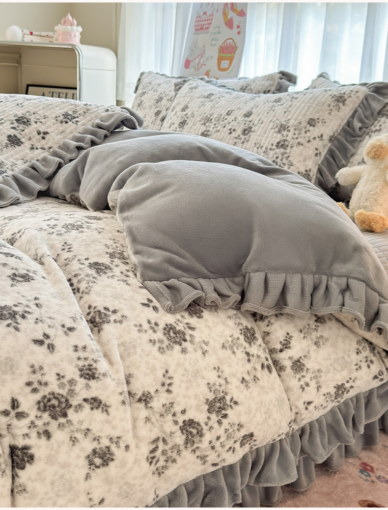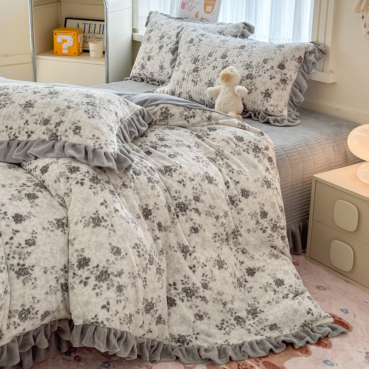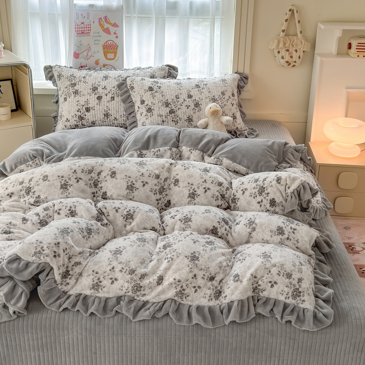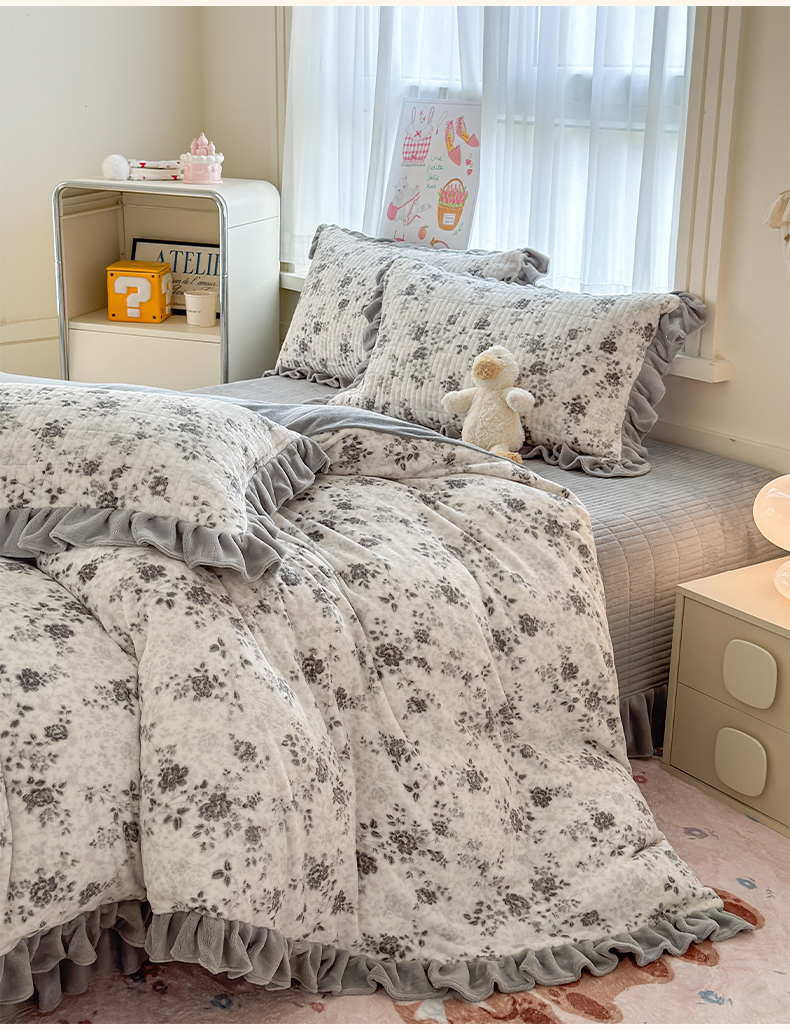 > 莱登卡奴 2025新款高克重牛奶绒花边床盖款系列四件套 素雅情调灰