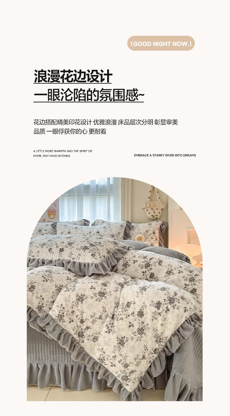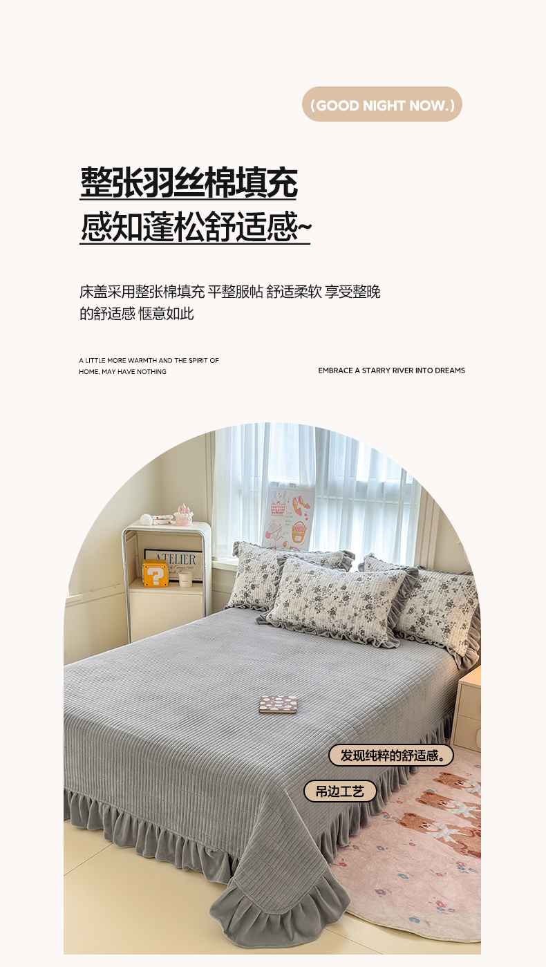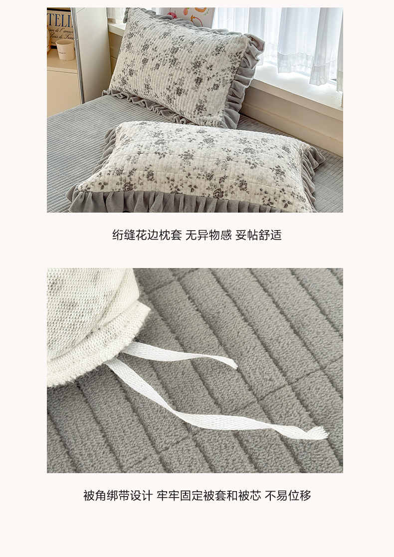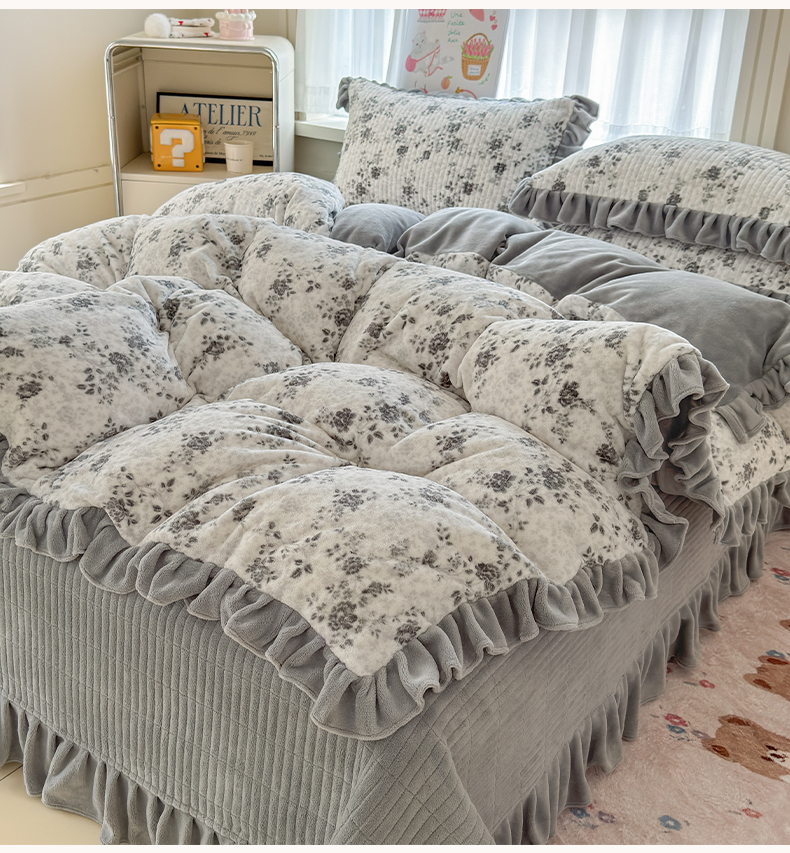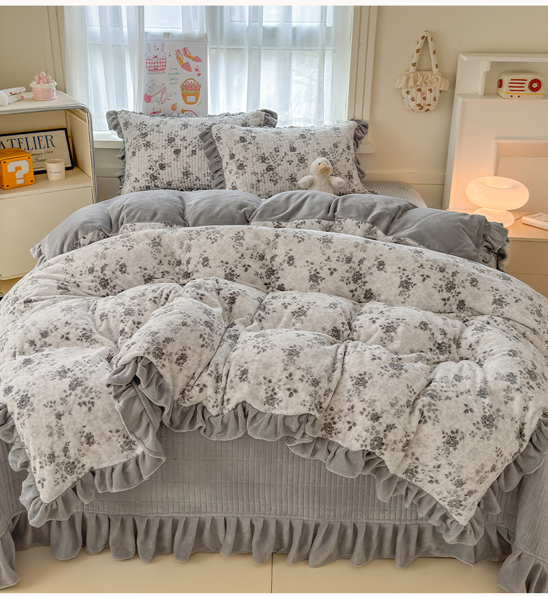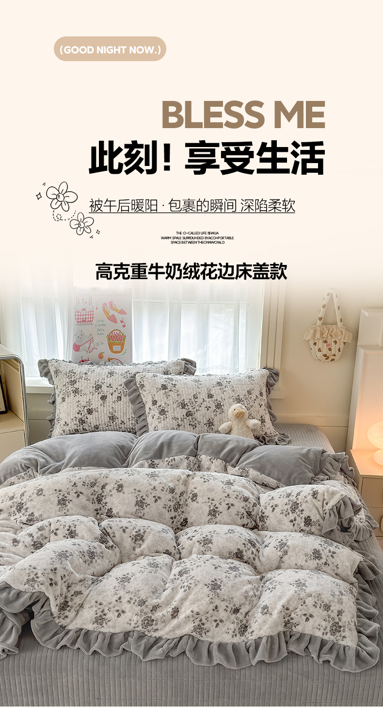 莱登卡奴 2025新款高克重牛奶绒花边床盖款系列四件套 素雅情调灰