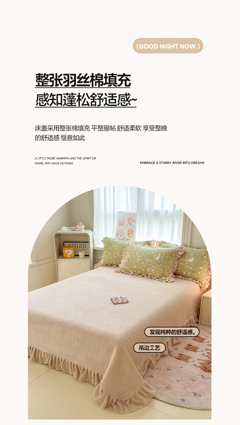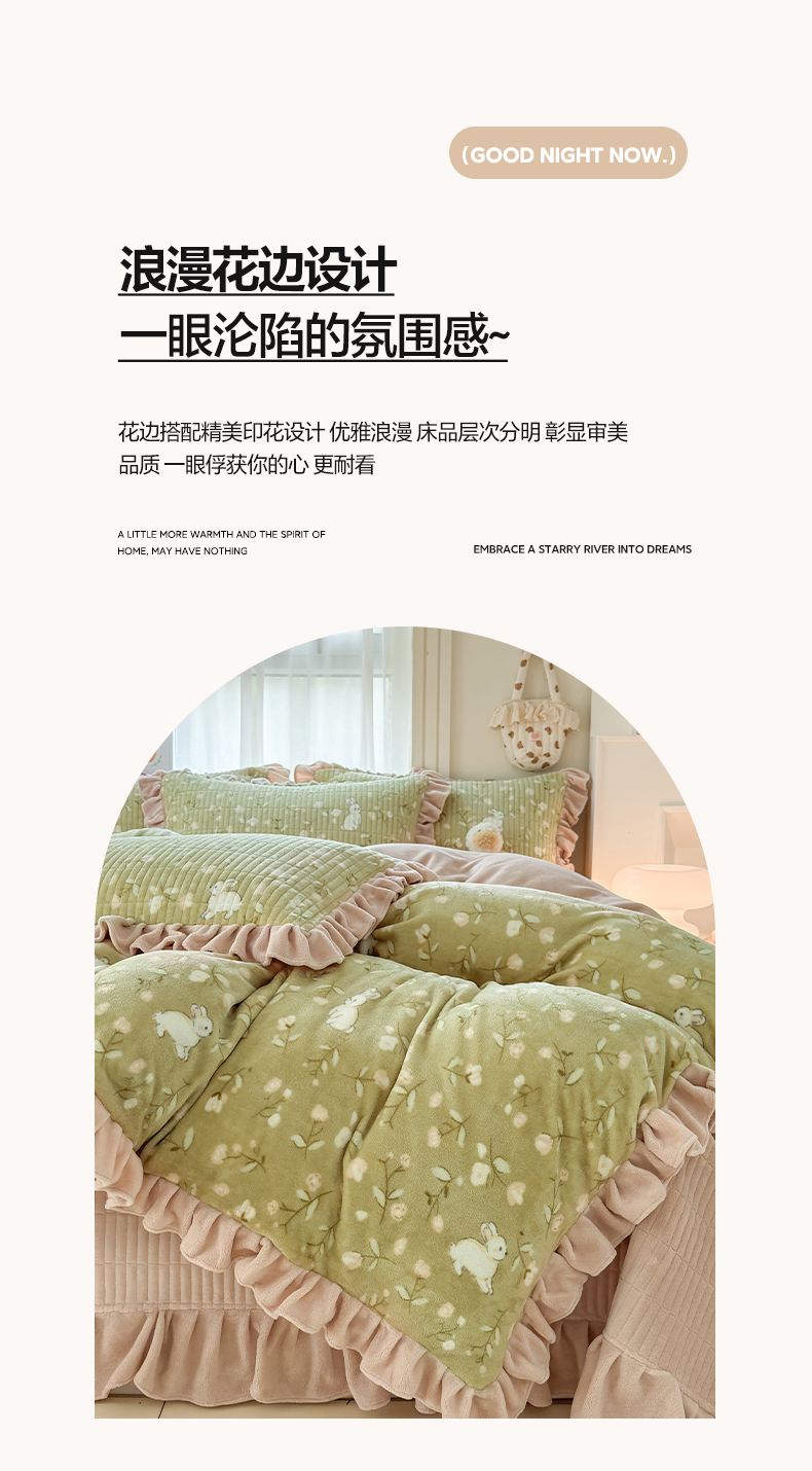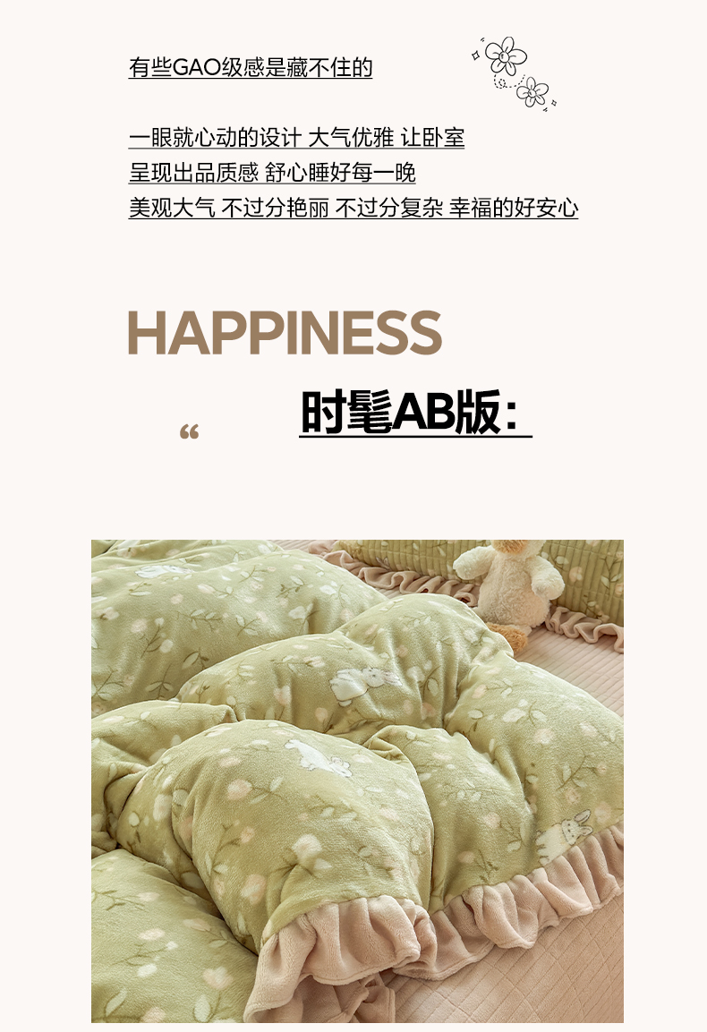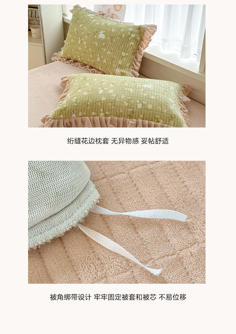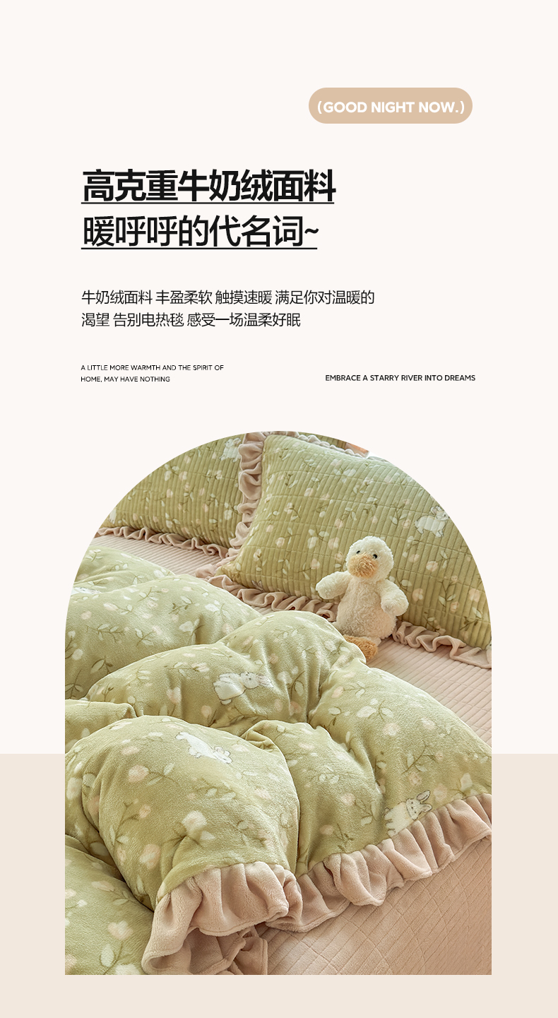 莱登卡奴 2025新款高克重牛奶绒花边床盖款系列四件套 兔兔庄园