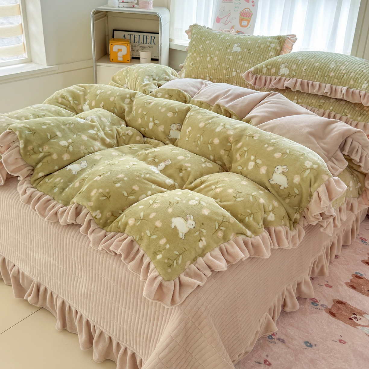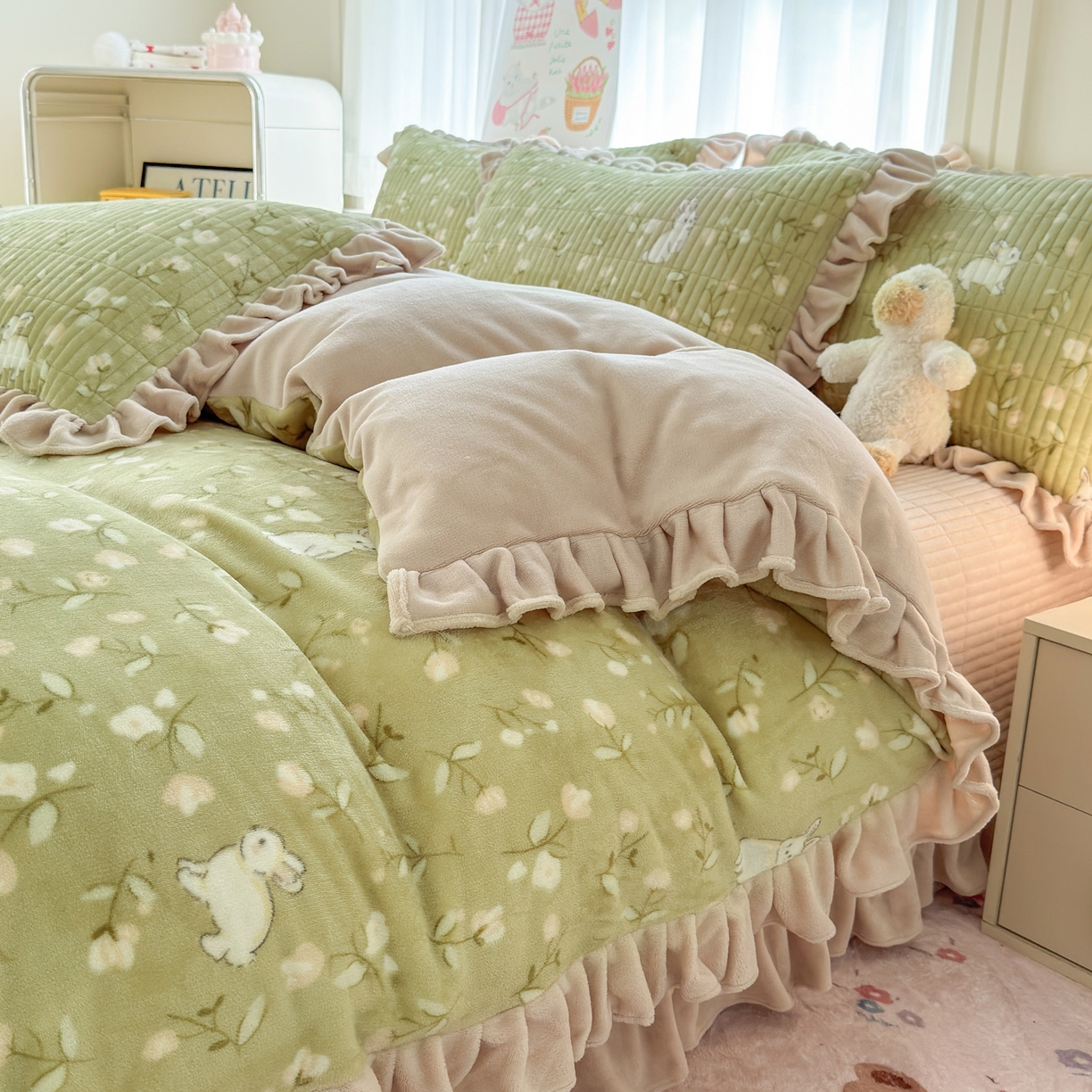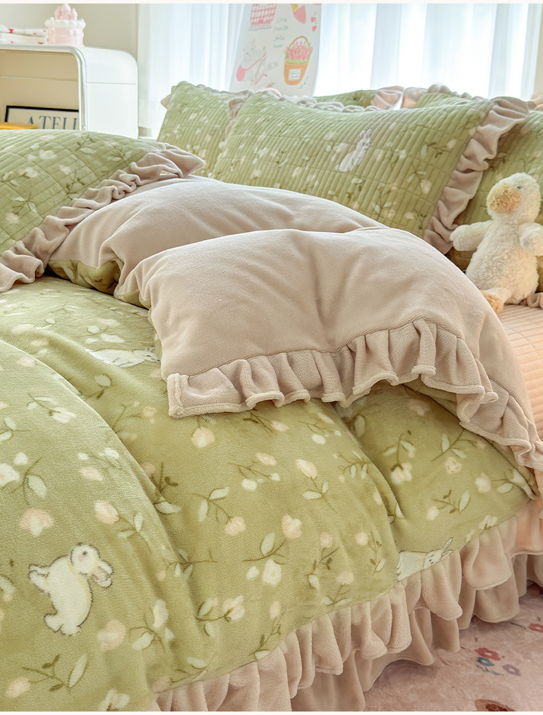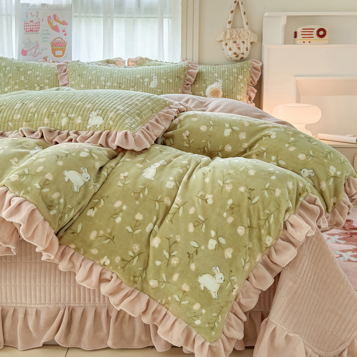> 莱登卡奴 2025新款高克重牛奶绒花边床盖款系列四件套 兔兔庄园