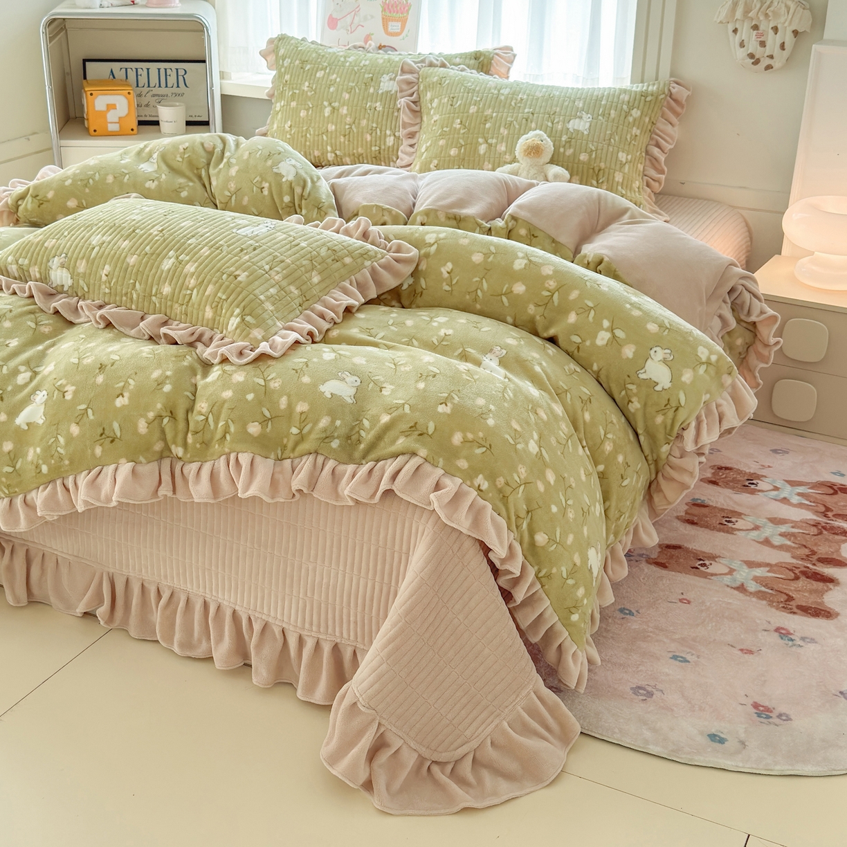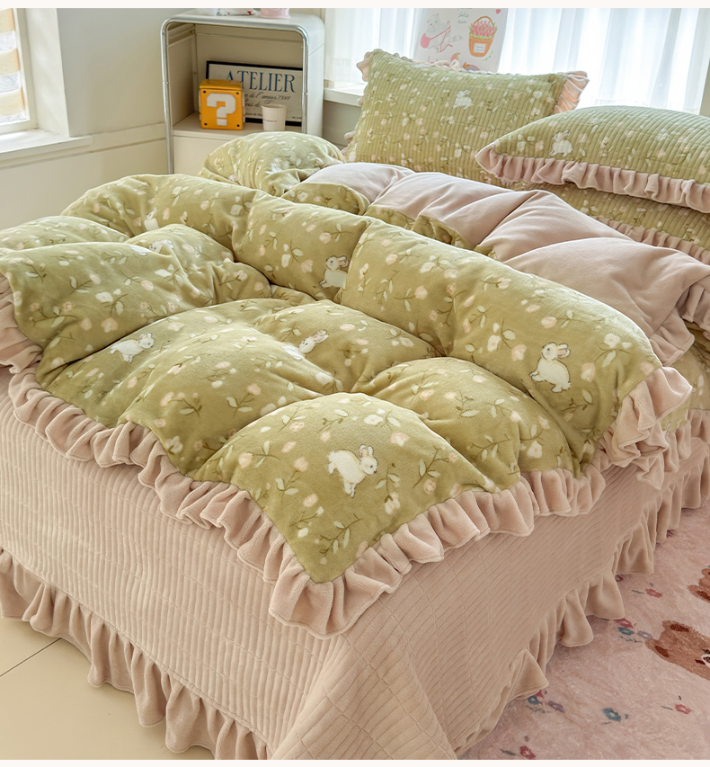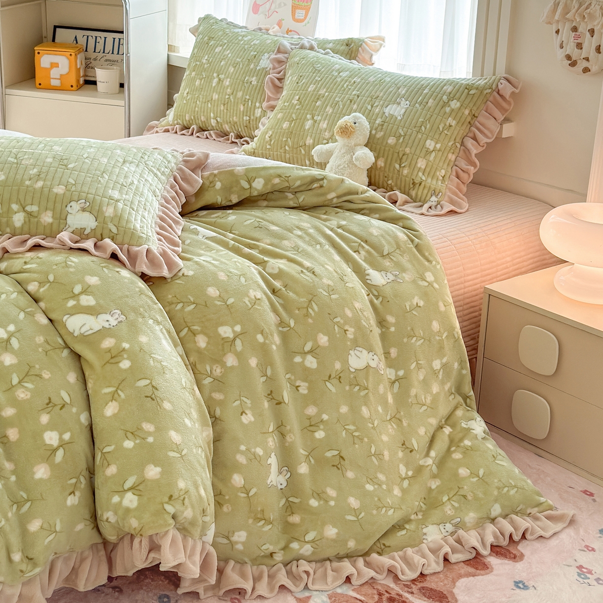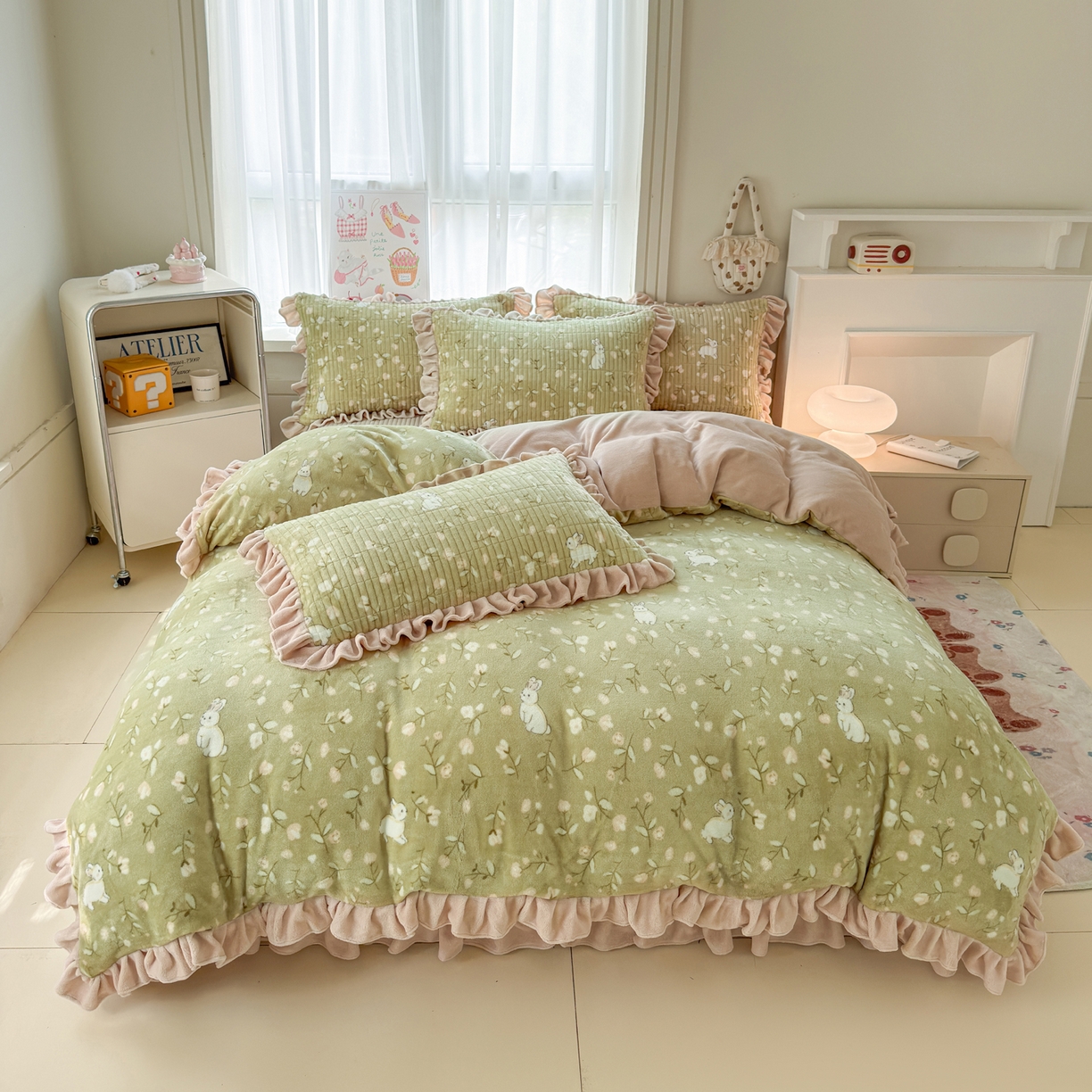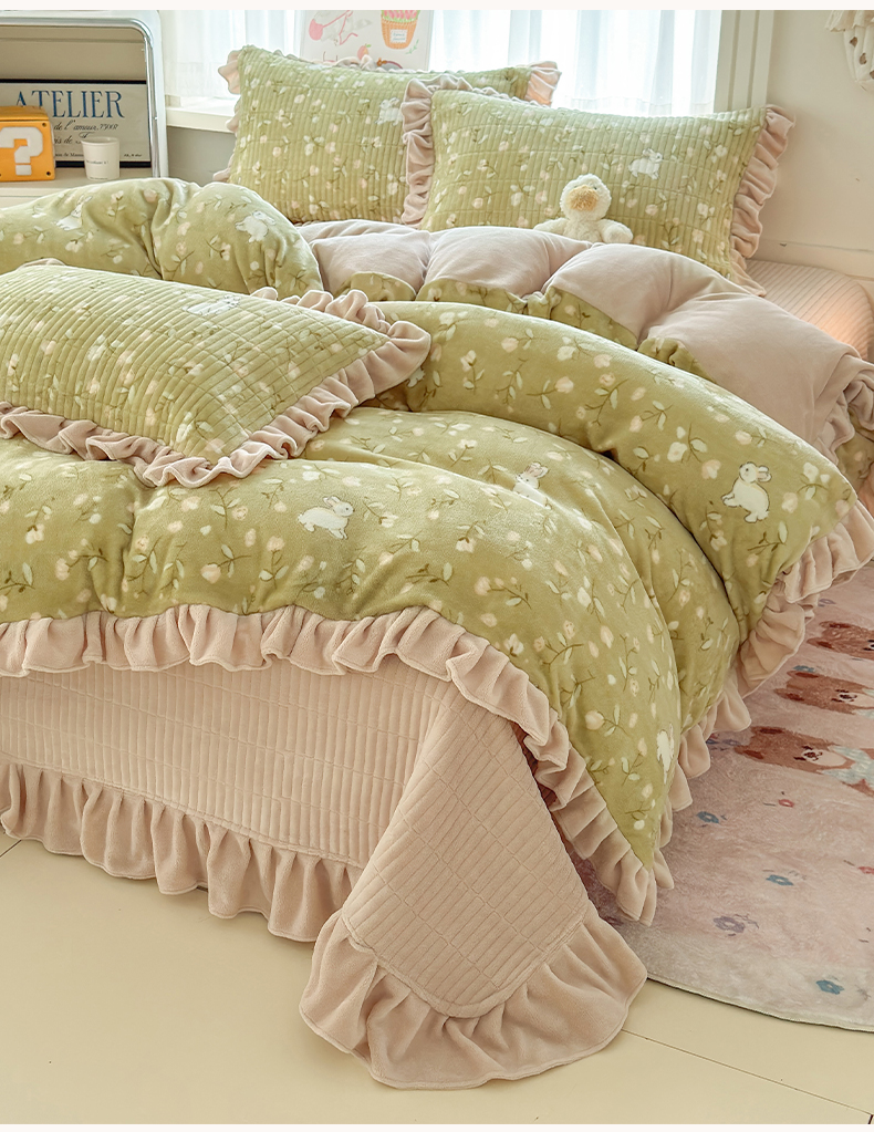 > 莱登卡奴 2025新款高克重牛奶绒花边床盖款系列四件套 兔兔庄园