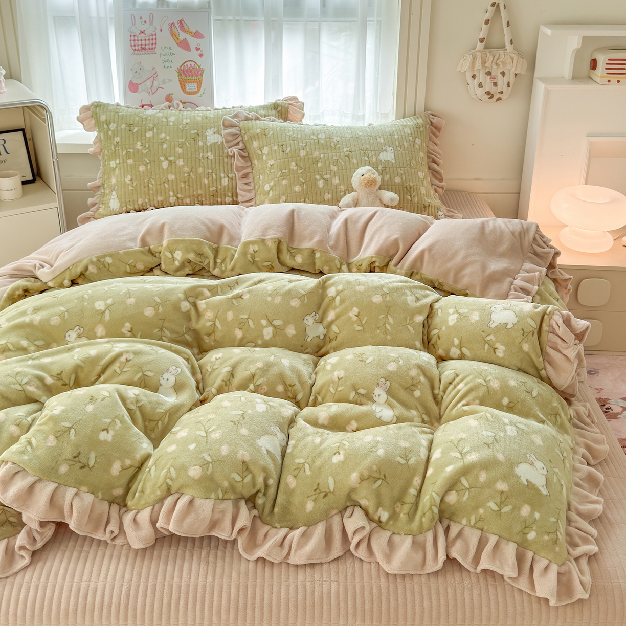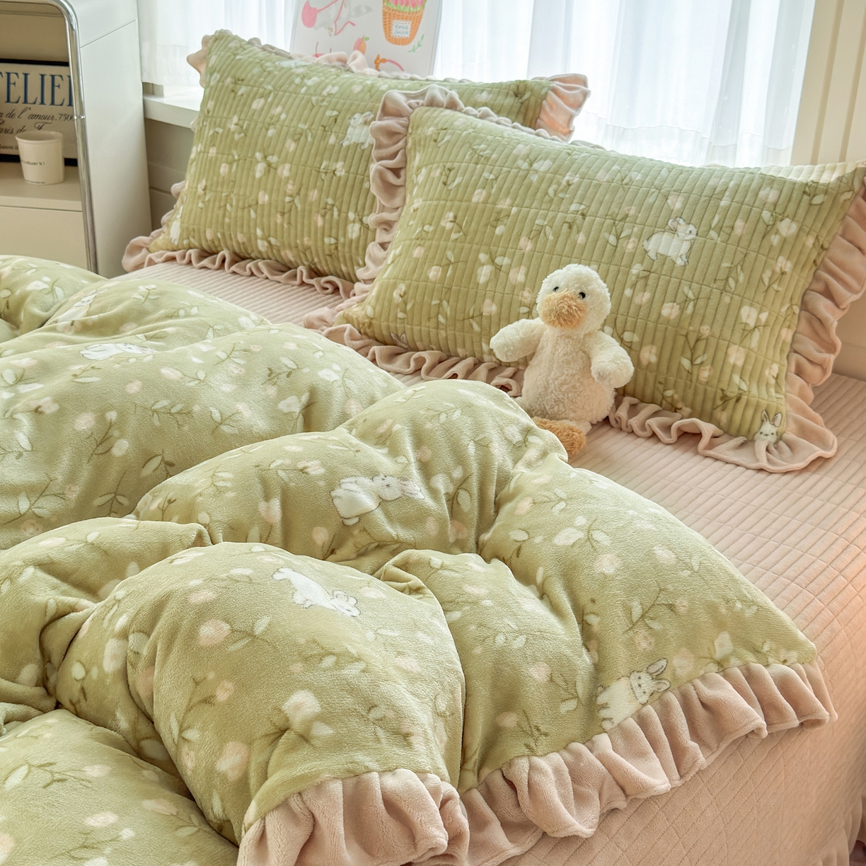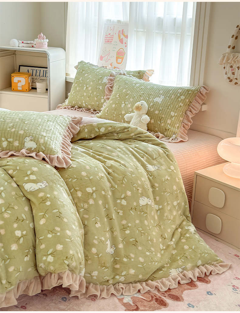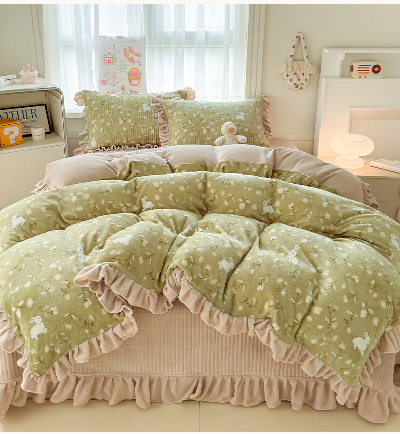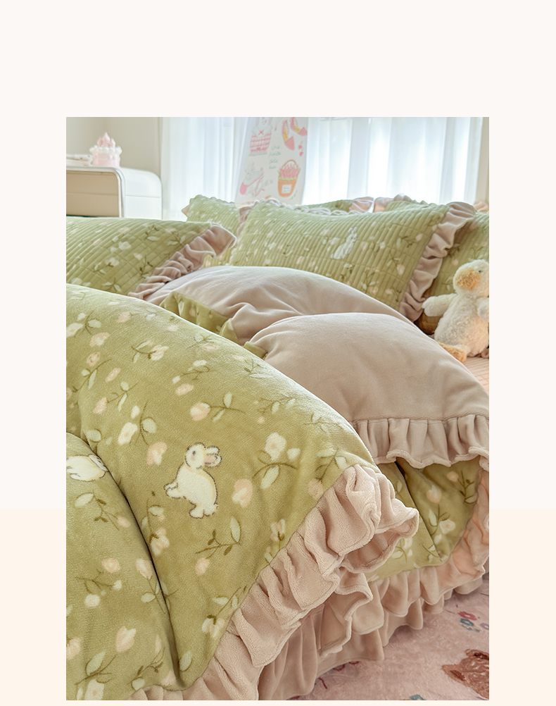 > 莱登卡奴 2025新款高克重牛奶绒花边床盖款系列四件套 兔兔庄园