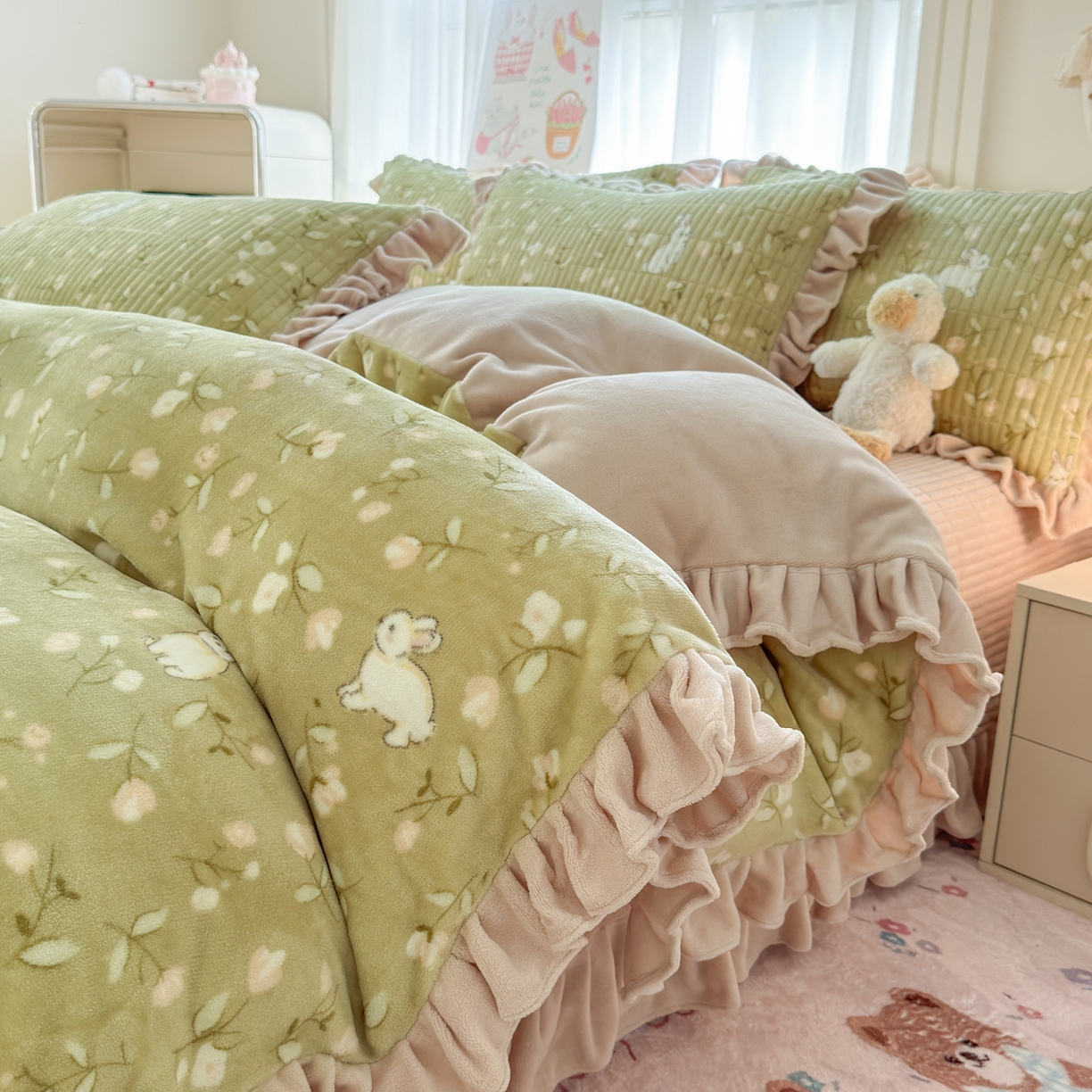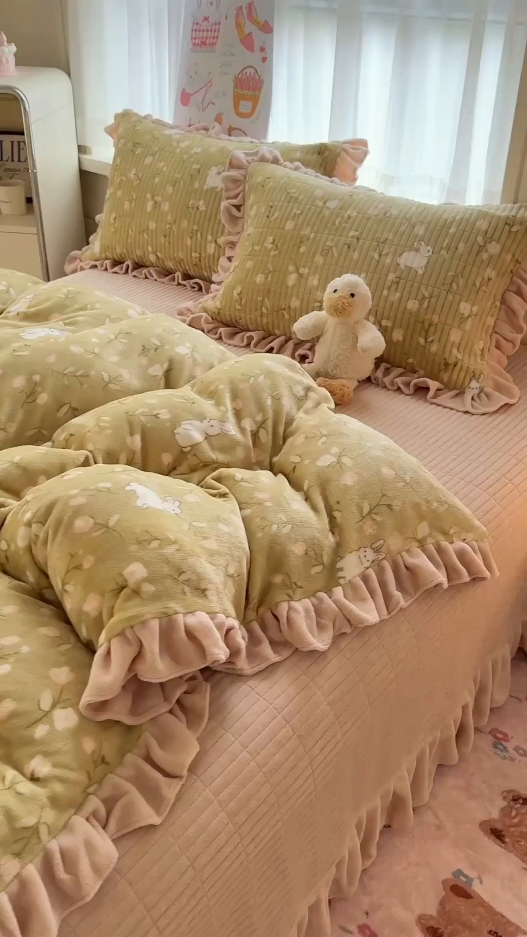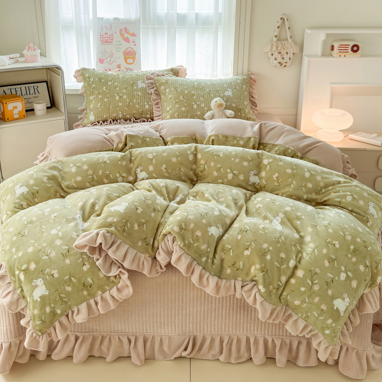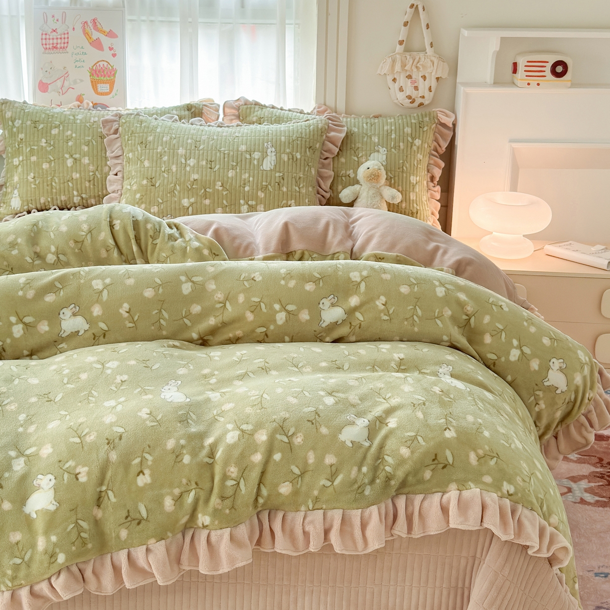 > 莱登卡奴 2025新款高克重牛奶绒花边床盖款系列四件套 兔兔庄园