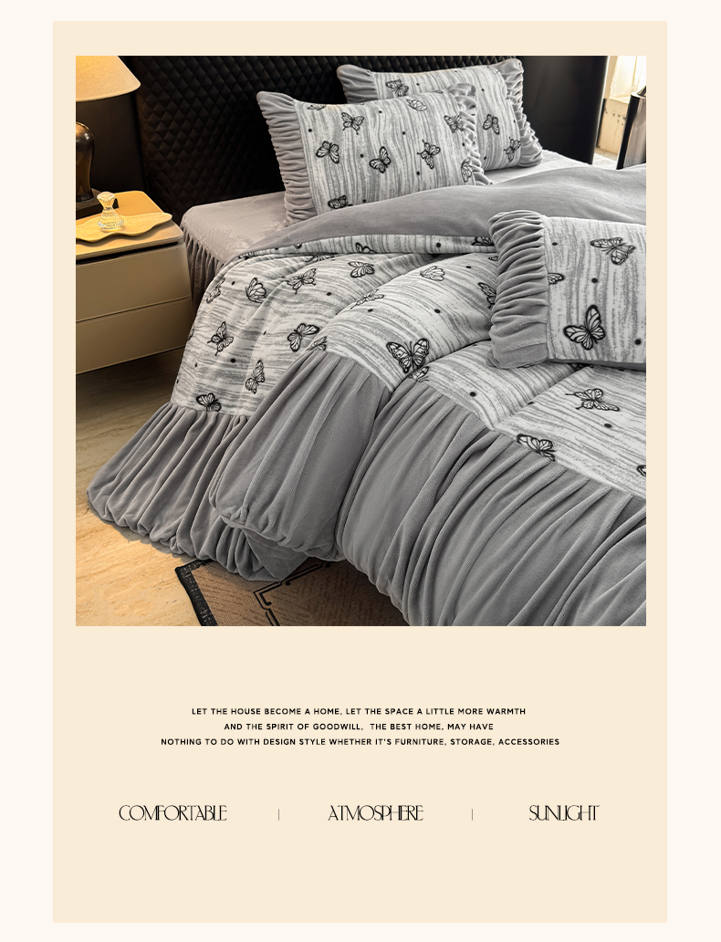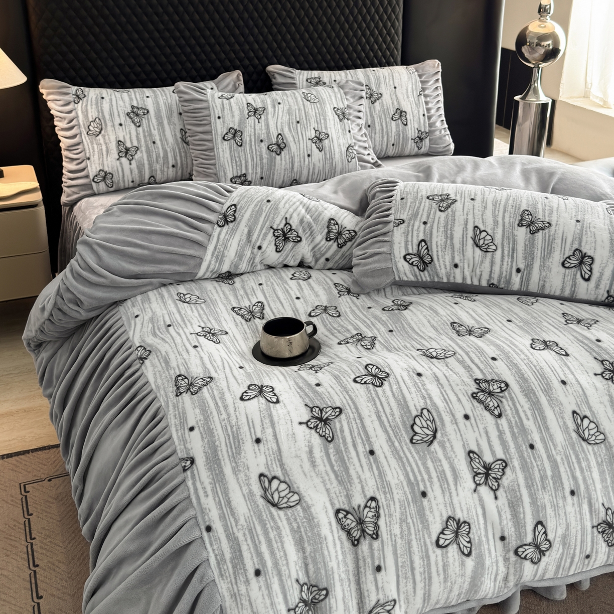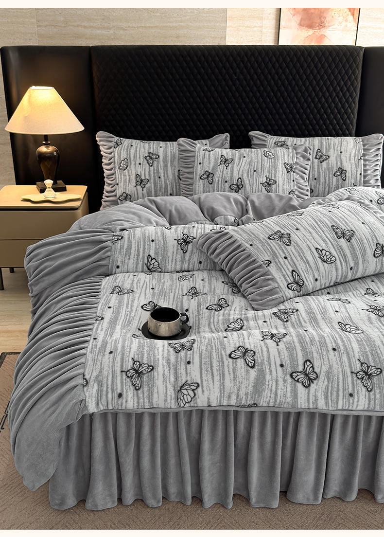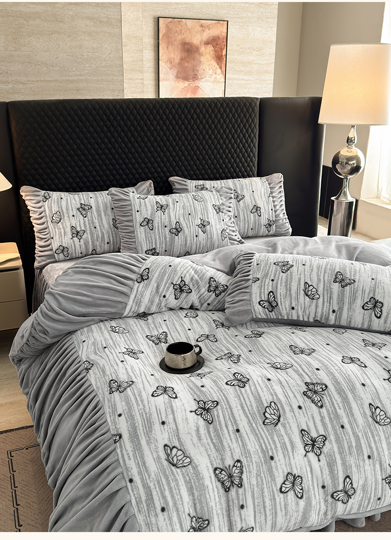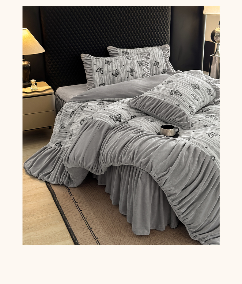 > 莱登卡奴 2025新款高克重牛奶绒雕花法式轻奢款床单床裙系列四件套 轻奢蝶舞-银灰