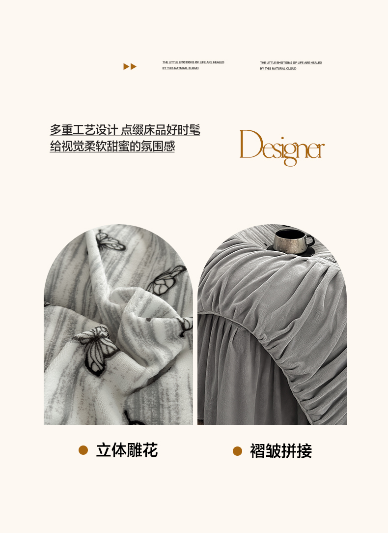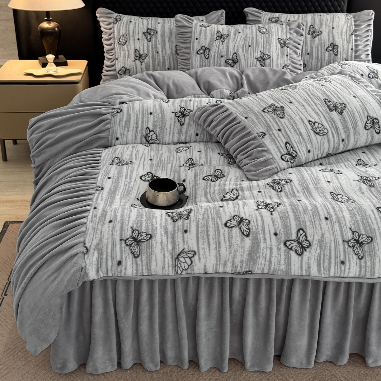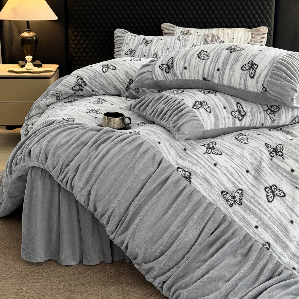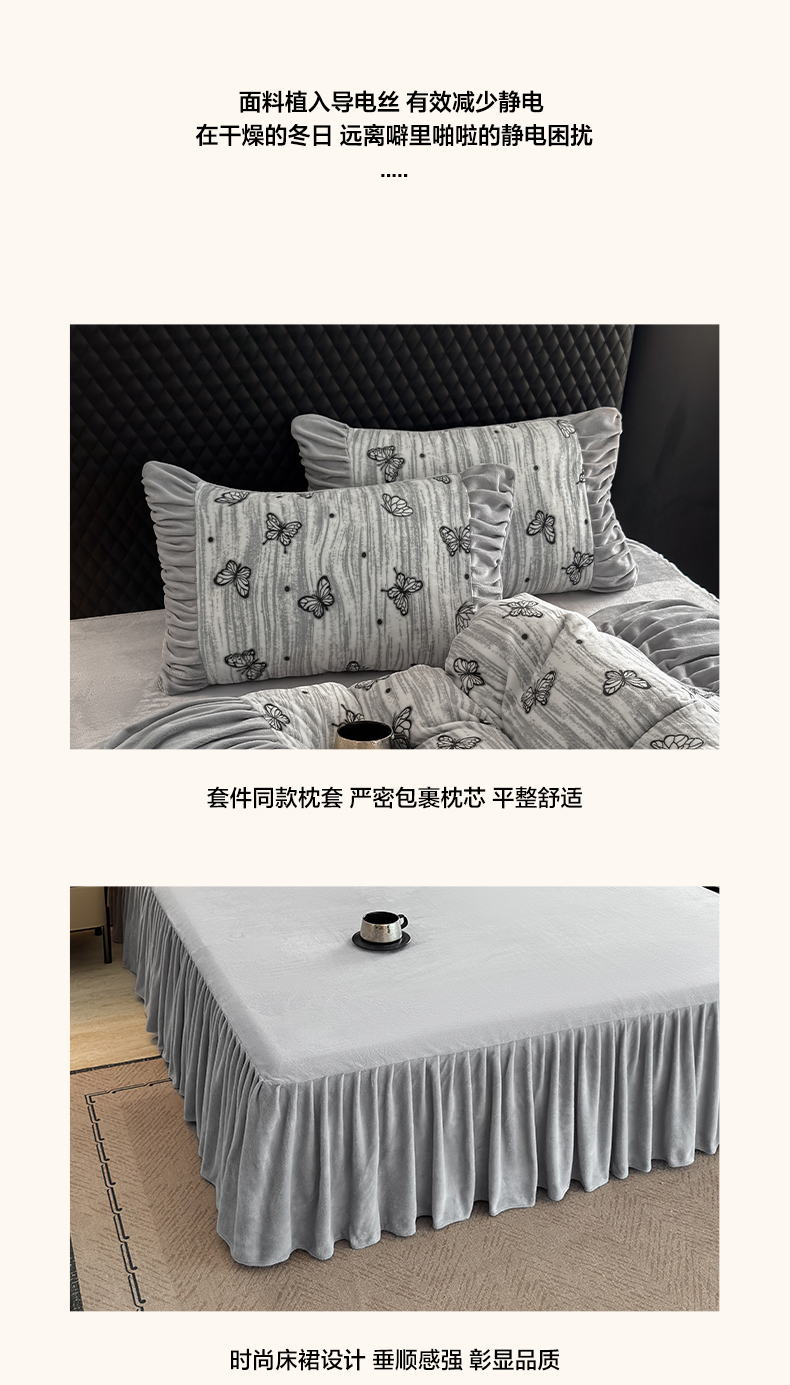 莱登卡奴 2025新款高克重牛奶绒雕花法式轻奢款床单床裙系列四件套 轻奢蝶舞-银灰