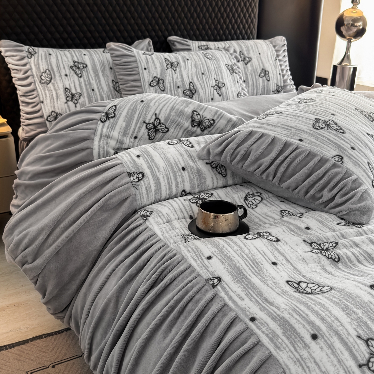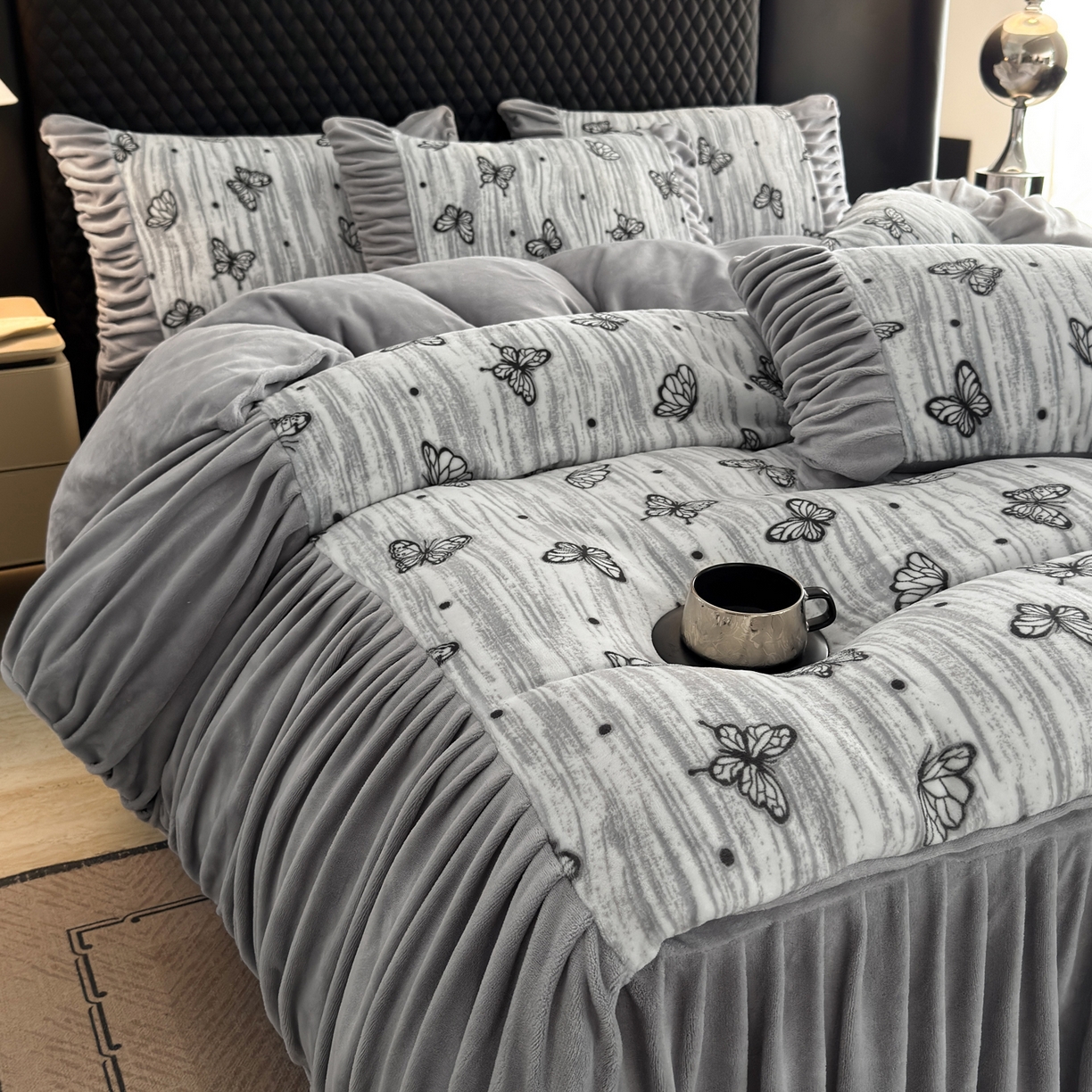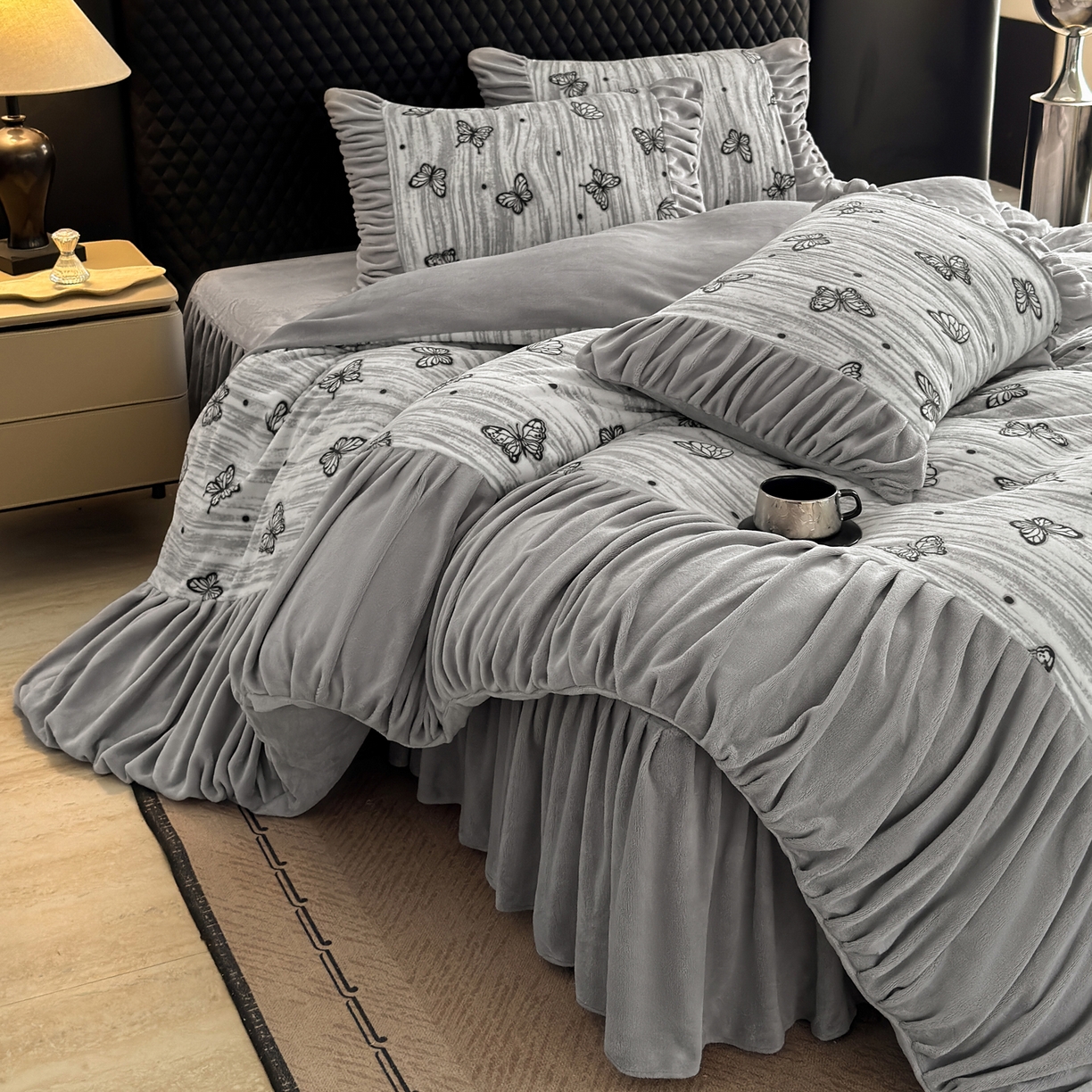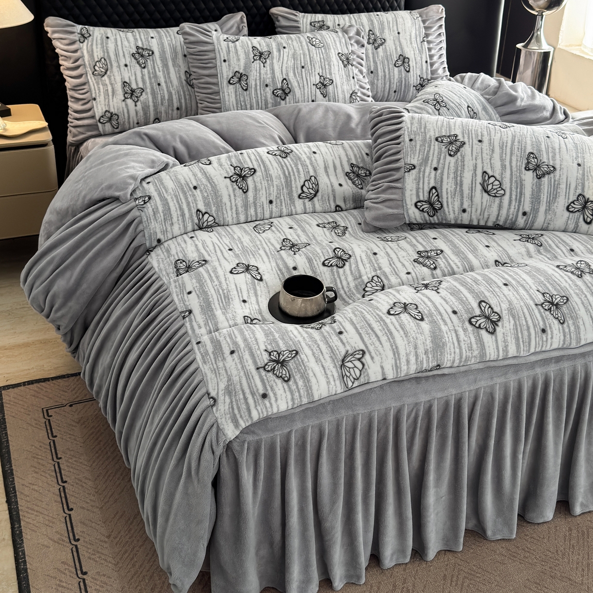 莱登卡奴 2025新款高克重牛奶绒雕花法式轻奢款床单床裙系列四件套 轻奢蝶舞-银灰