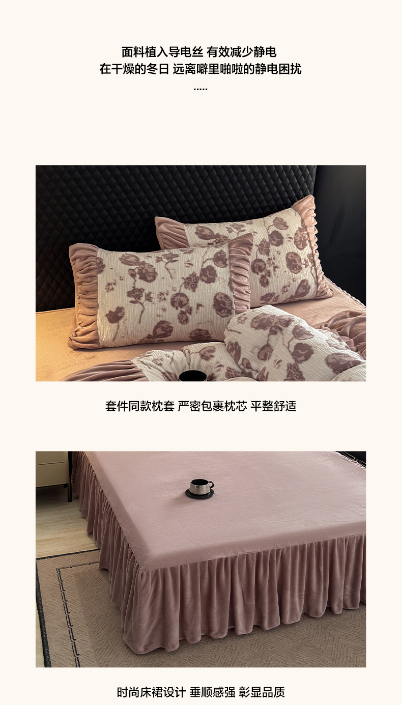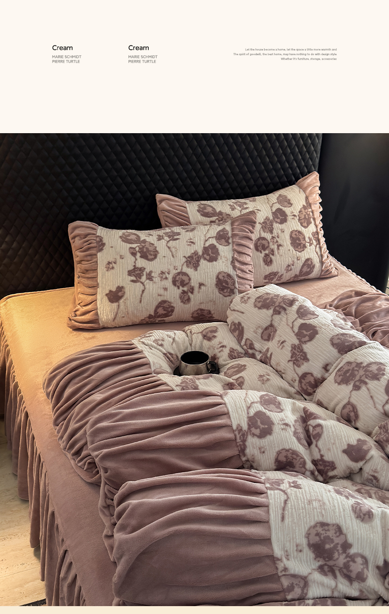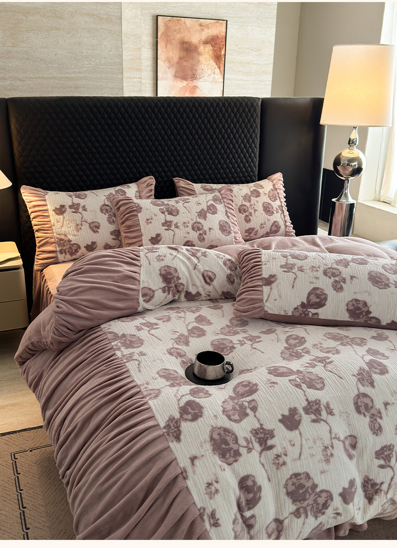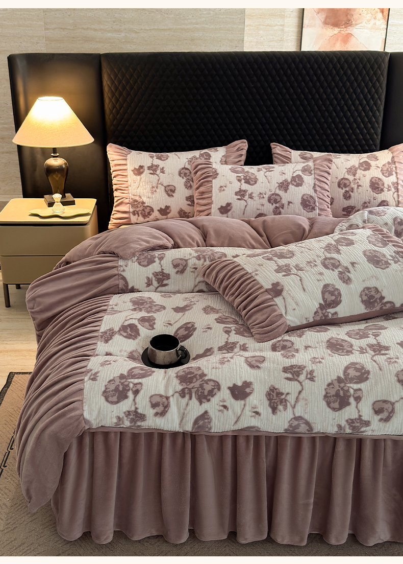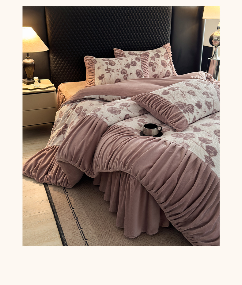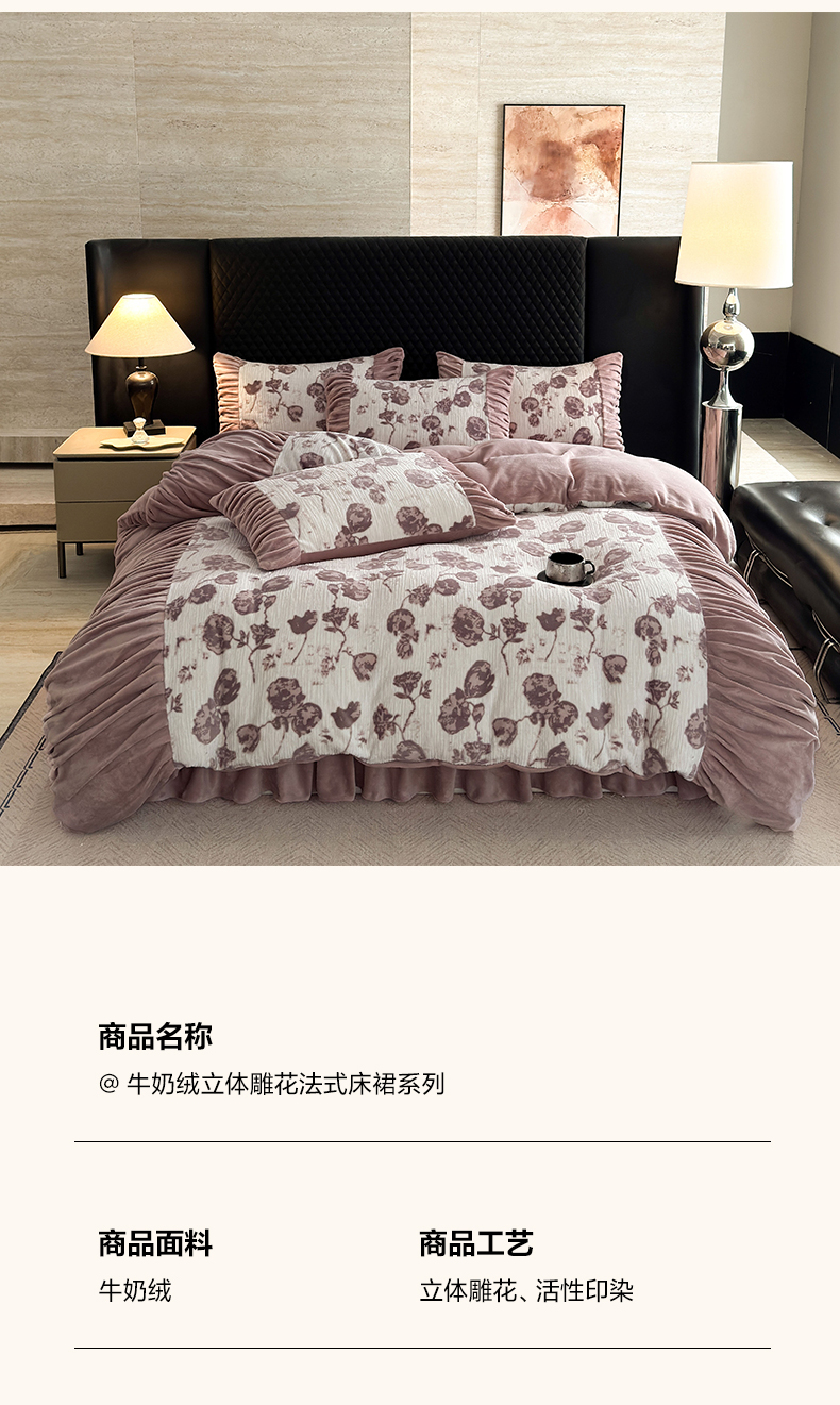 > 莱登卡奴 2025新款高克重牛奶绒雕花法式轻奢款床单床裙系列四件套 轻奢复色-深粉