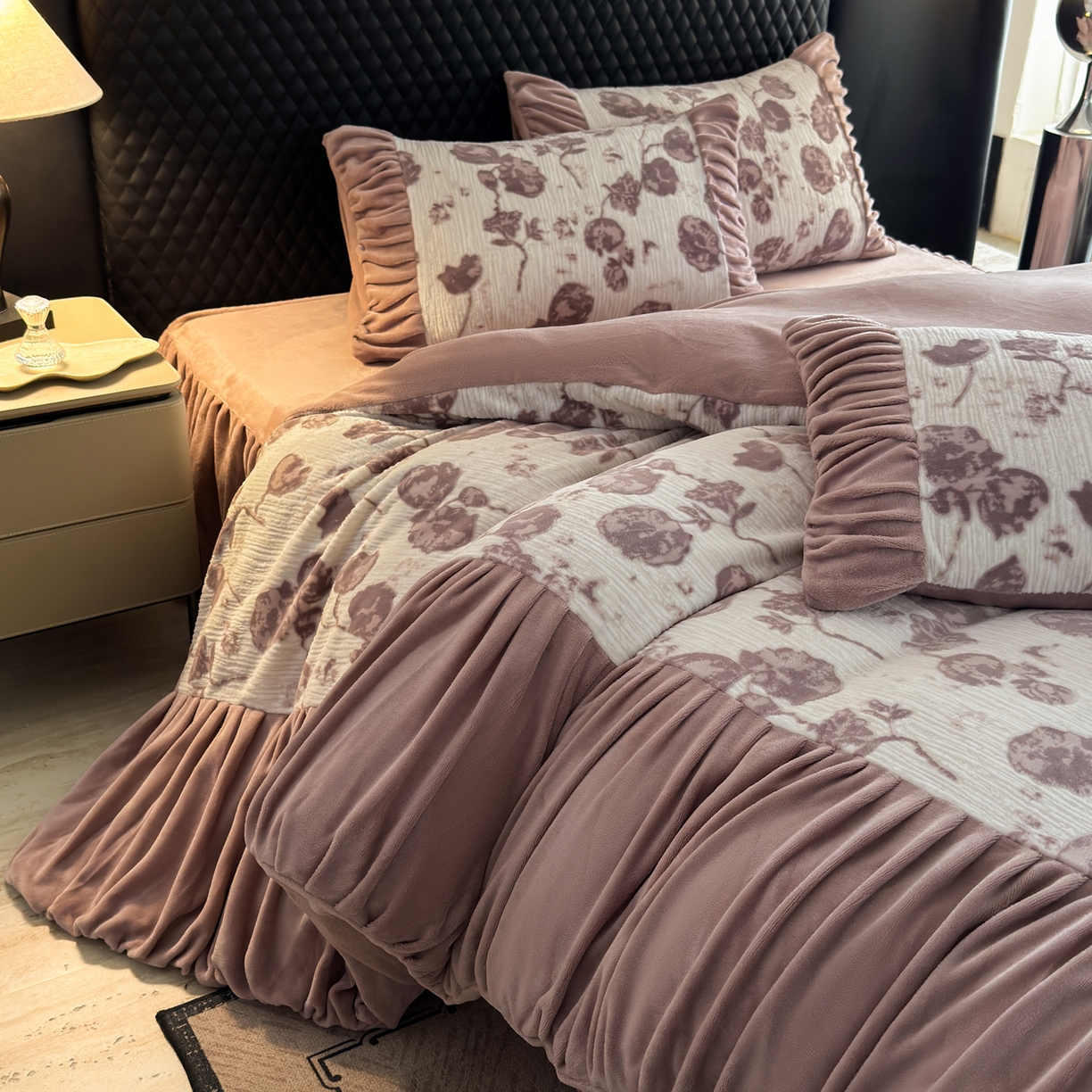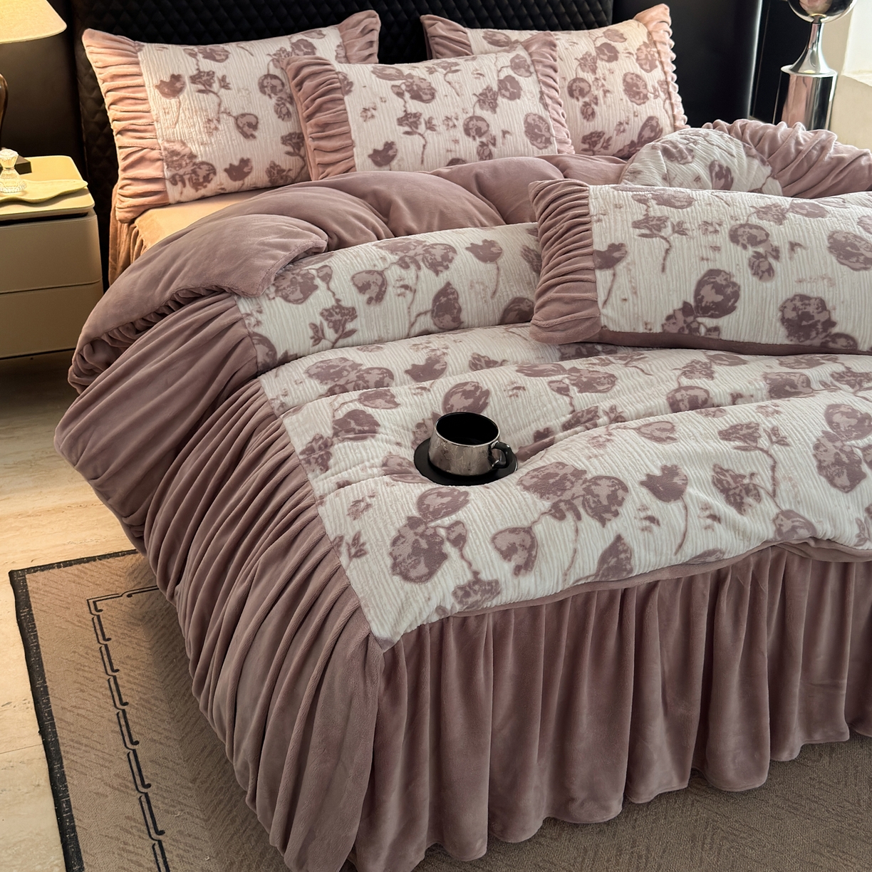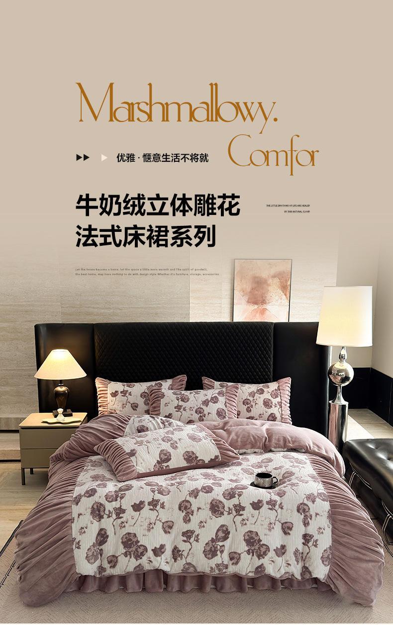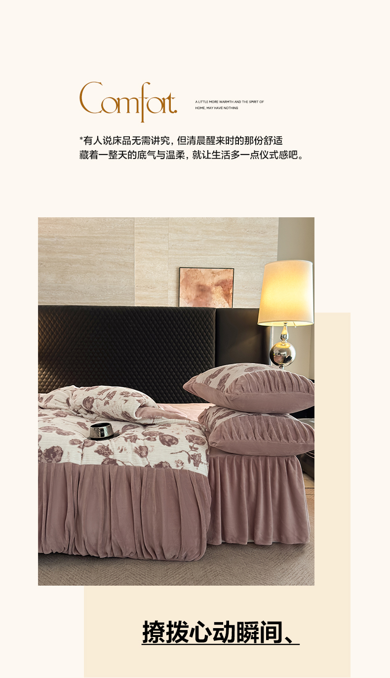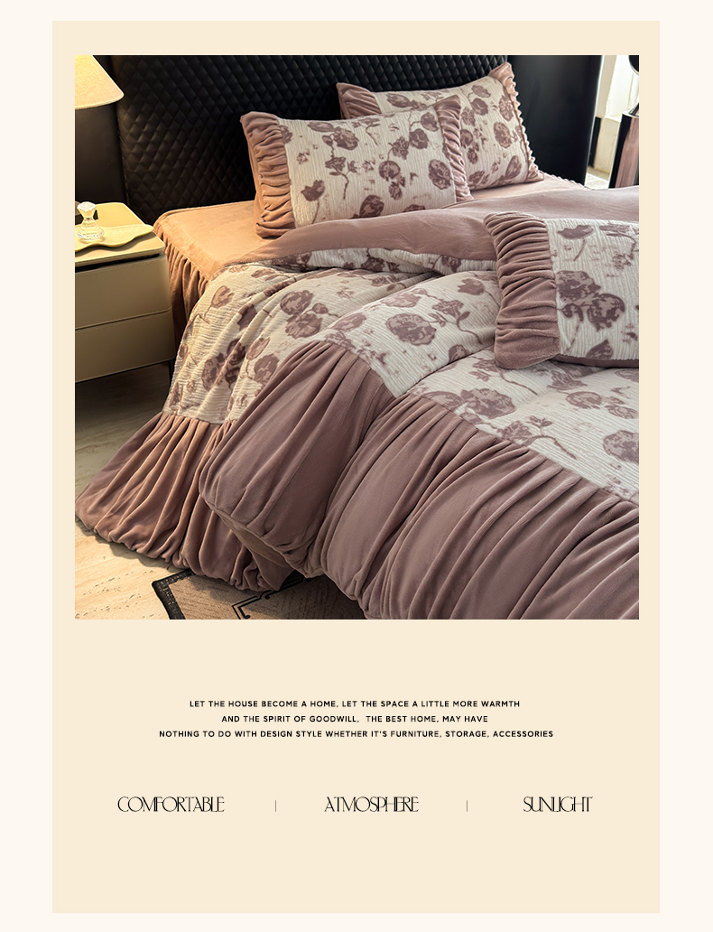 > 莱登卡奴 2025新款高克重牛奶绒雕花法式轻奢款床单床裙系列四件套 轻奢复色-深粉
