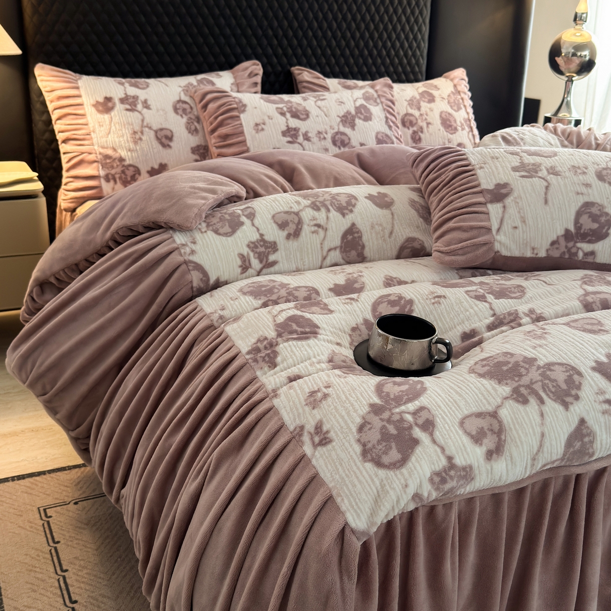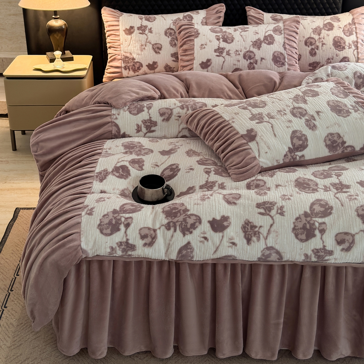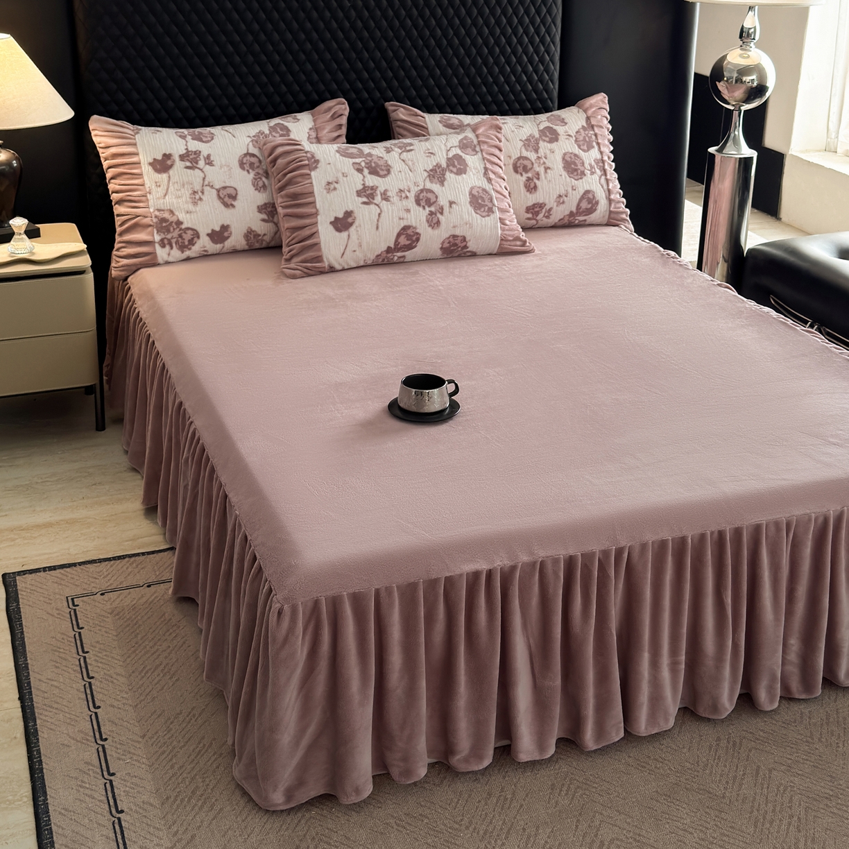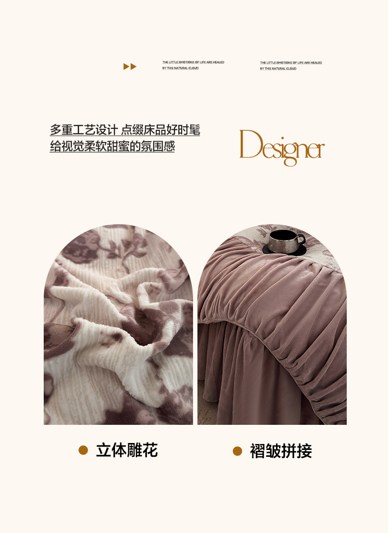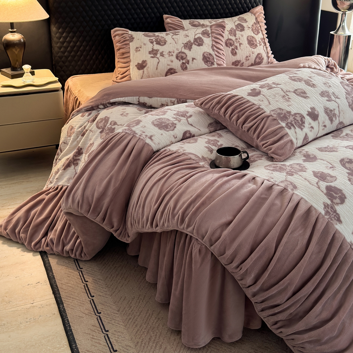 > 莱登卡奴 2025新款高克重牛奶绒雕花法式轻奢款床单床裙系列四件套 轻奢复色-深粉