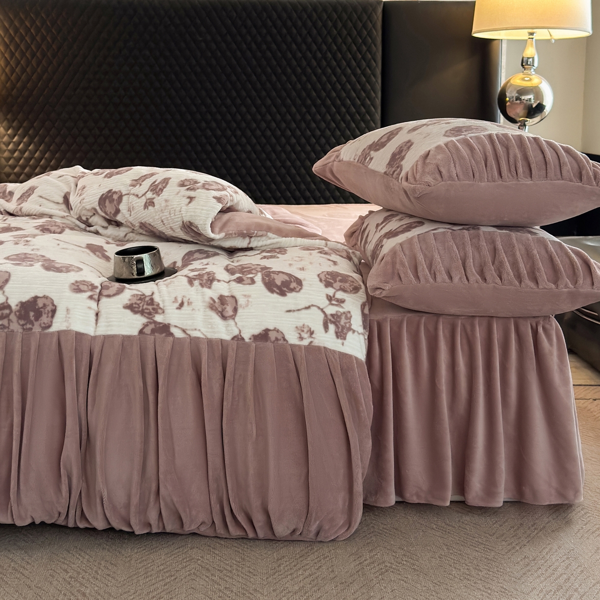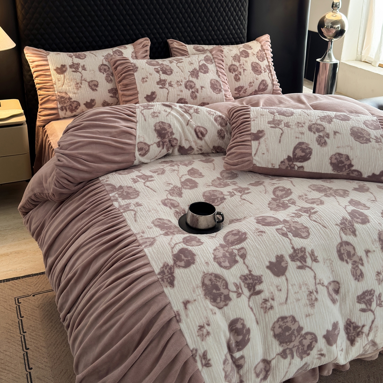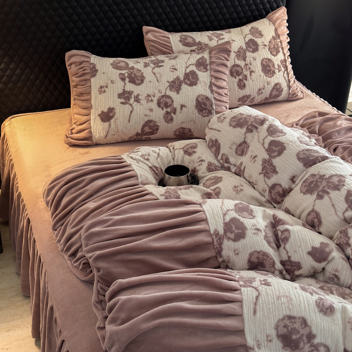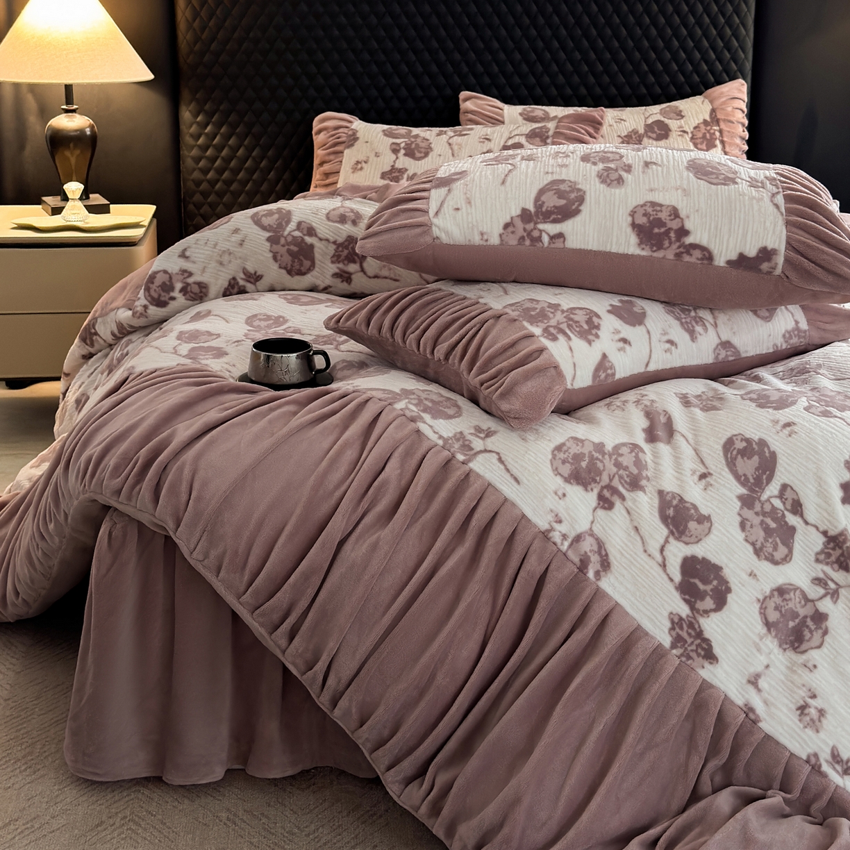 > 莱登卡奴 2025新款高克重牛奶绒雕花法式轻奢款床单床裙系列四件套 轻奢复色-深粉