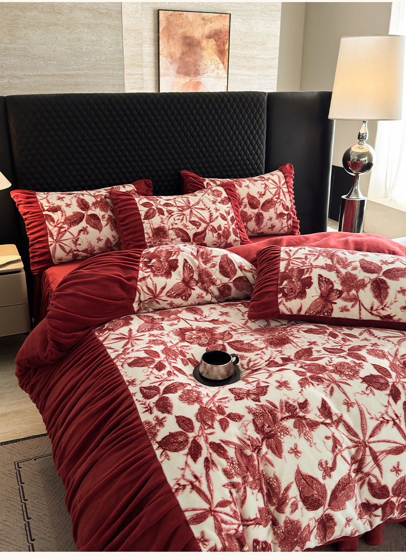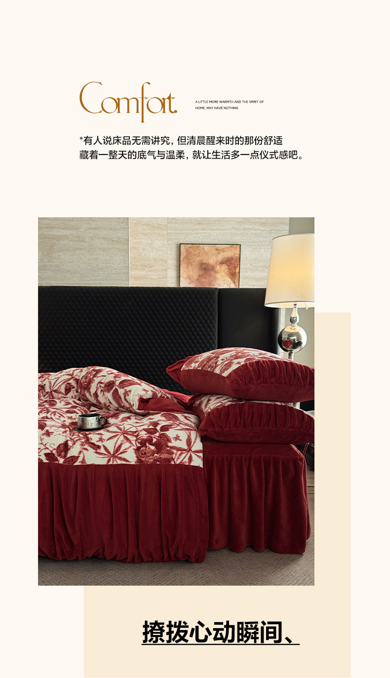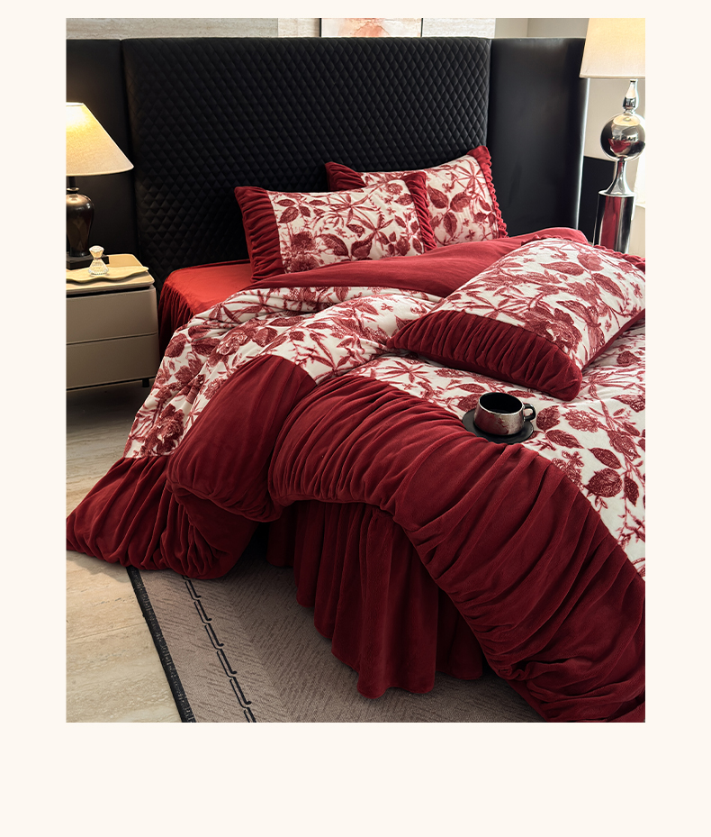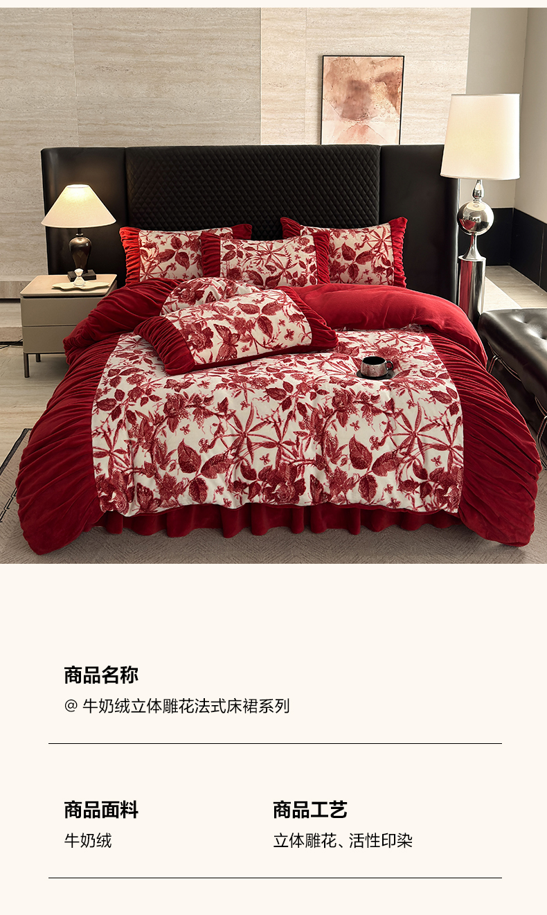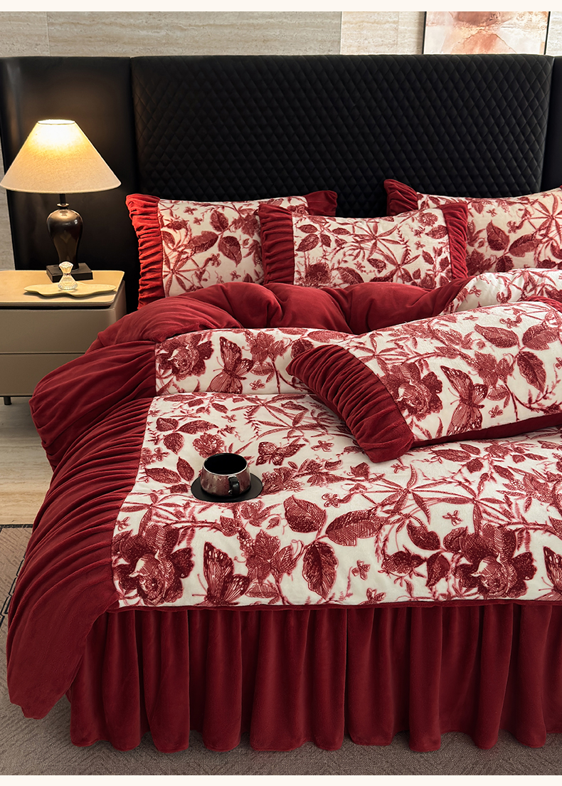 > 莱登卡奴 2025新款高克重牛奶绒雕花法式轻奢款床单床裙系列四件套 轻奢花语-酒红