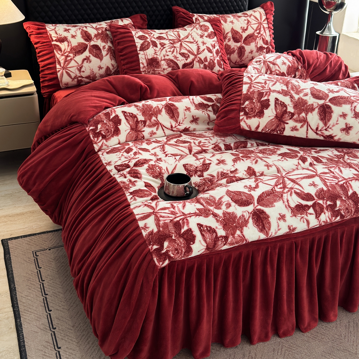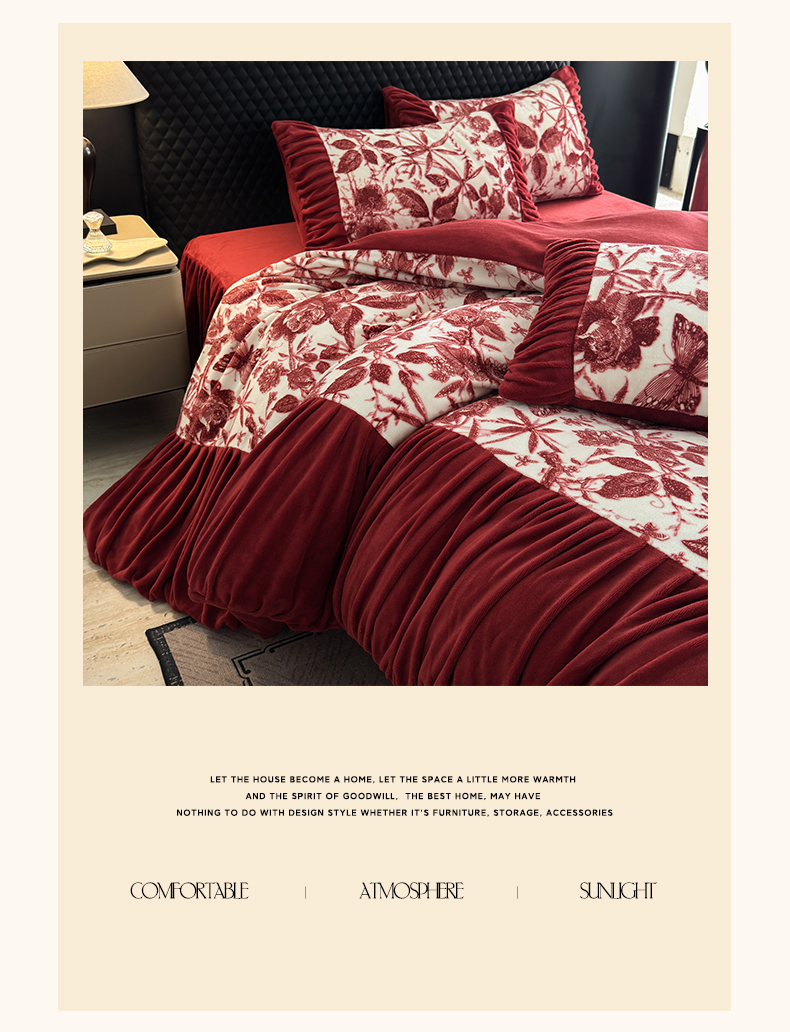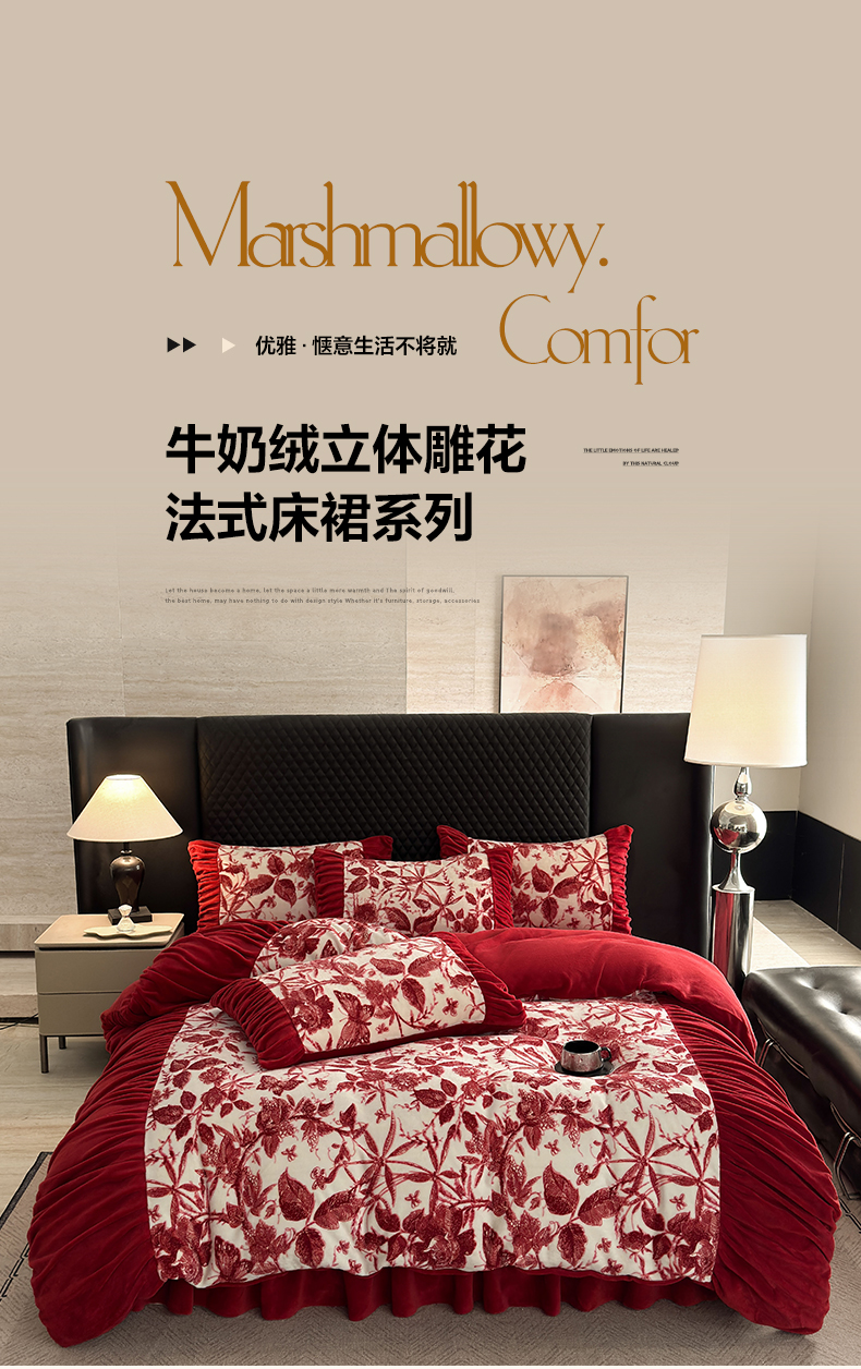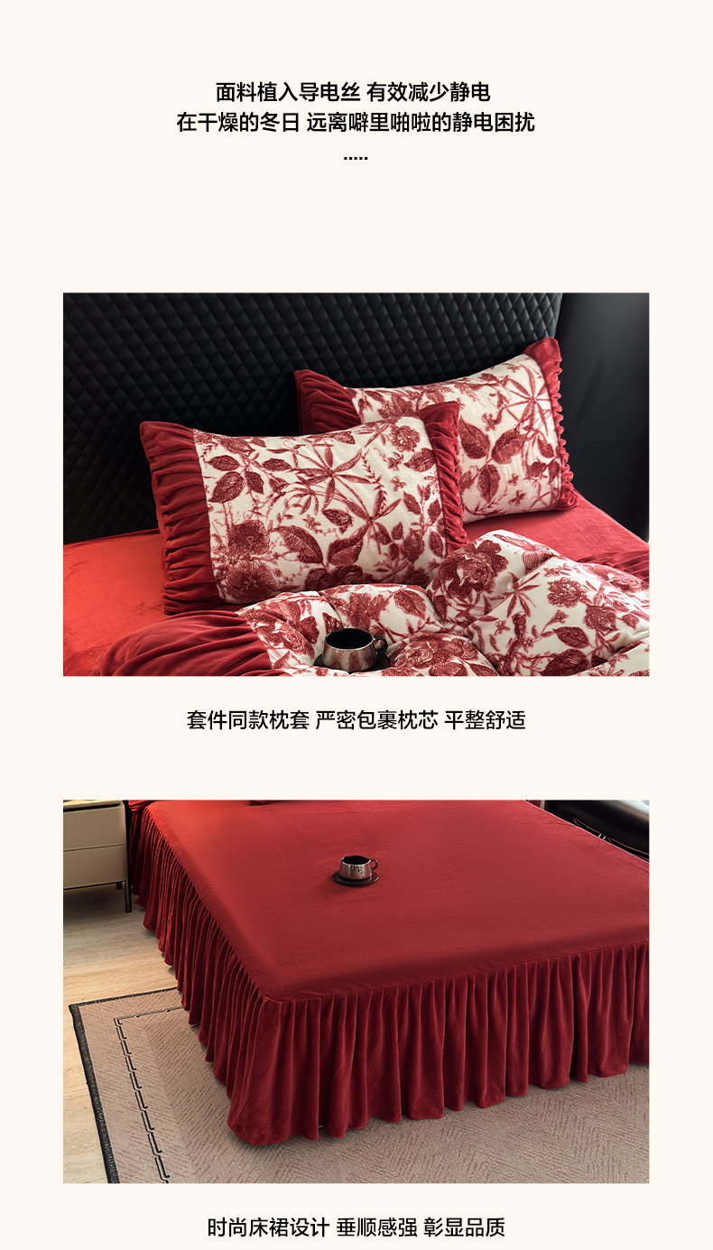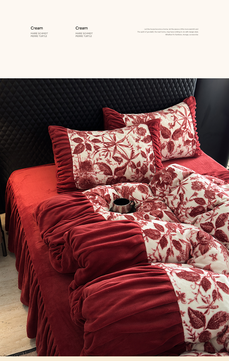 > 莱登卡奴 2025新款高克重牛奶绒雕花法式轻奢款床单床裙系列四件套 轻奢花语-酒红