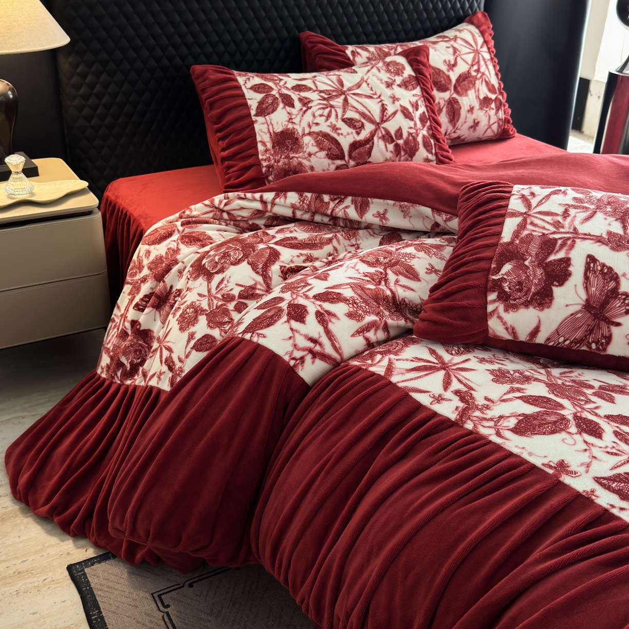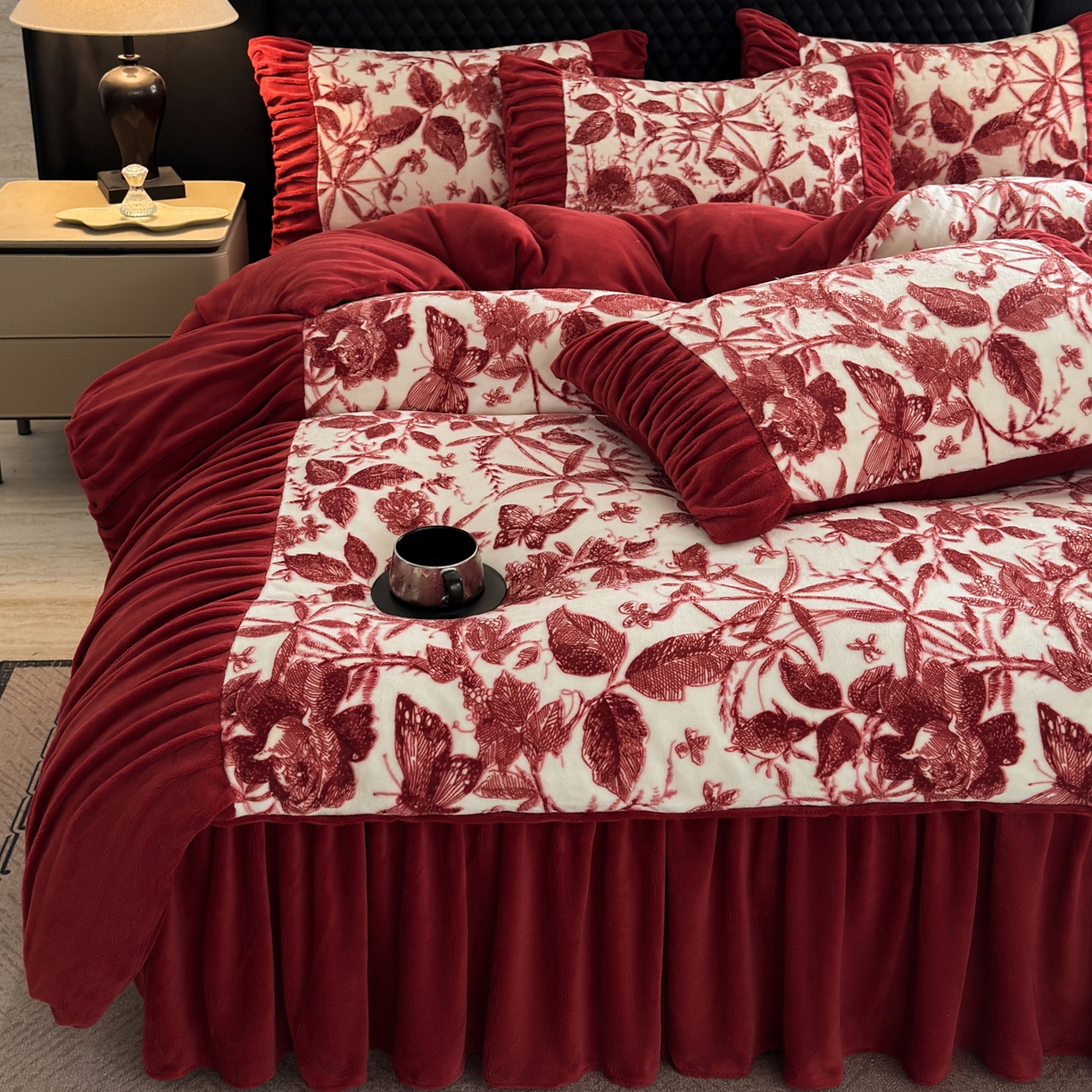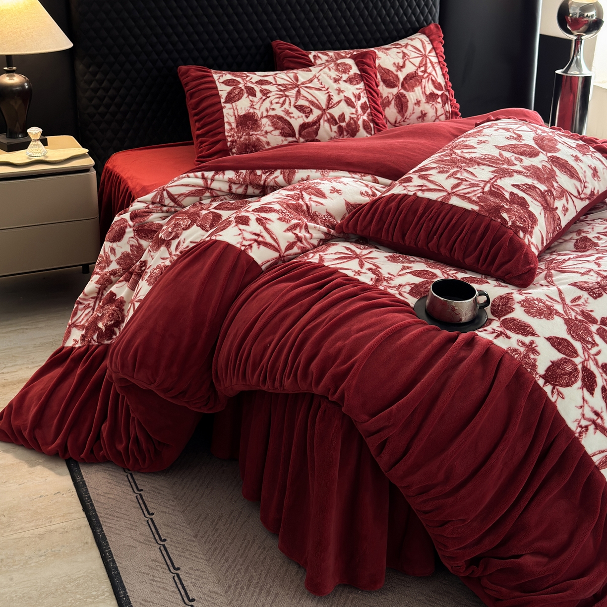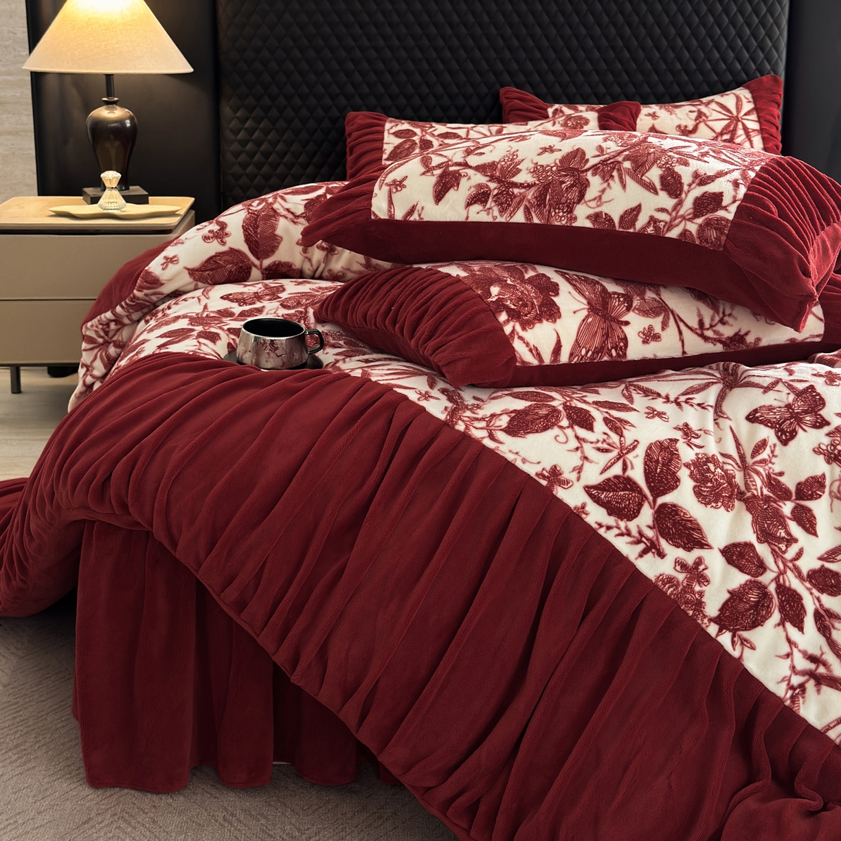 > 莱登卡奴 2025新款高克重牛奶绒雕花法式轻奢款床单床裙系列四件套 轻奢花语-酒红