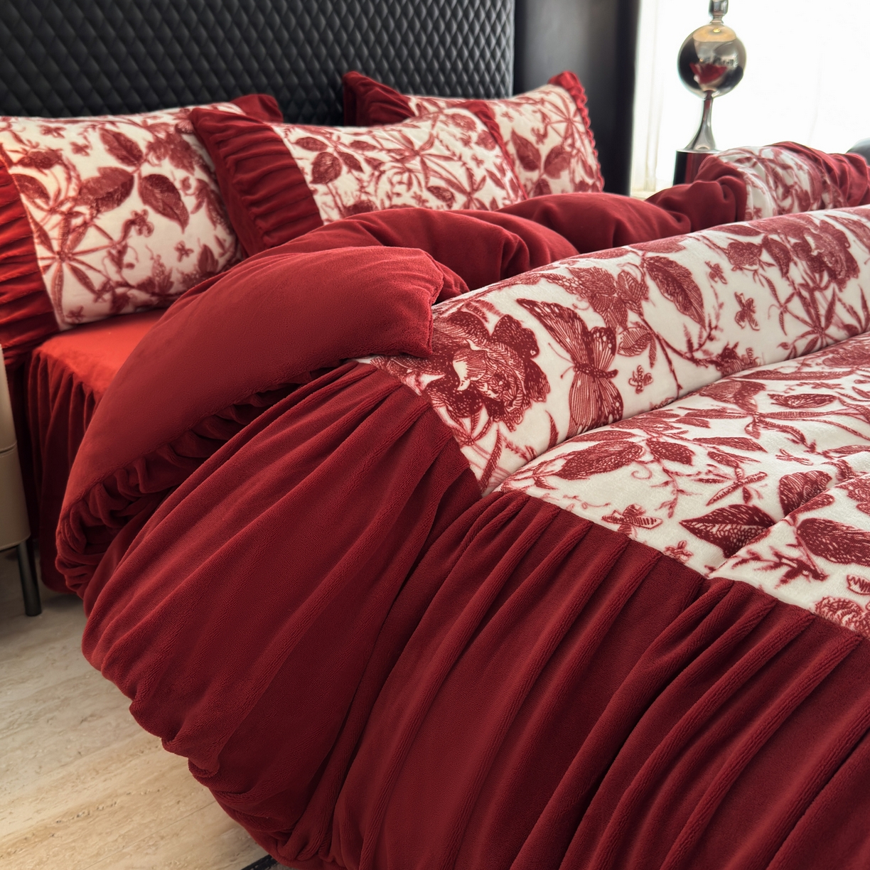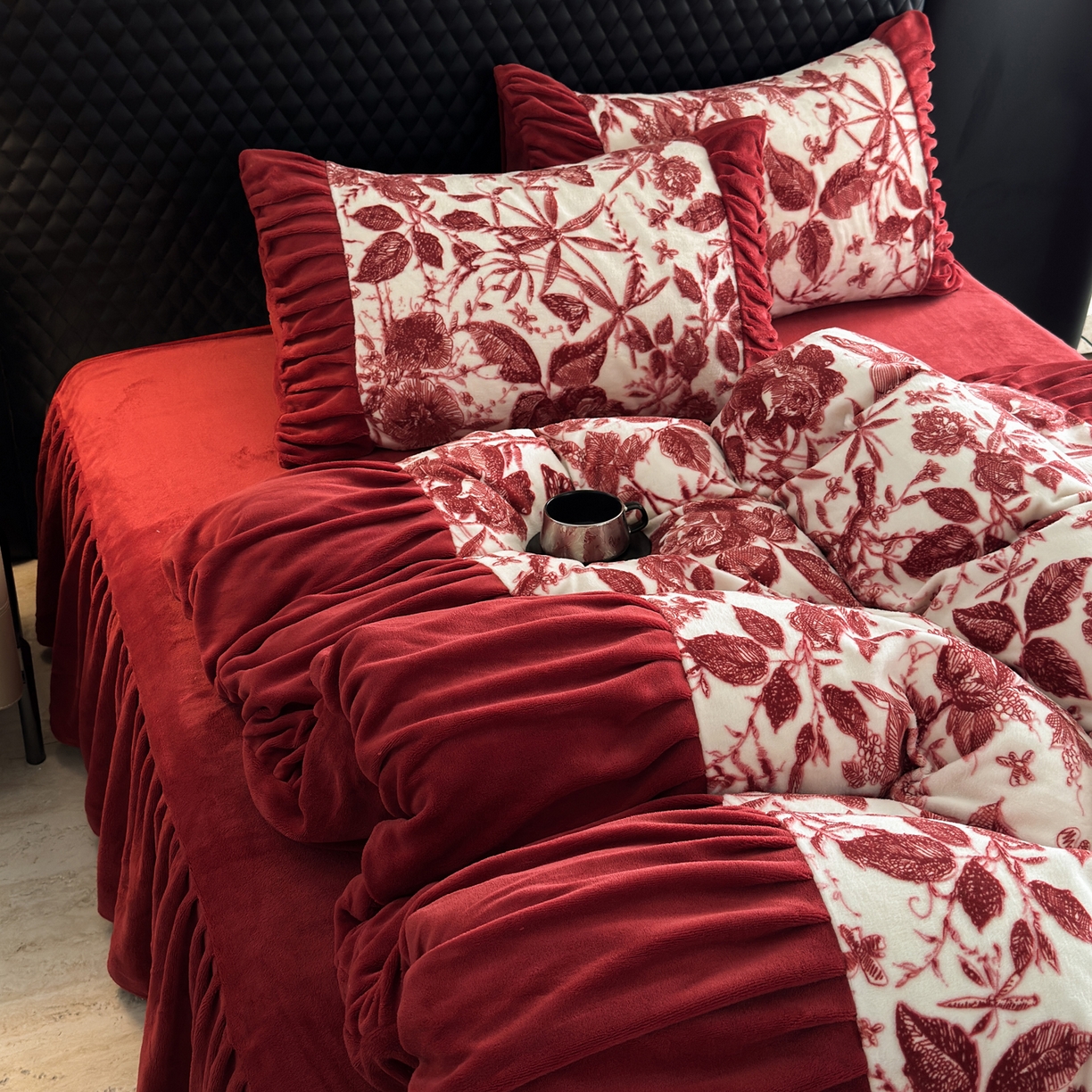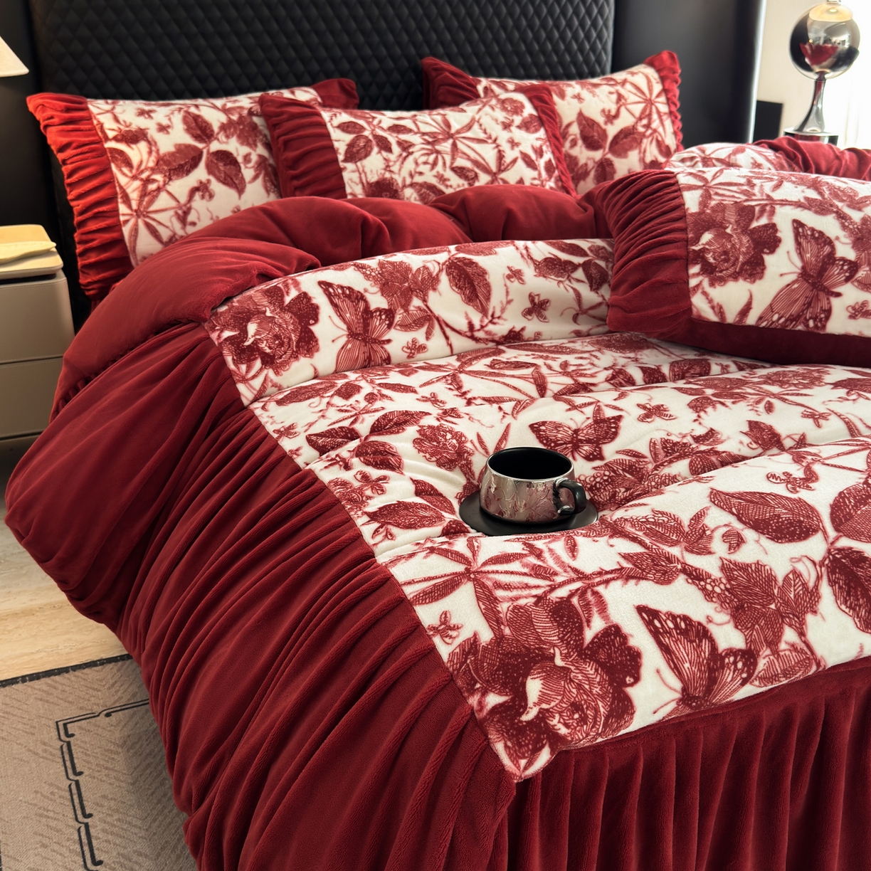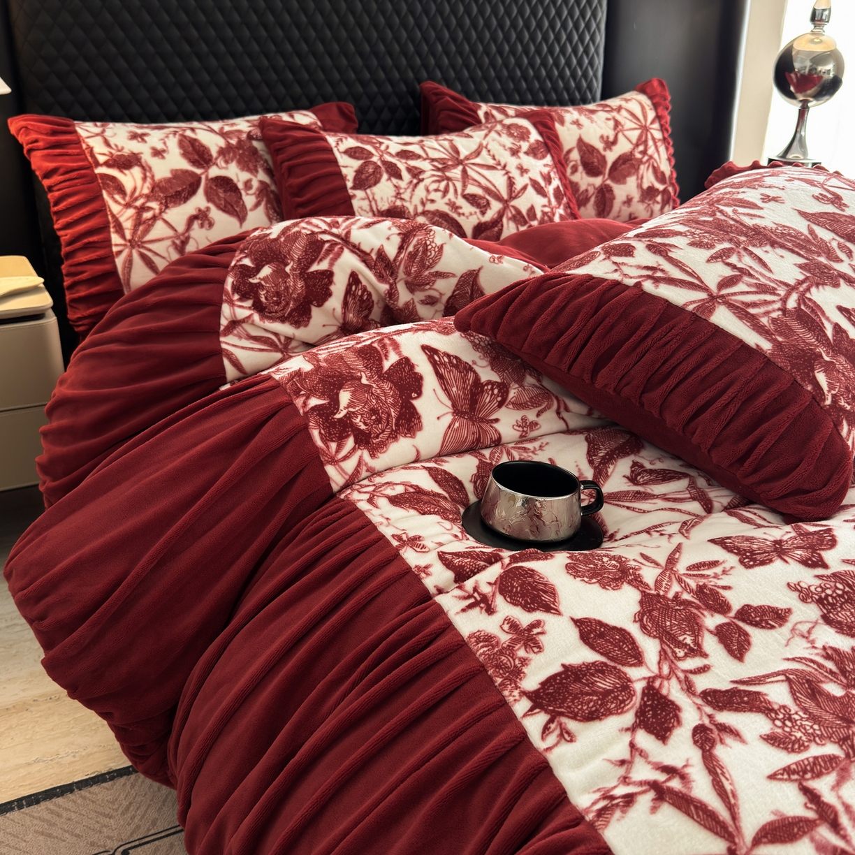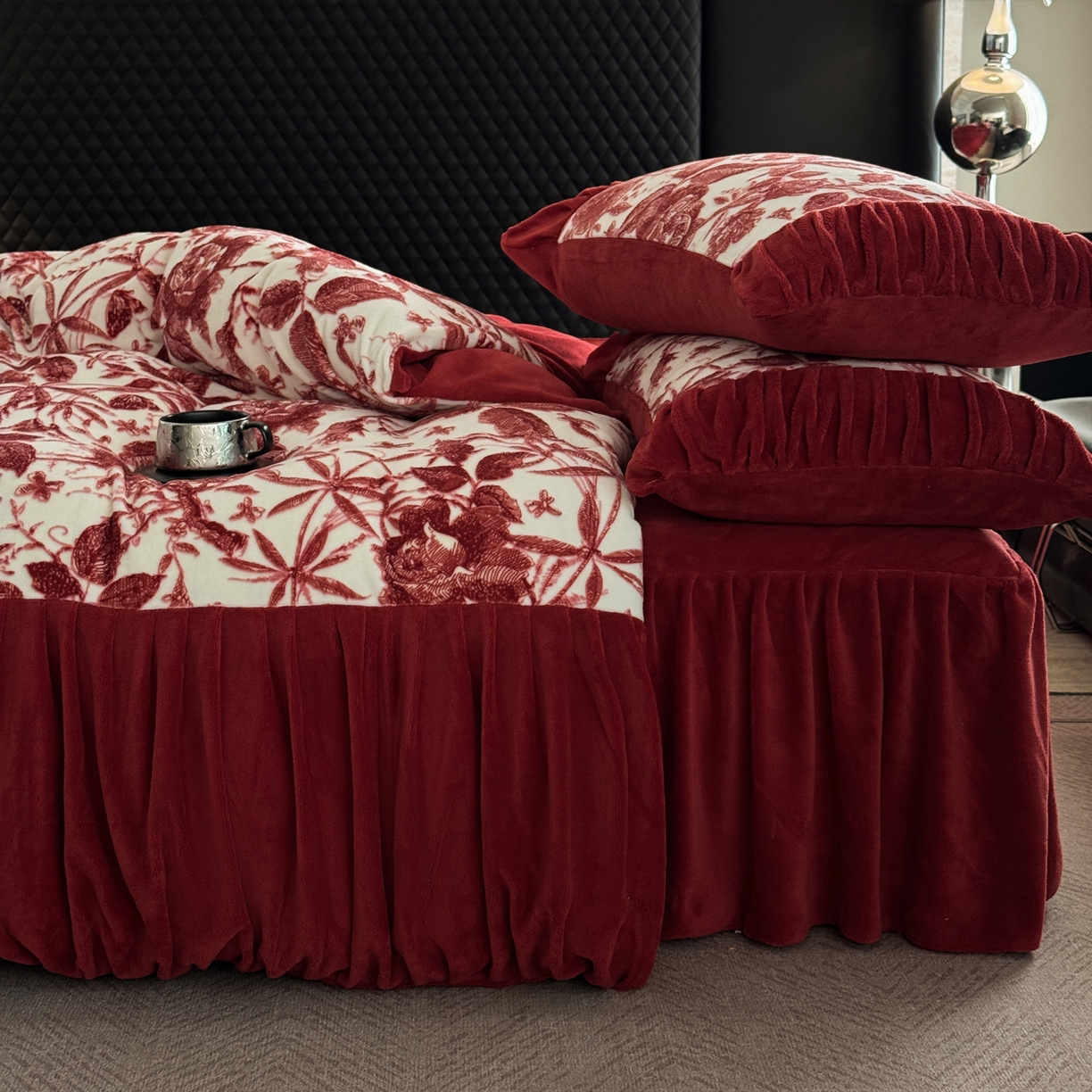 > 莱登卡奴 2025新款高克重牛奶绒雕花法式轻奢款床单床裙系列四件套 轻奢花语-酒红