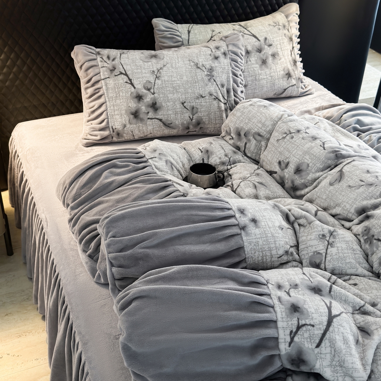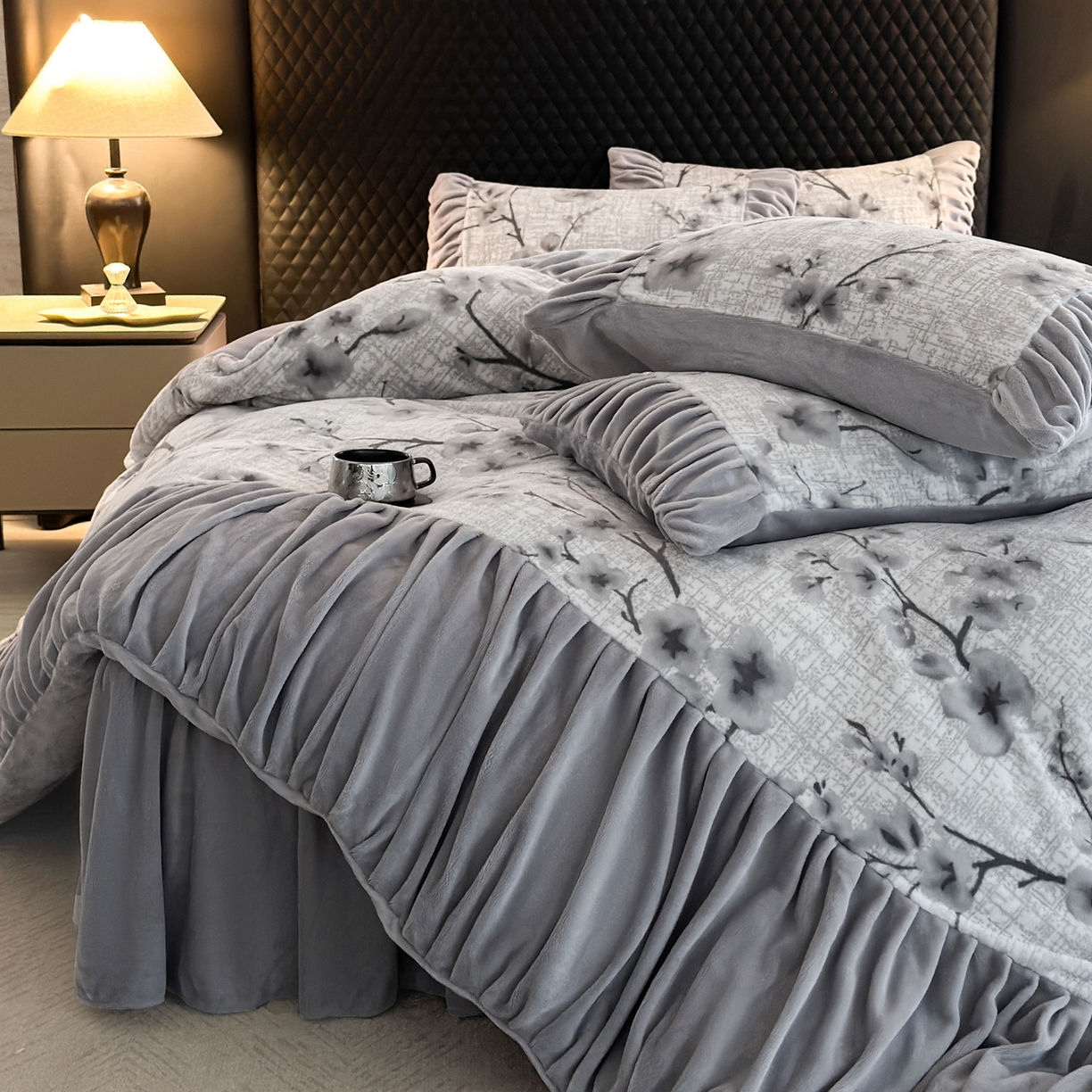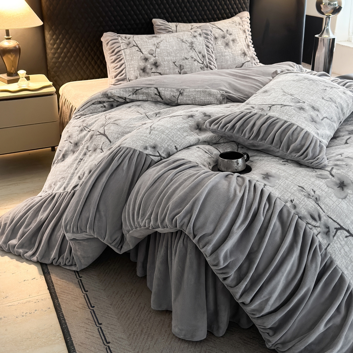 莱登卡奴 2025新款高克重牛奶绒雕花法式轻奢款床单床裙系列四件套 轻奢琳瑜-银灰
