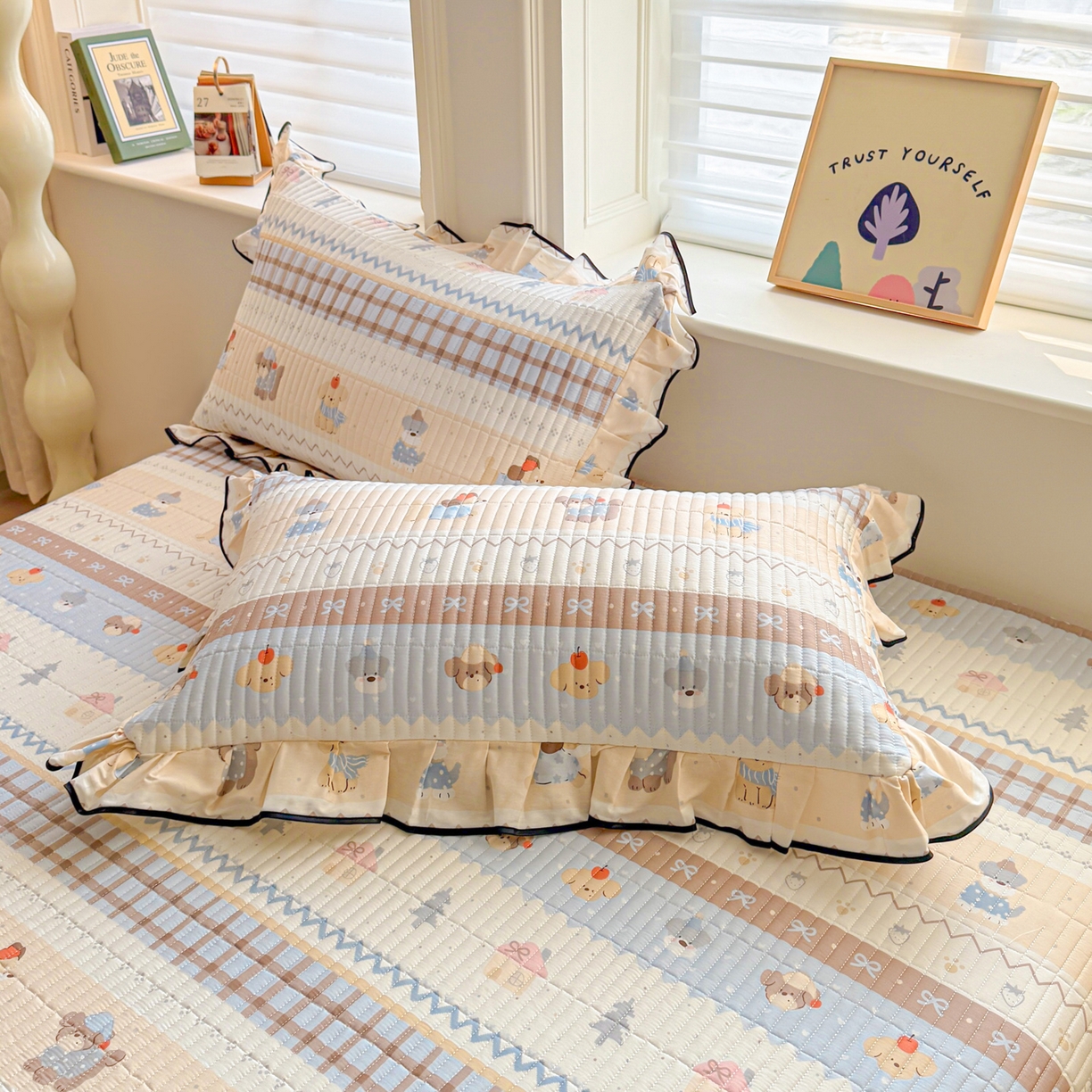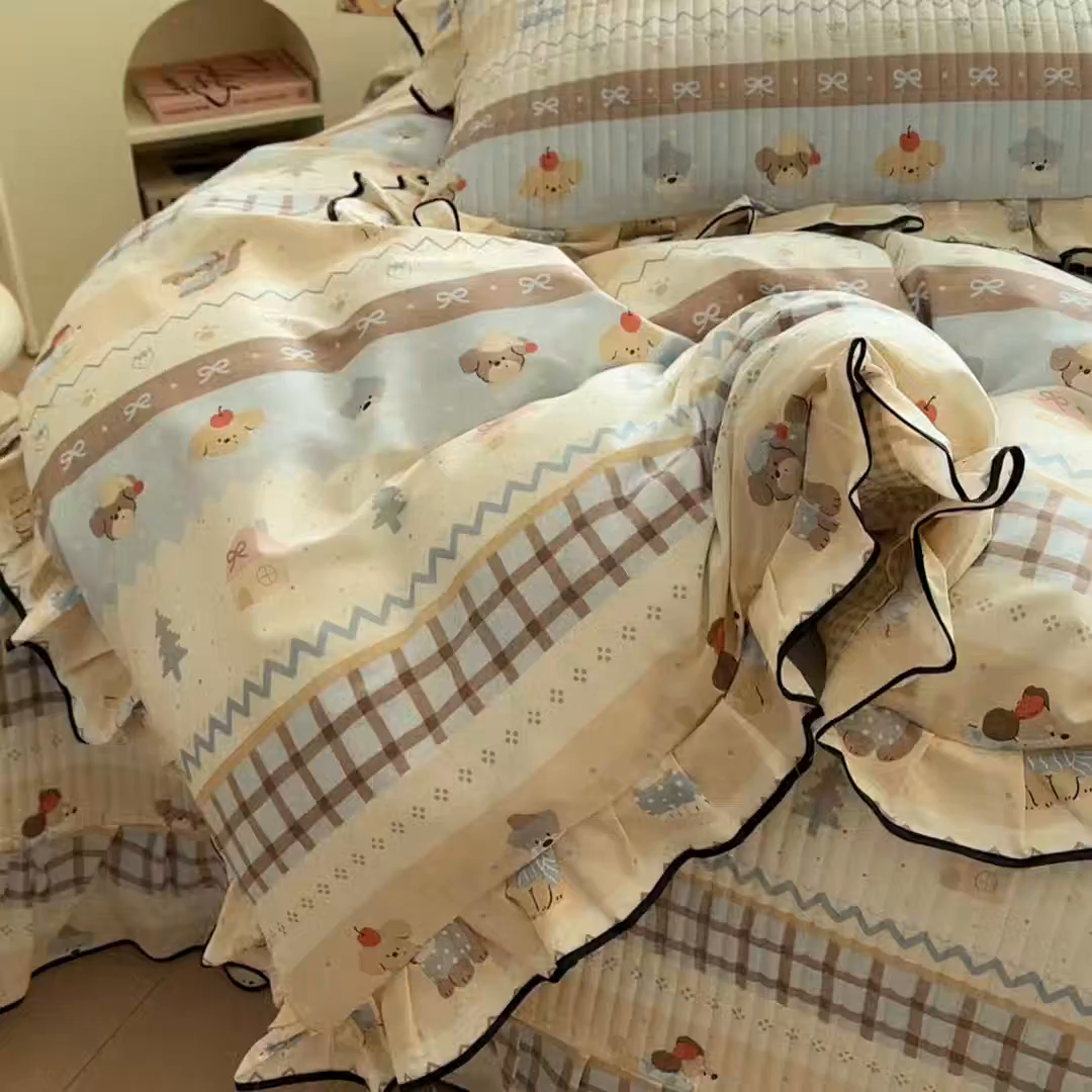 > 莱登卡奴 2026新款全棉A类小清新花边床盖款系列四件套 费尔岛小狗