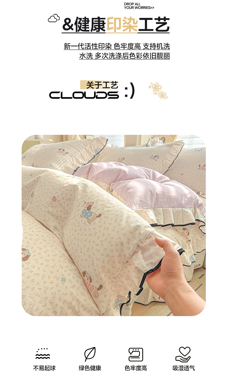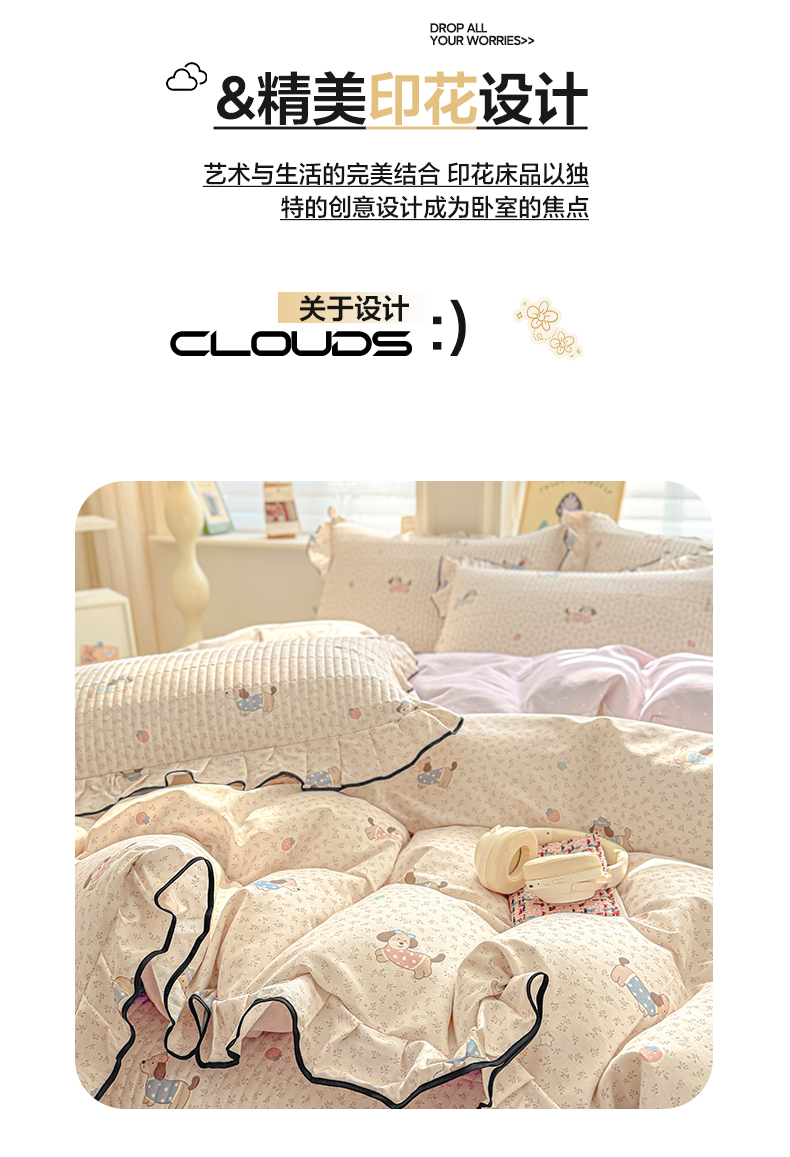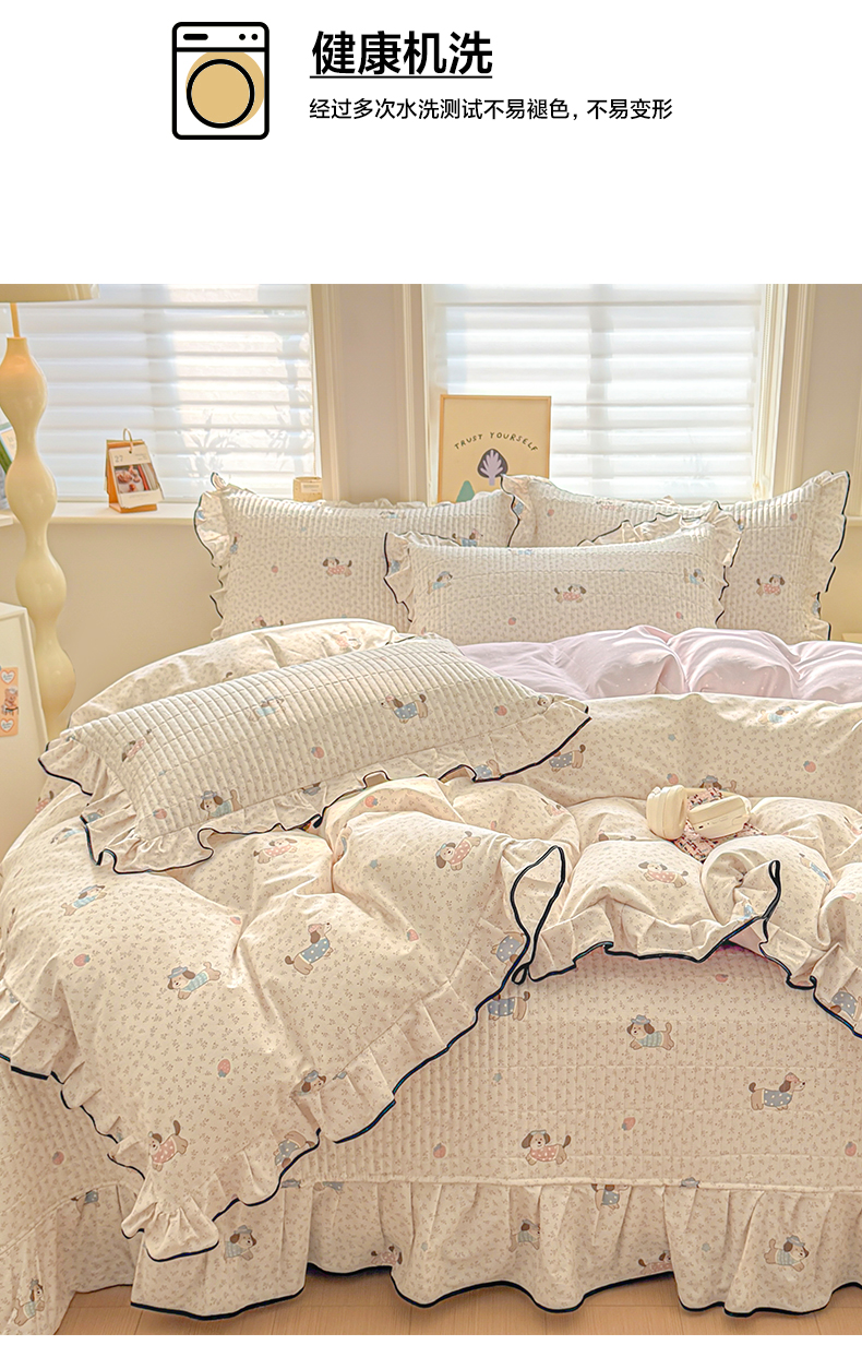 莱登卡奴 2026新款全棉A类小清新花边床盖款系列四件套 草莓腊肠狗