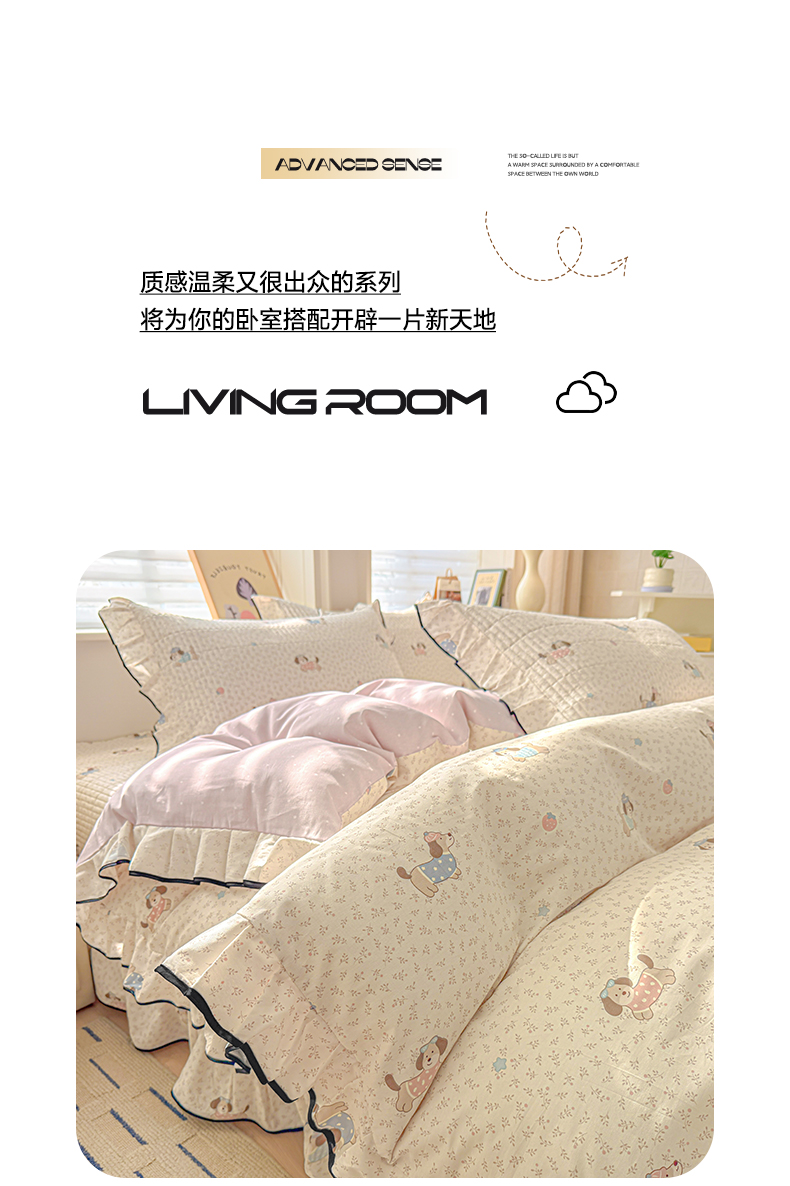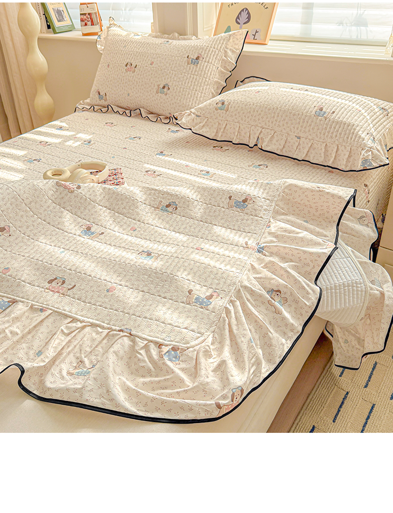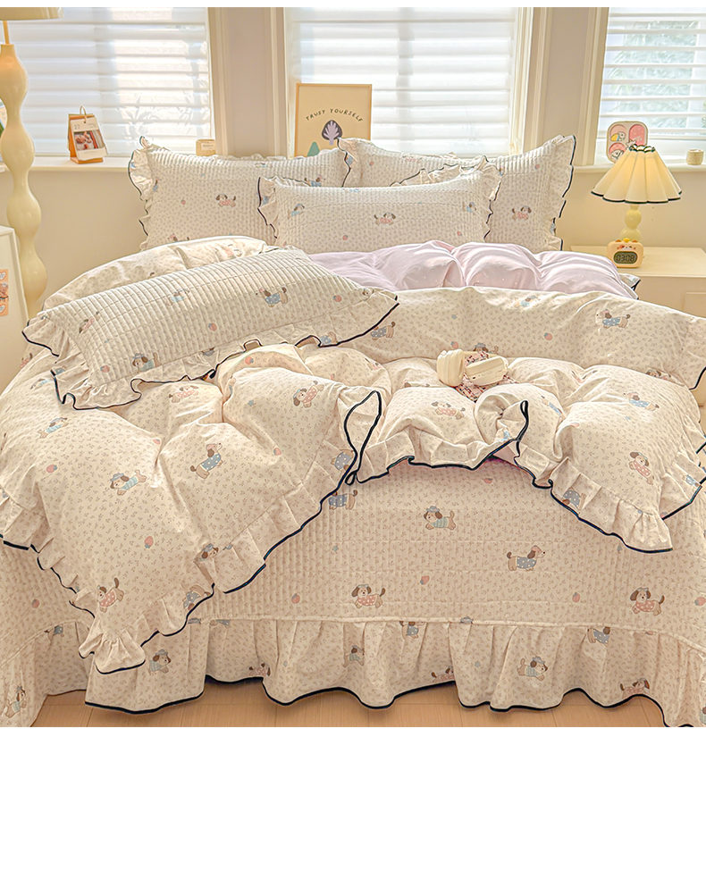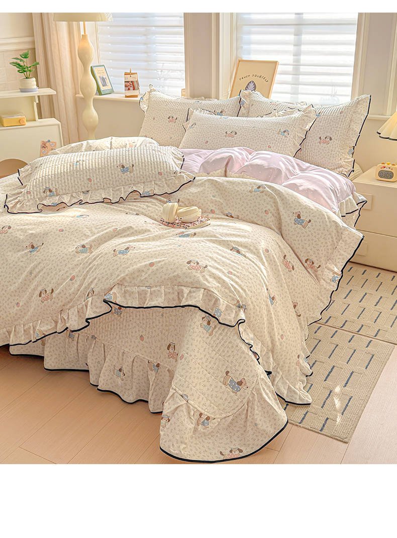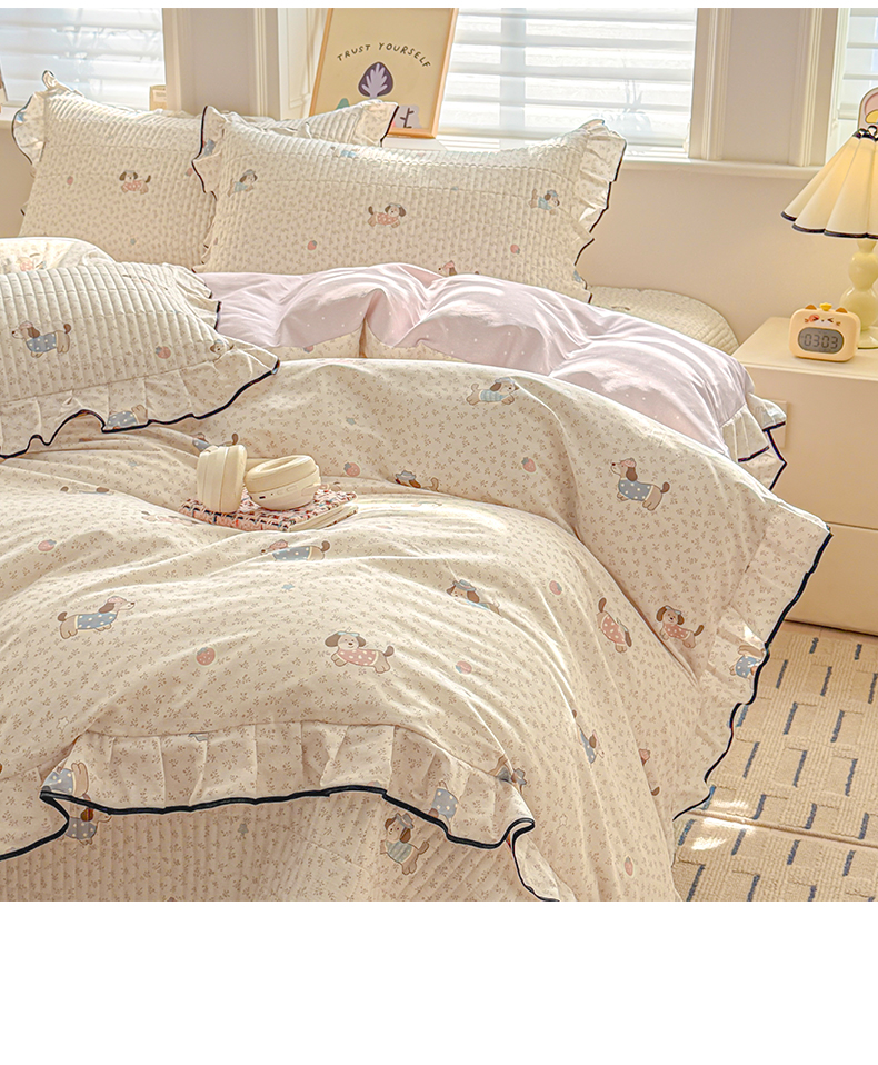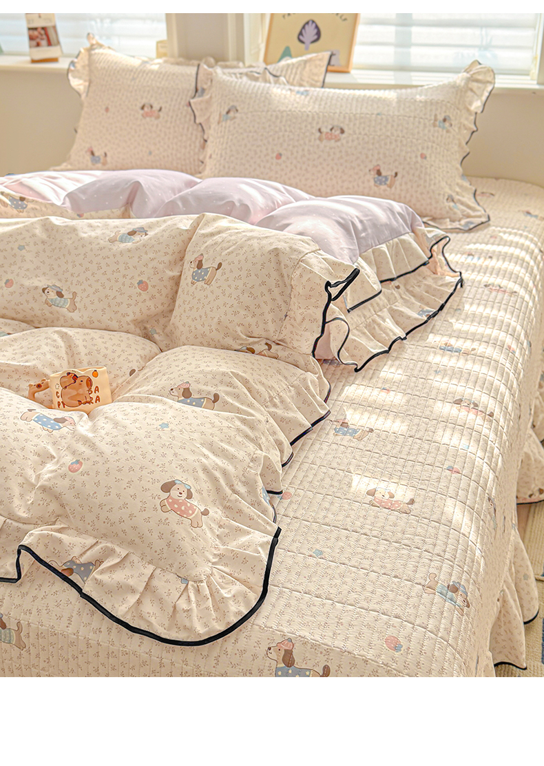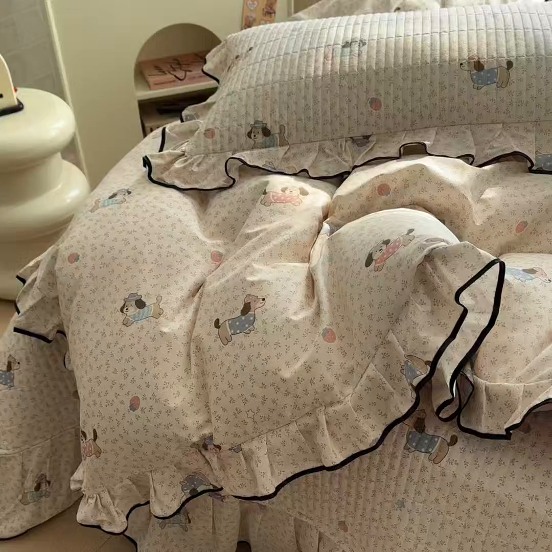 > 莱登卡奴 2026新款全棉A类小清新花边床盖款系列四件套 草莓腊肠狗