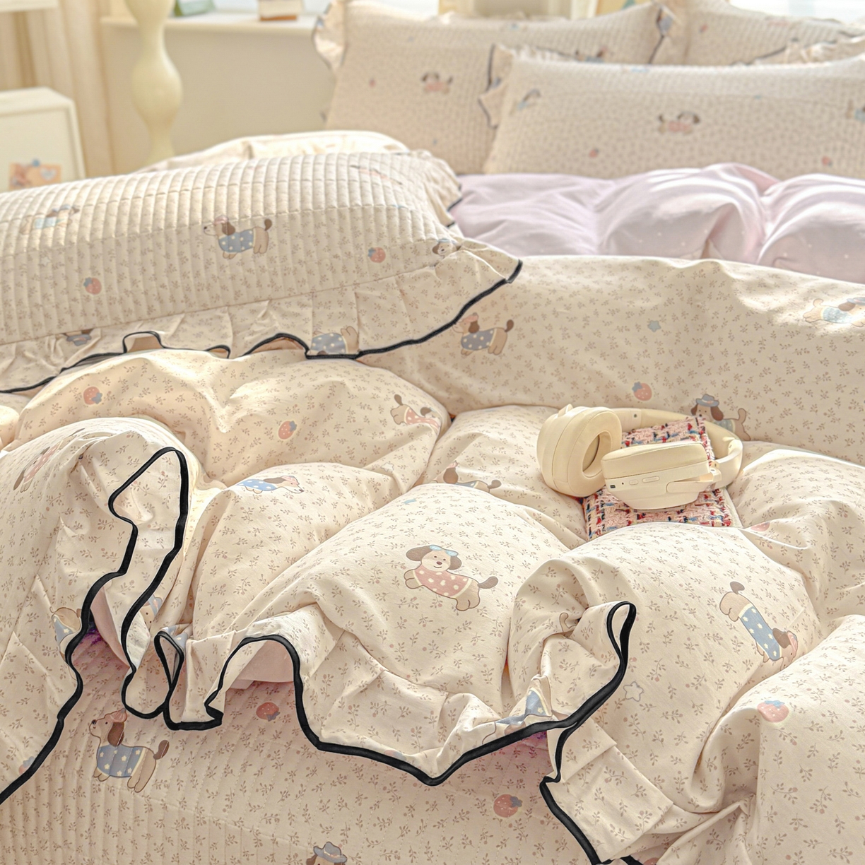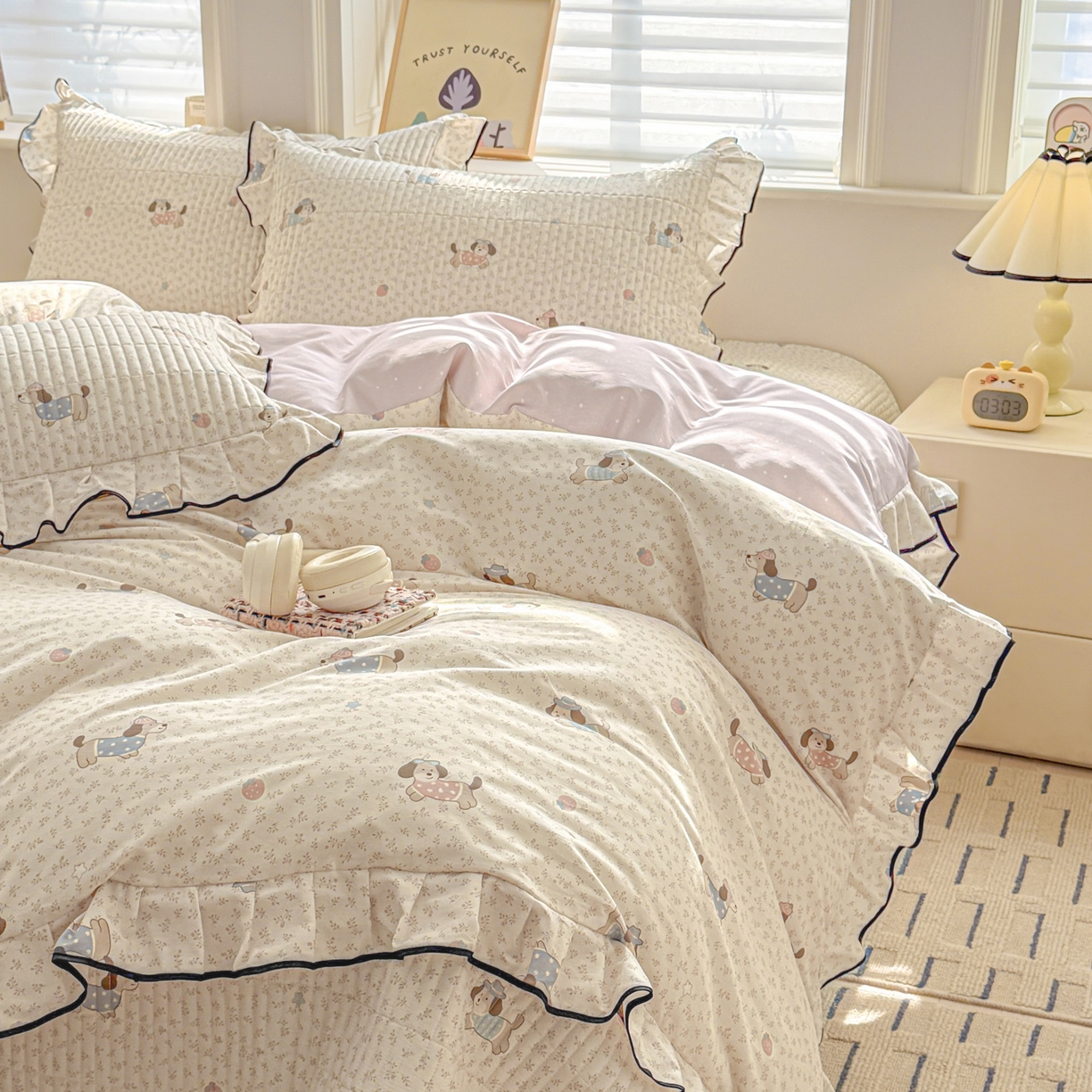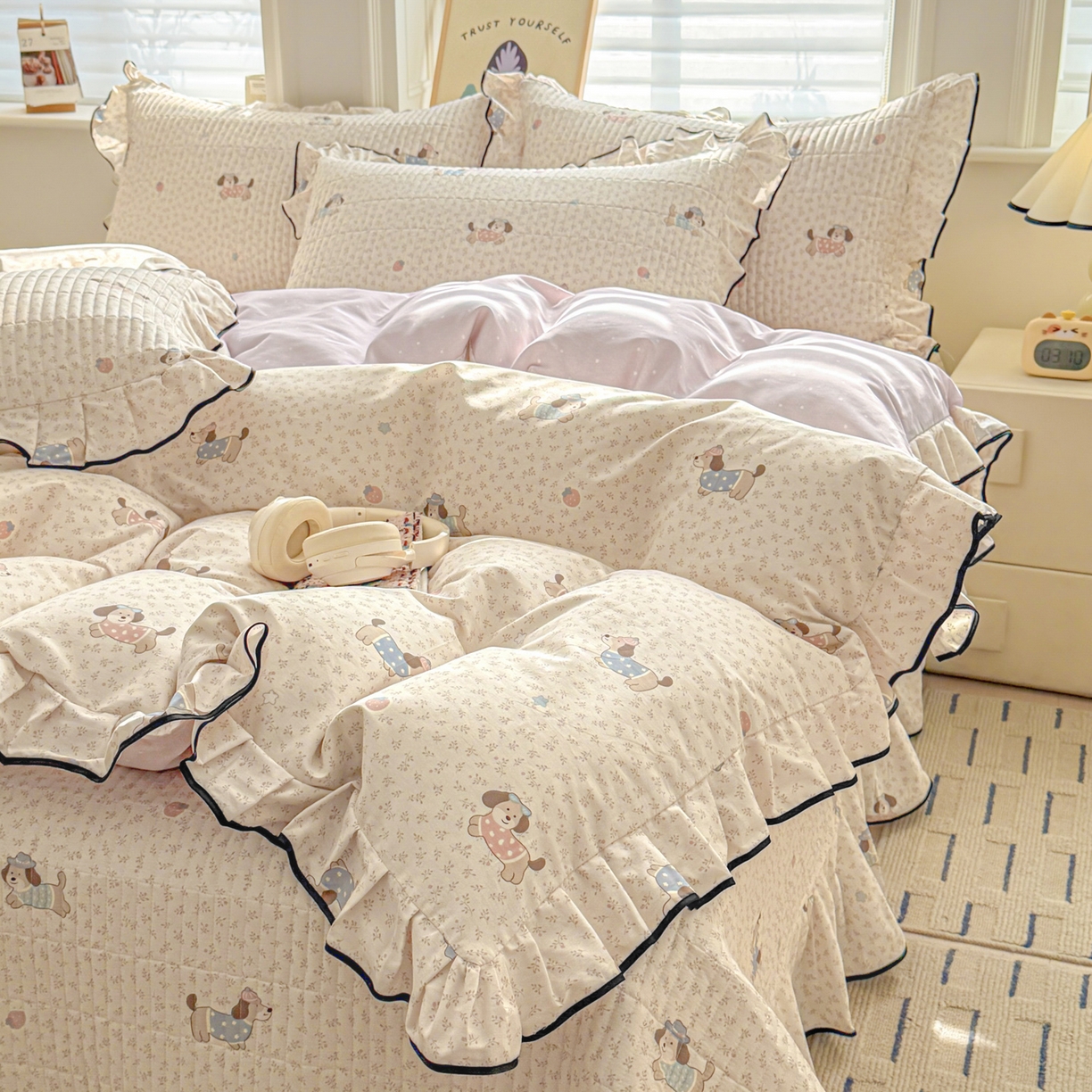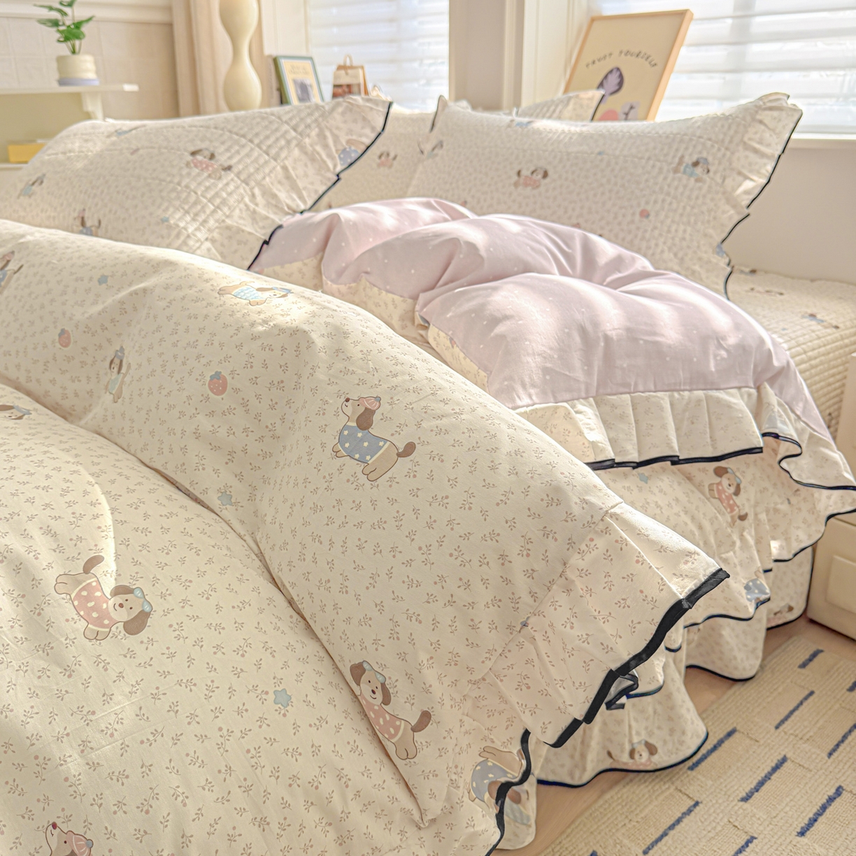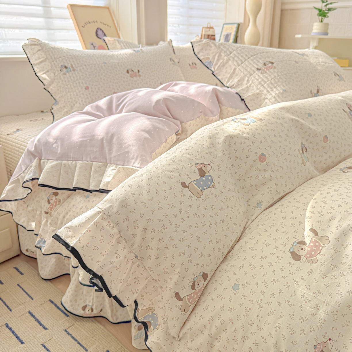 > 莱登卡奴 2026新款全棉A类小清新花边床盖款系列四件套 草莓腊肠狗