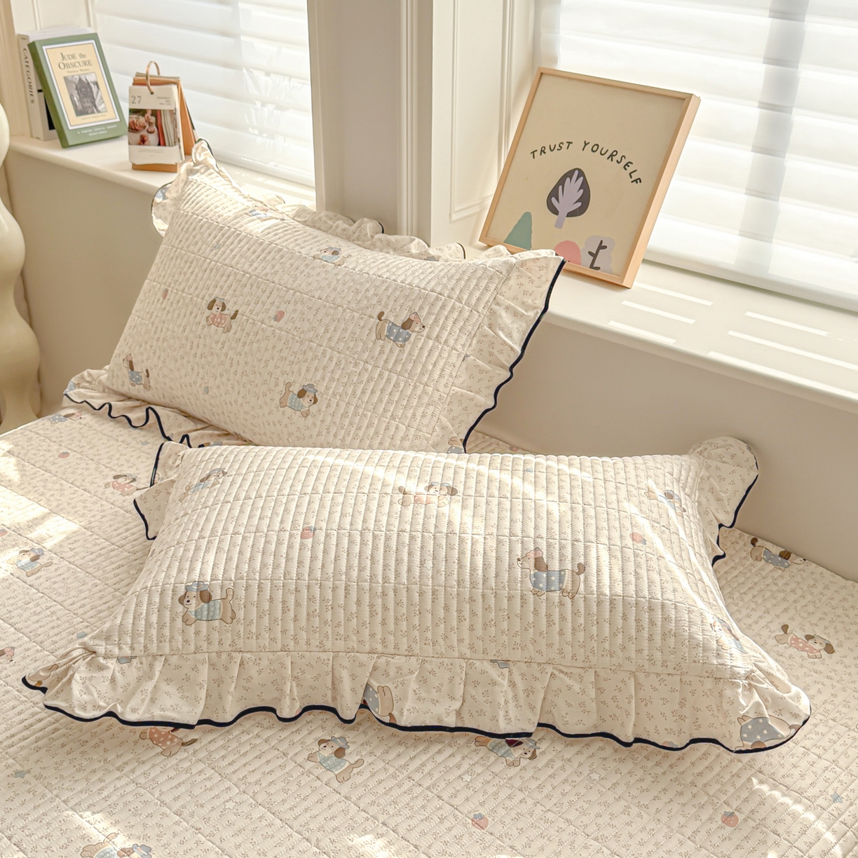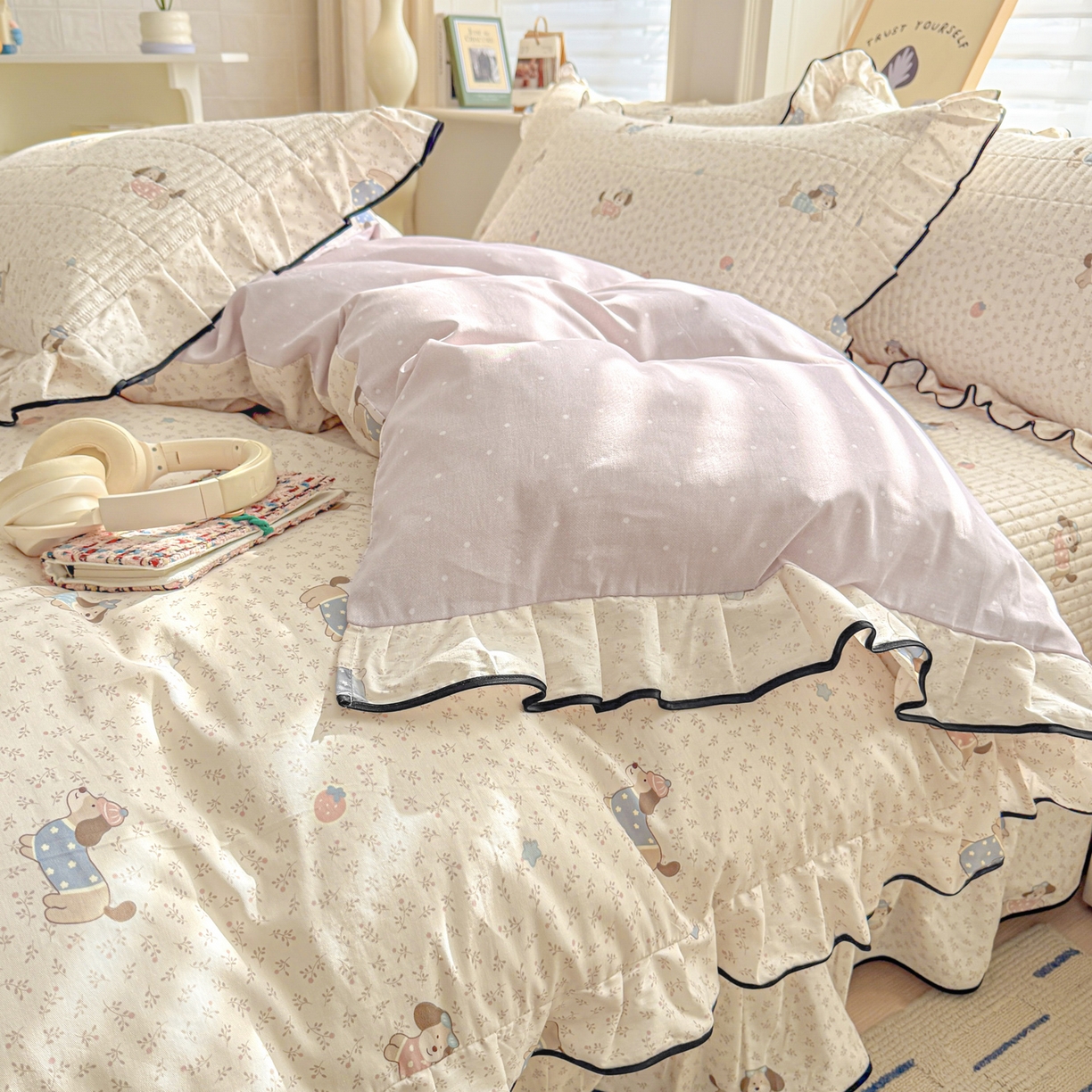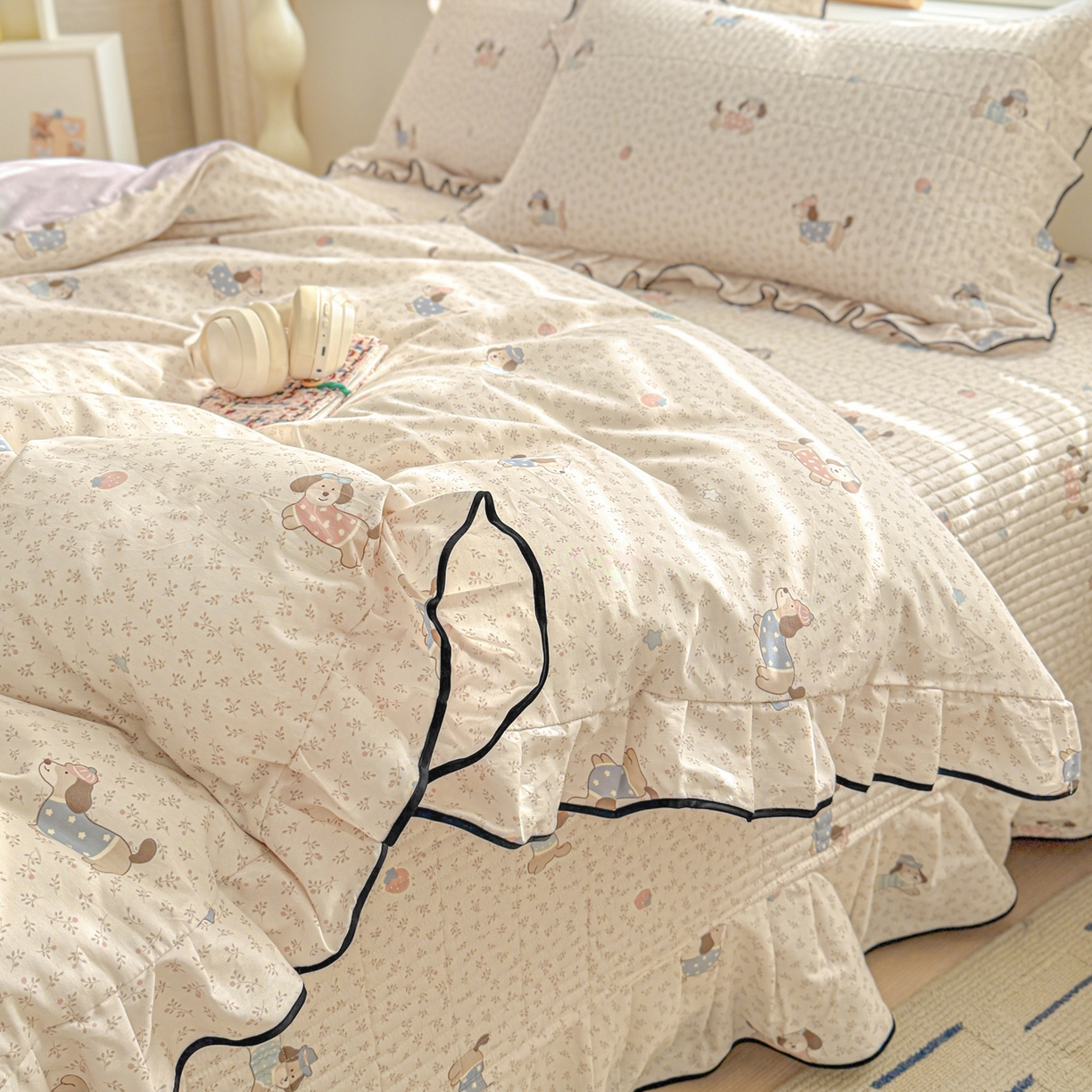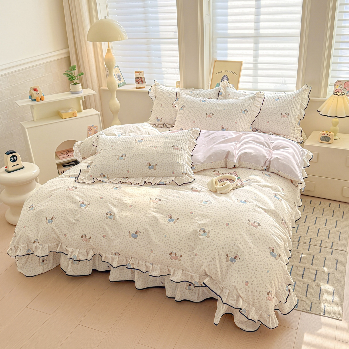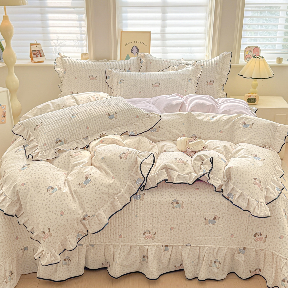 > 莱登卡奴 2026新款全棉A类小清新花边床盖款系列四件套 草莓腊肠狗