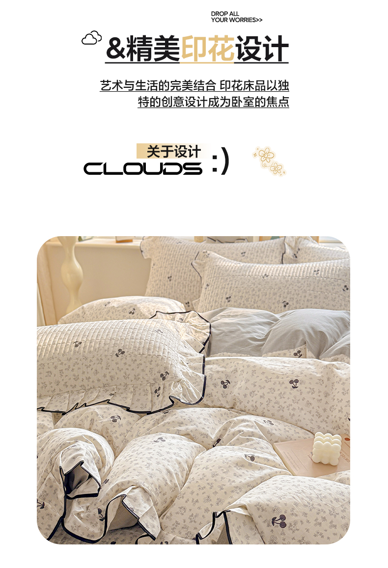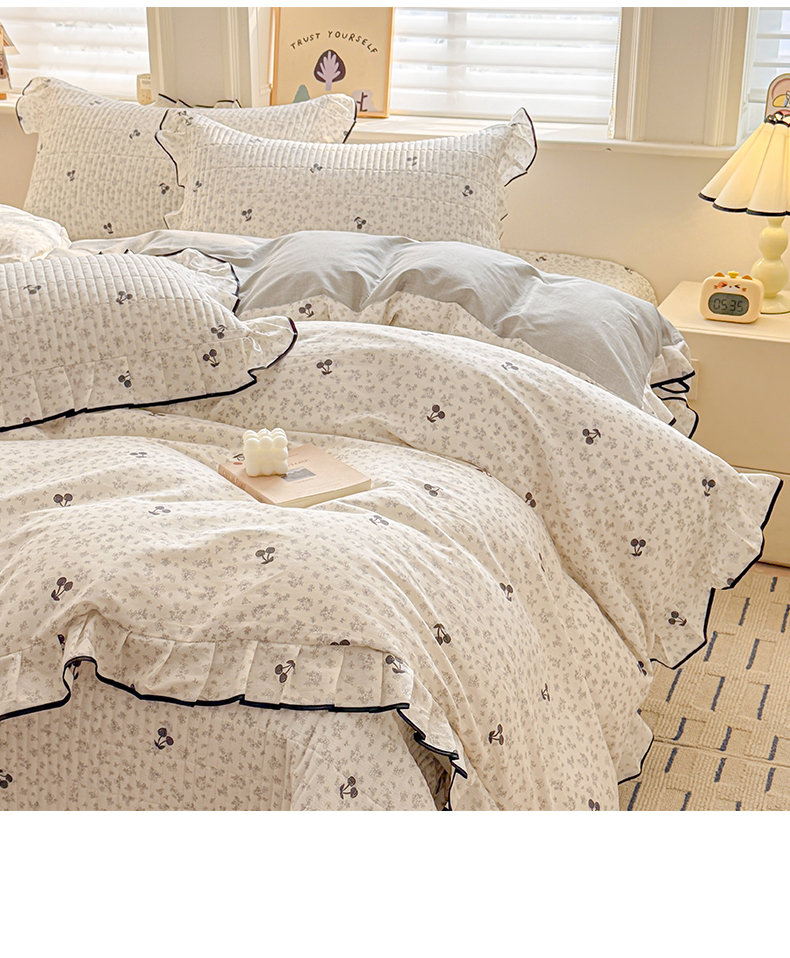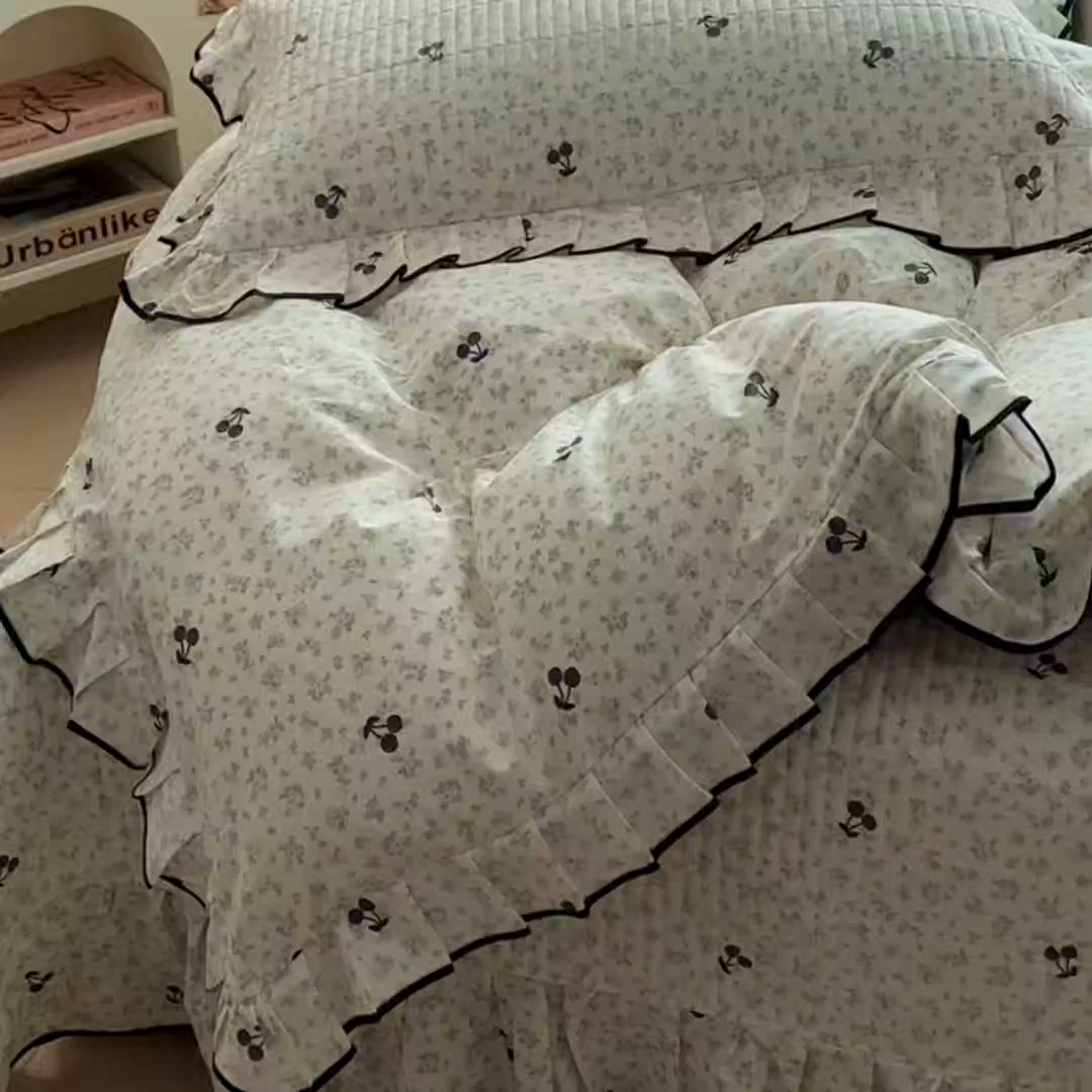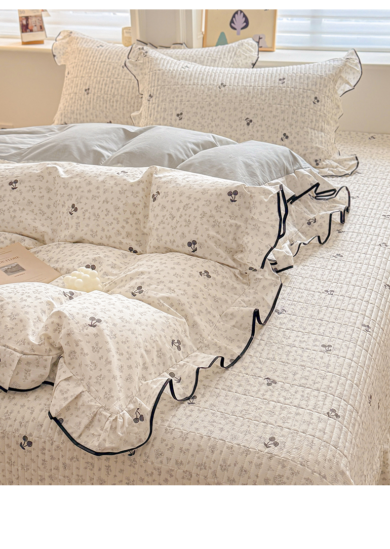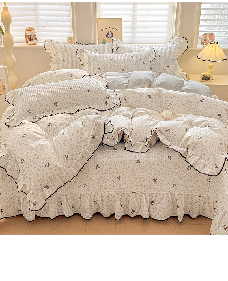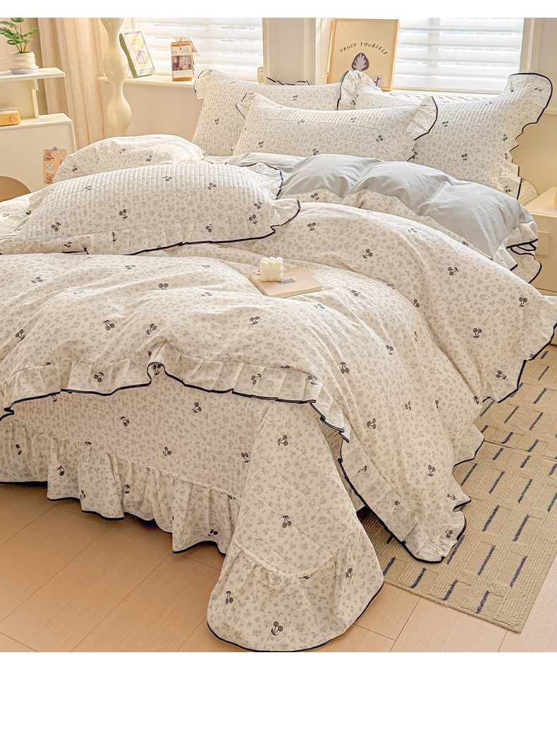 > 莱登卡奴 2026新款全棉A类小清新花边床盖款系列四件套 墨兰樱桃