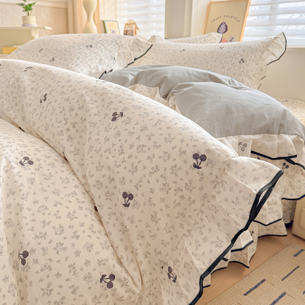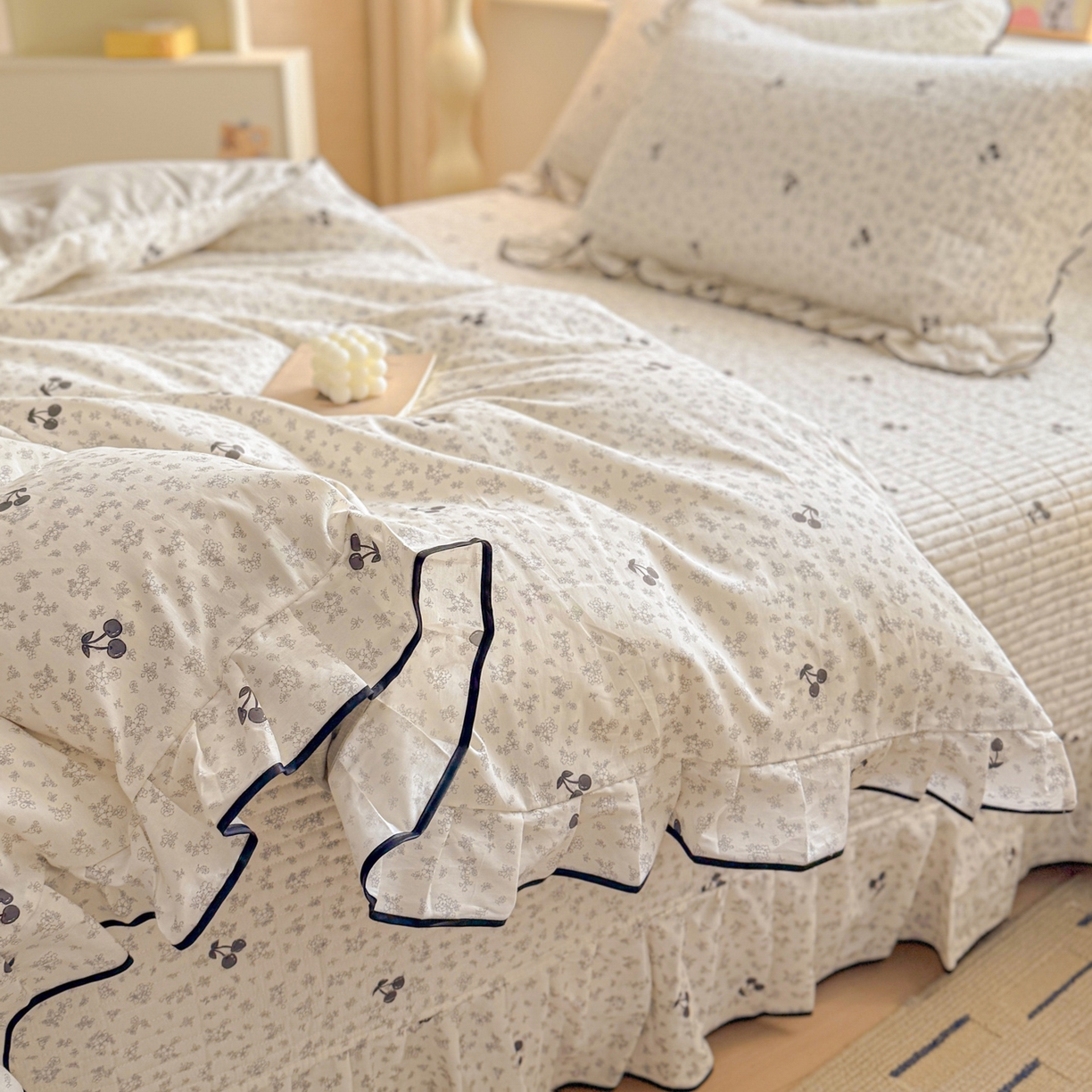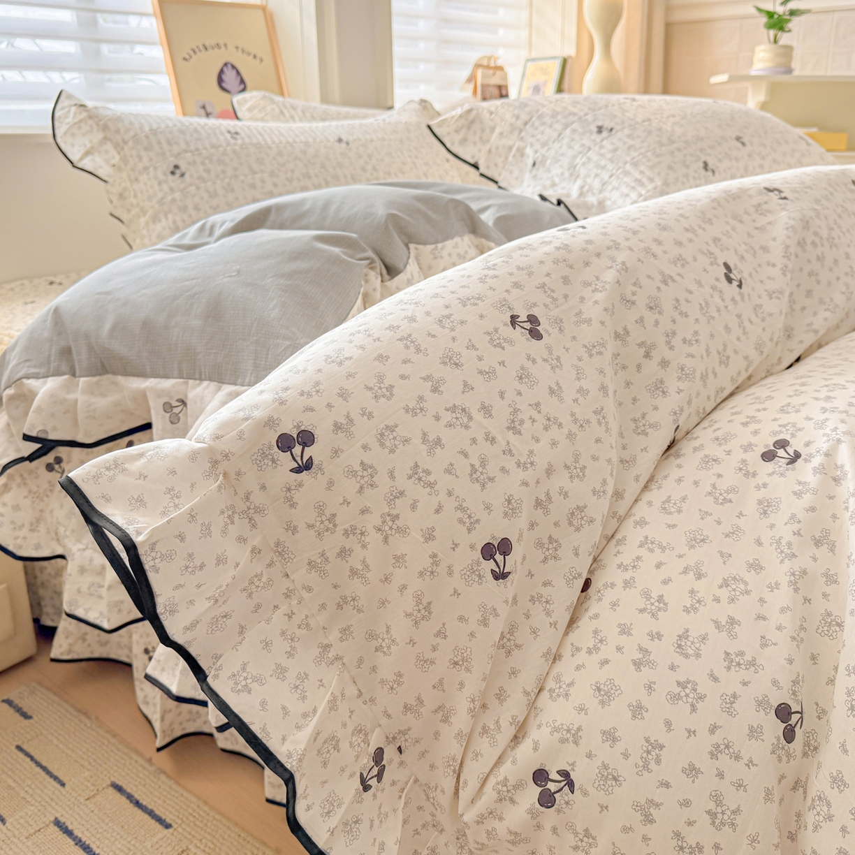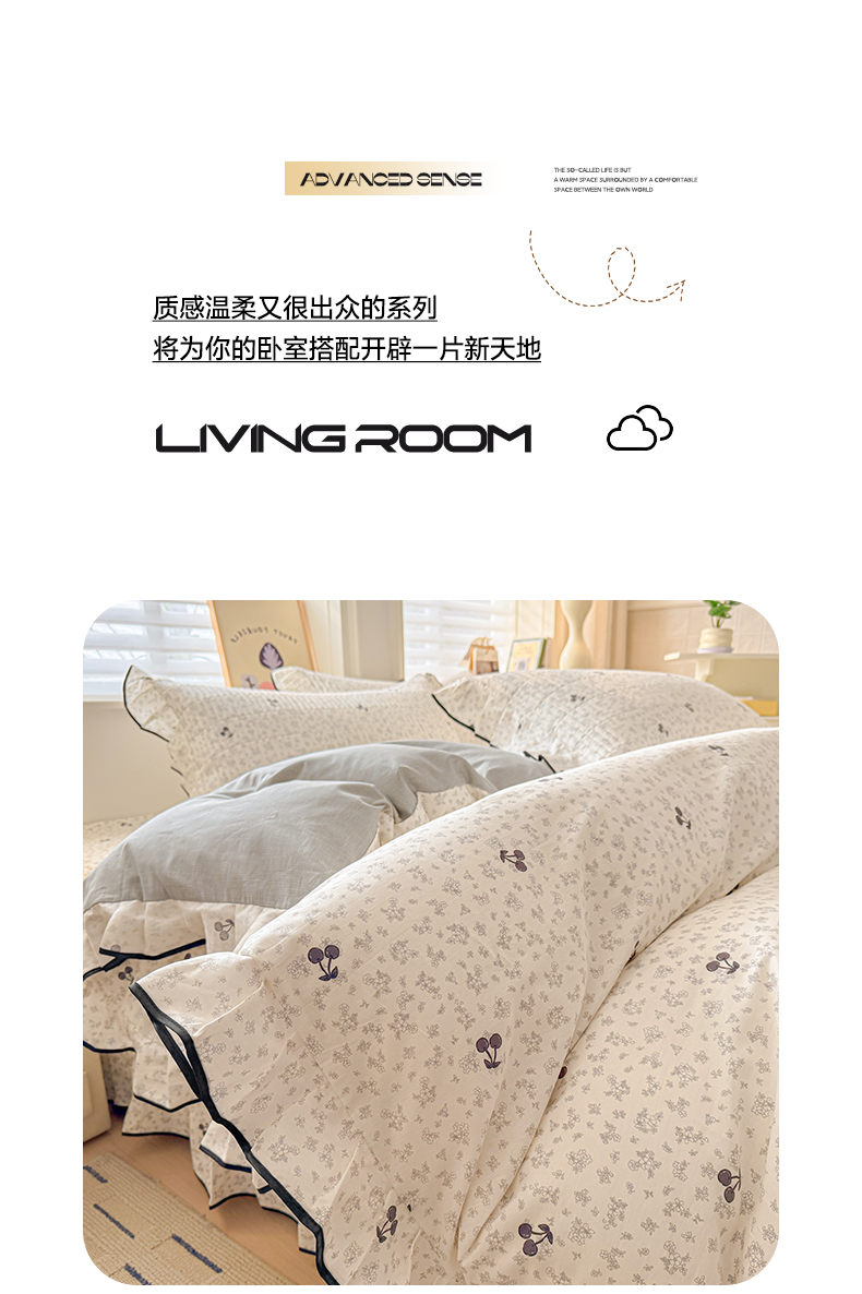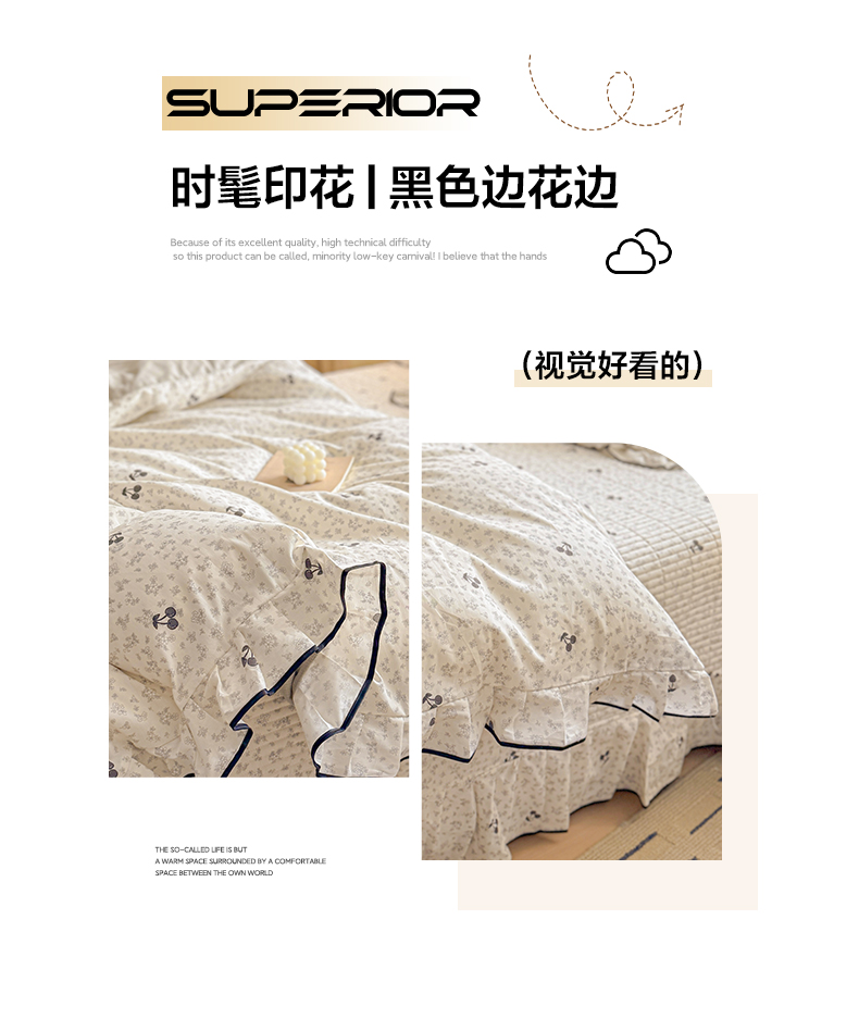 > 莱登卡奴 2026新款全棉A类小清新花边床盖款系列四件套 墨兰樱桃