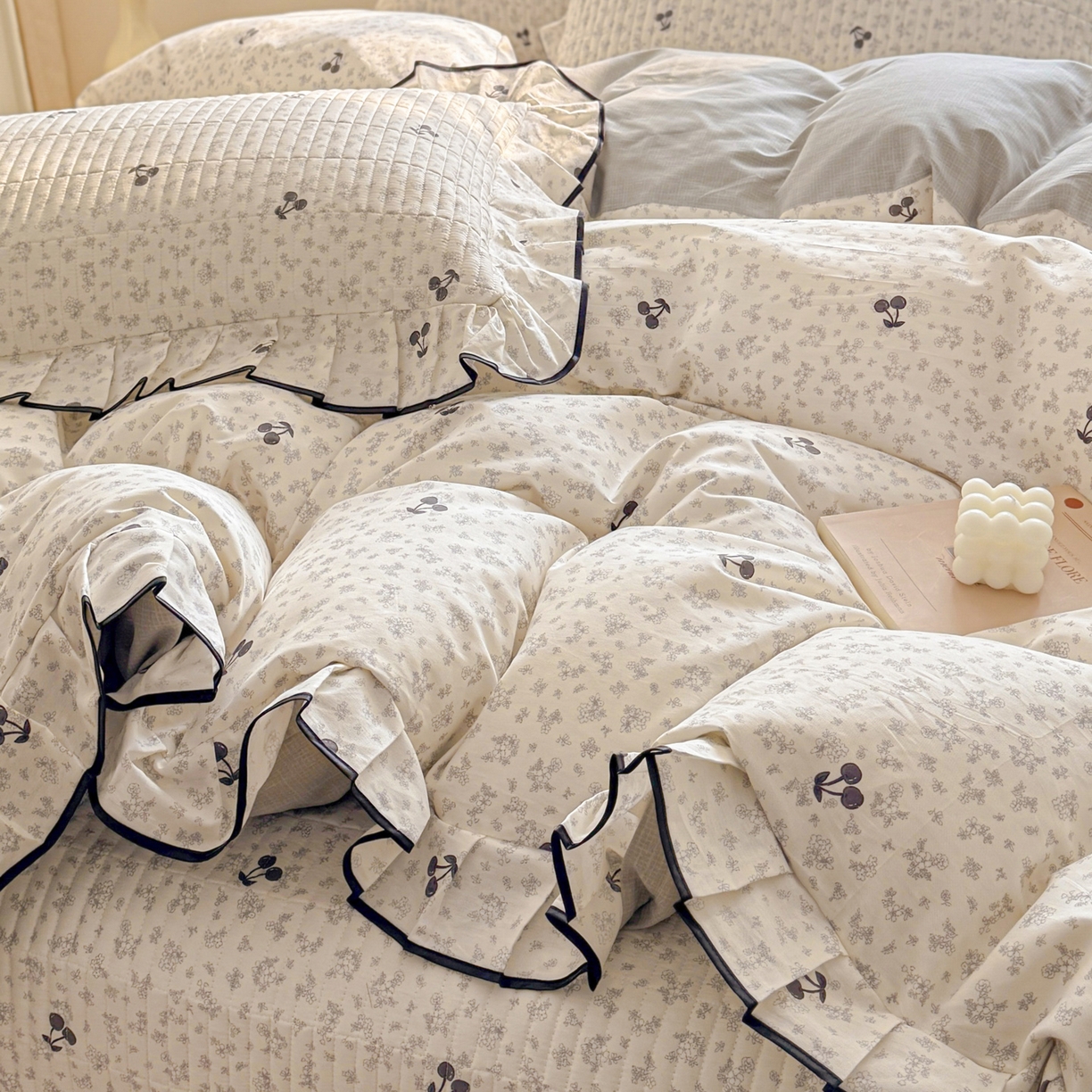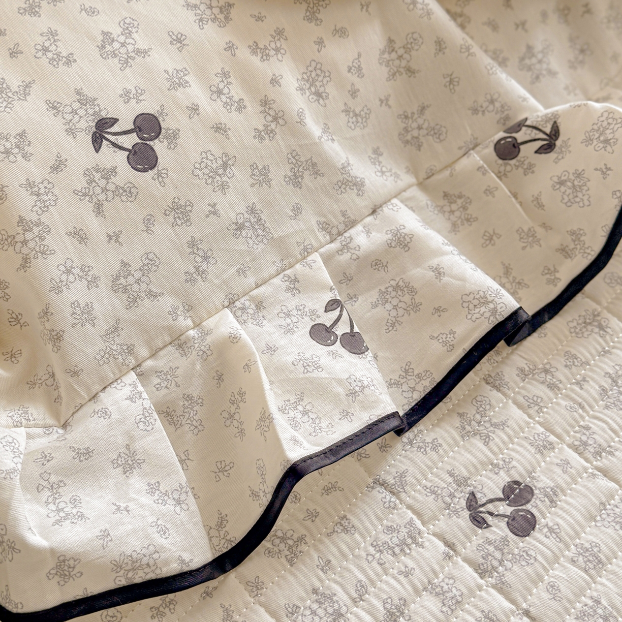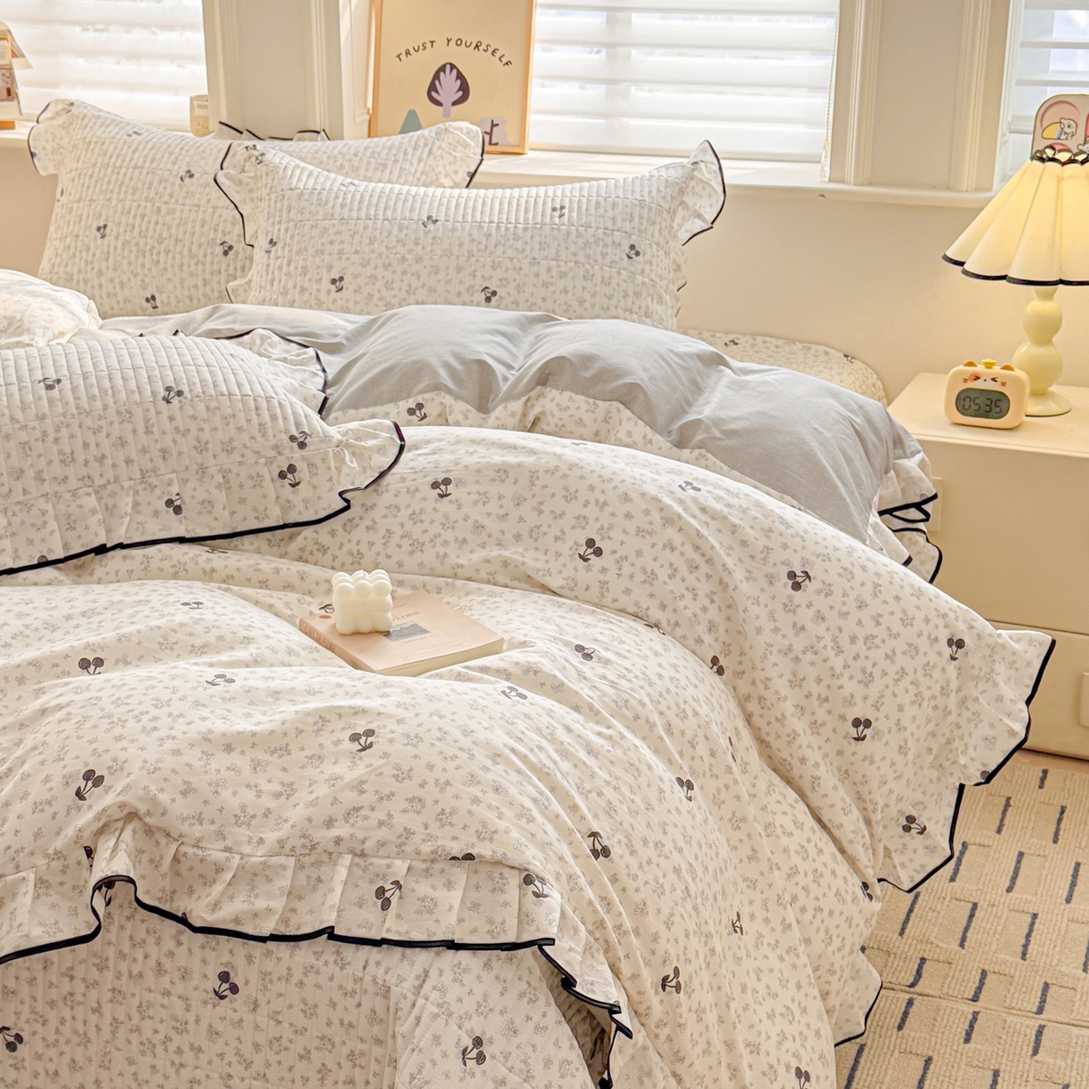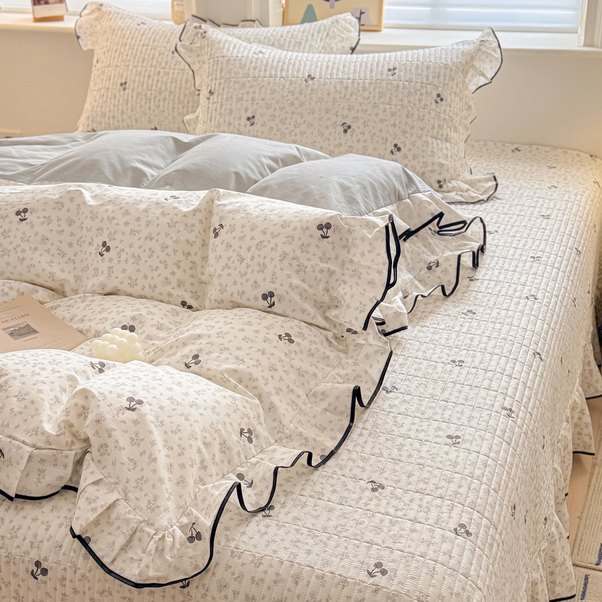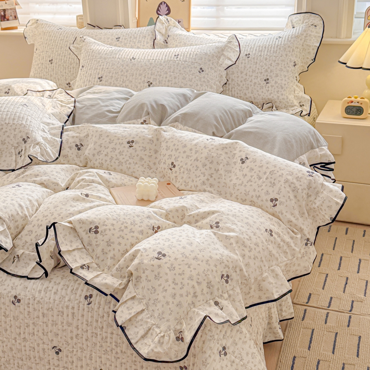 > 莱登卡奴 2026新款全棉A类小清新花边床盖款系列四件套 墨兰樱桃