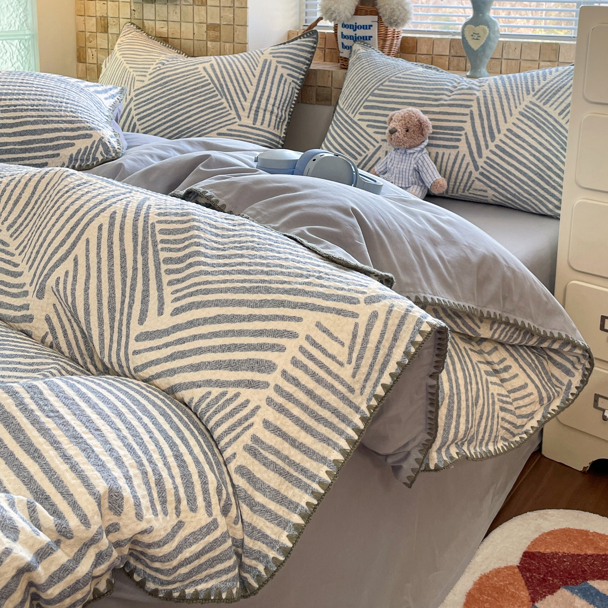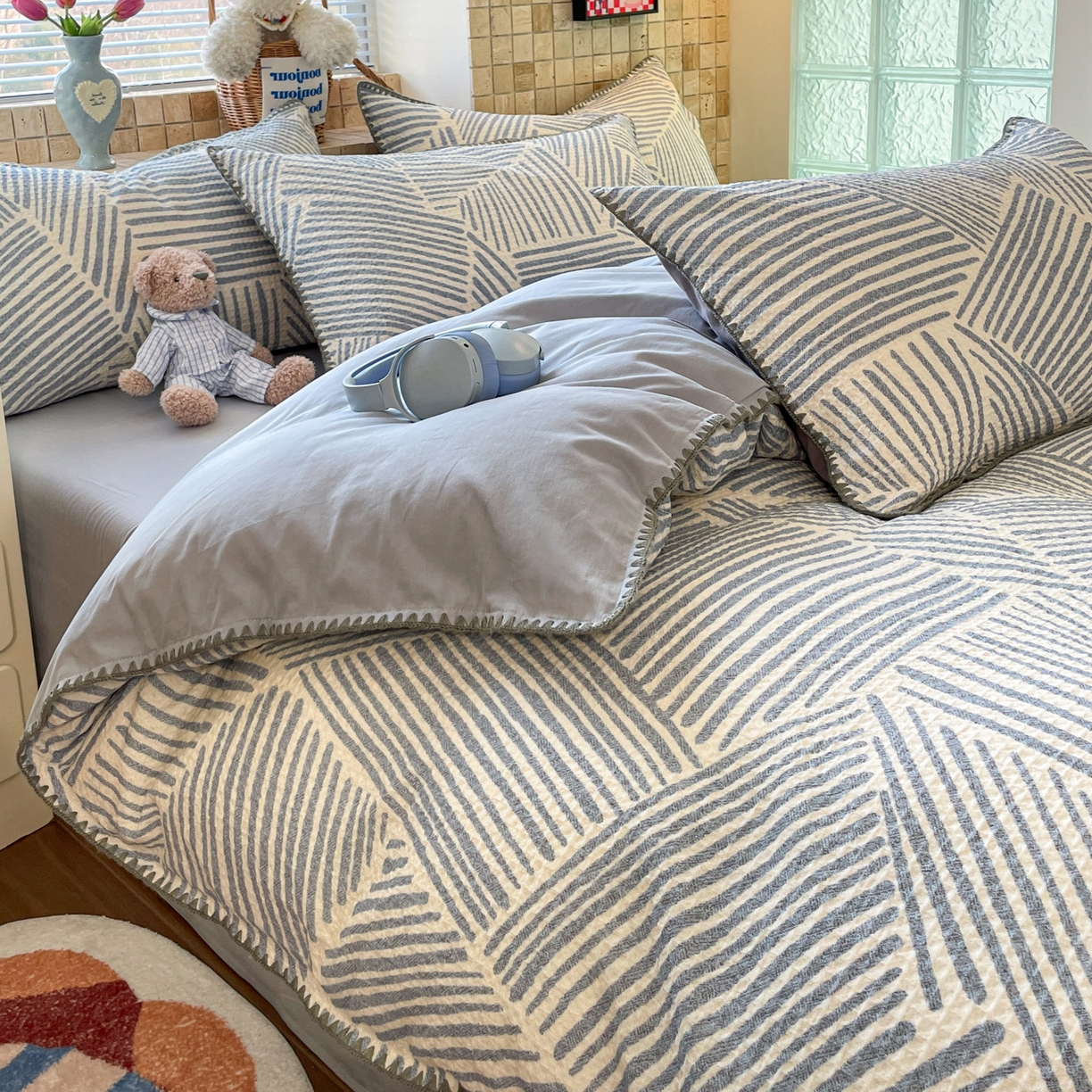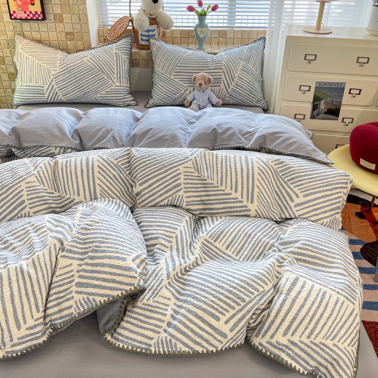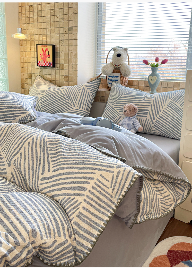 2025新款A类全棉色织水洗棉贝壳绣条纹系列四件套