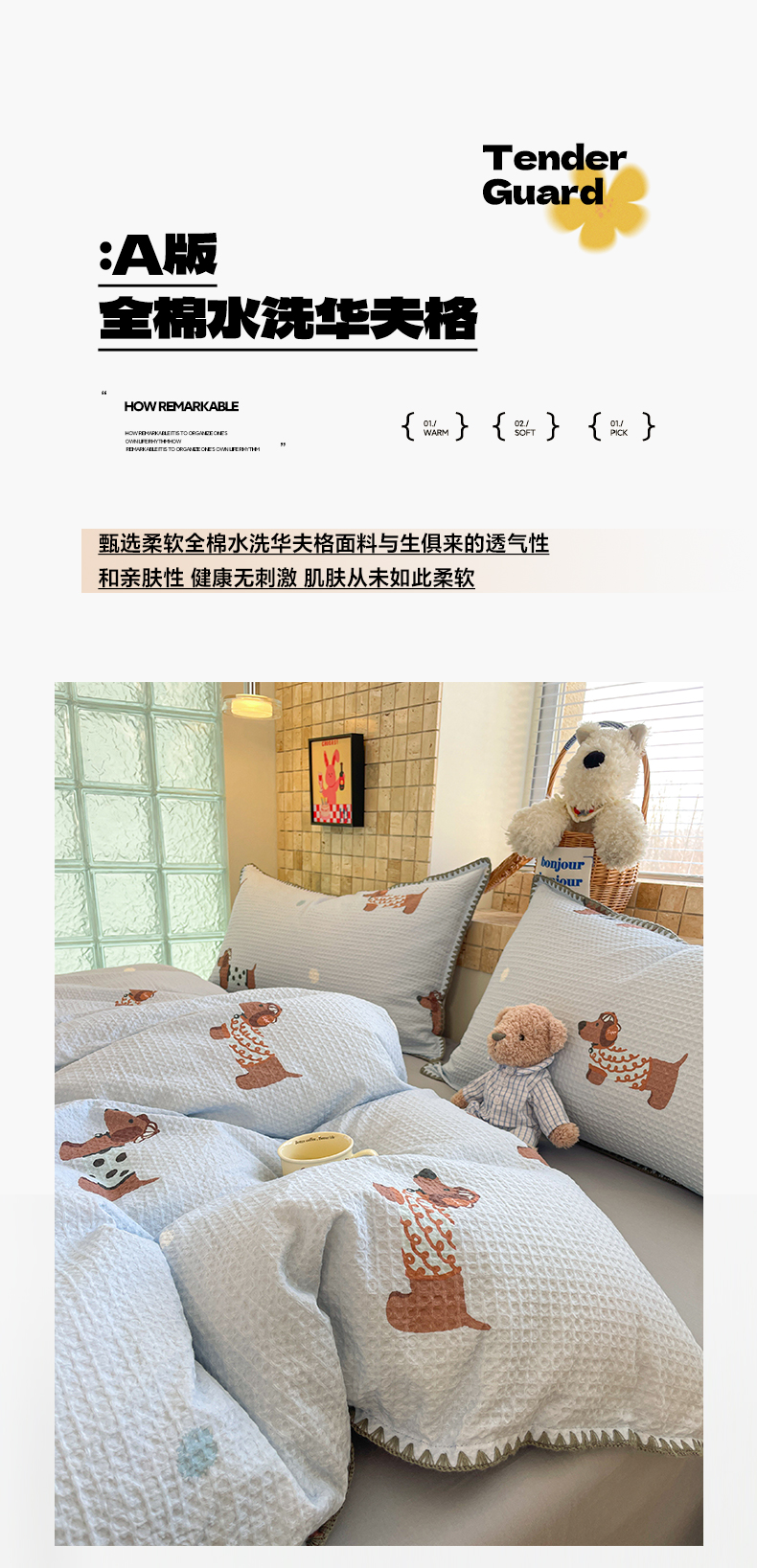 2026新款A类全棉纯棉水洗华夫格贝壳绣四件套