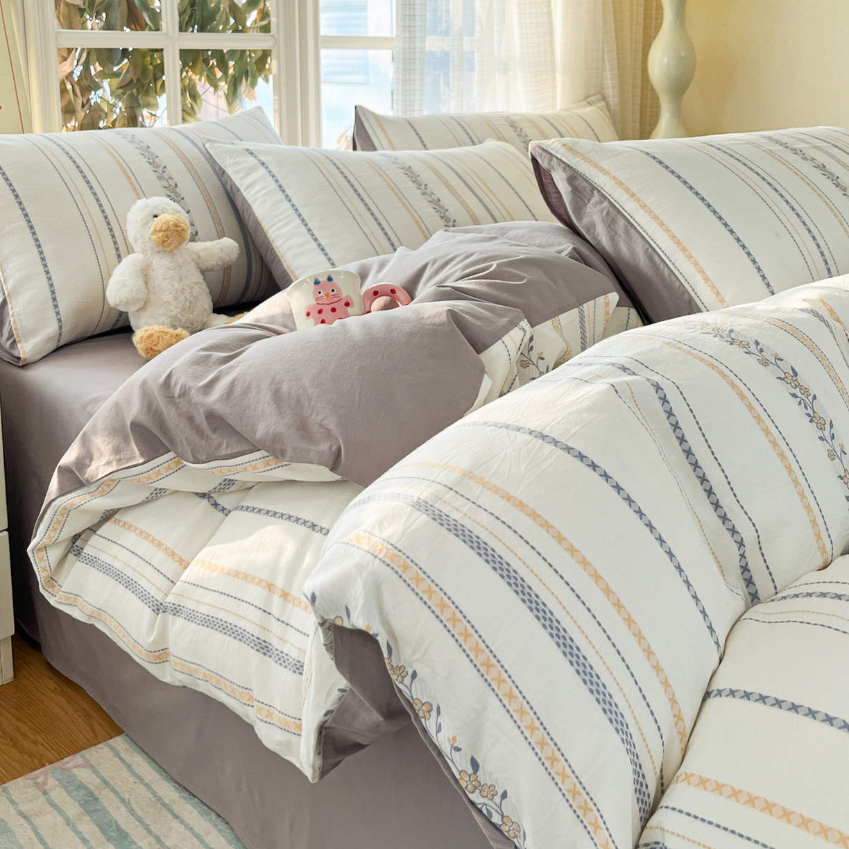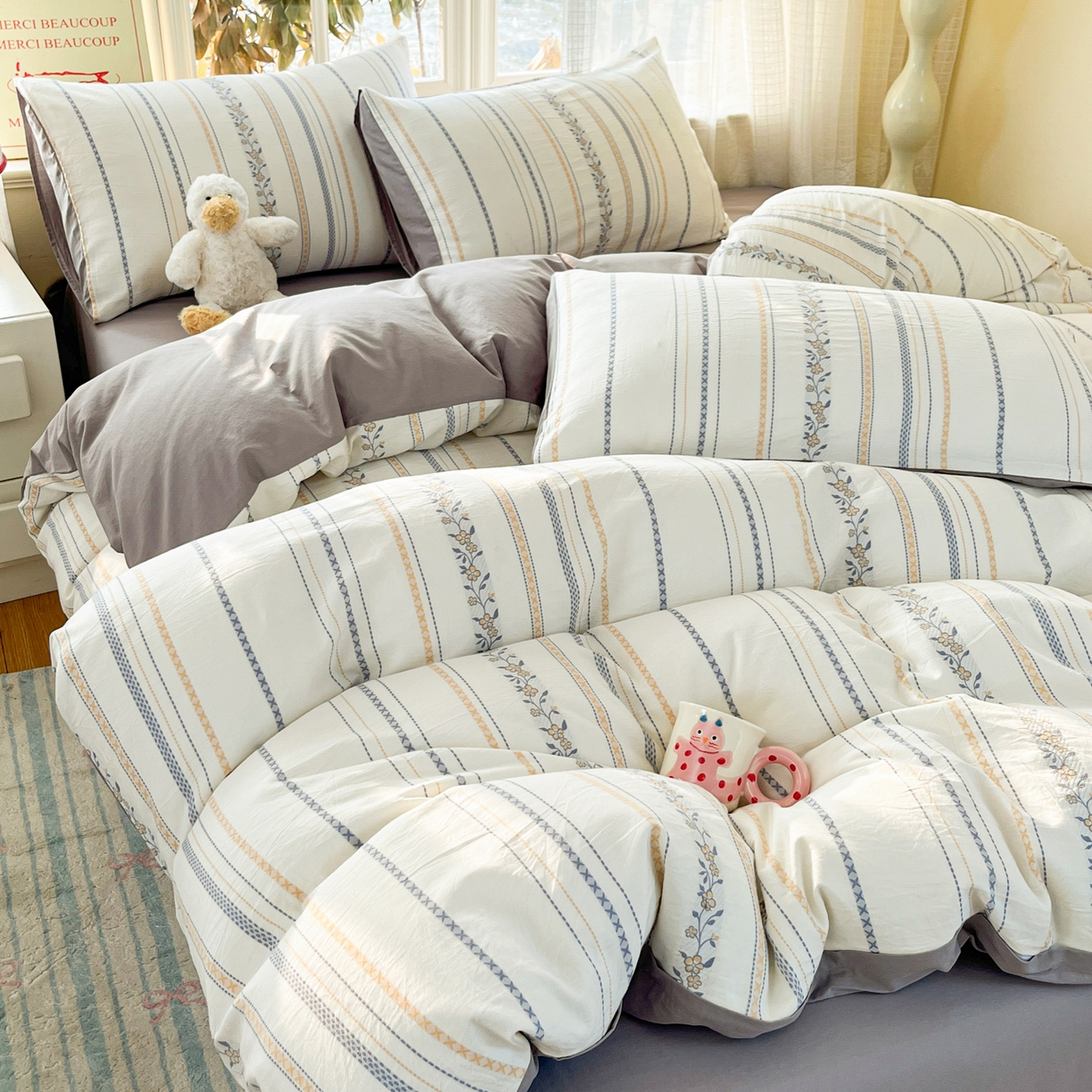 > 莱登卡奴 2026新款全棉纯棉A类水洗棉色织提花剪花系列四件套 曼莉暖灰